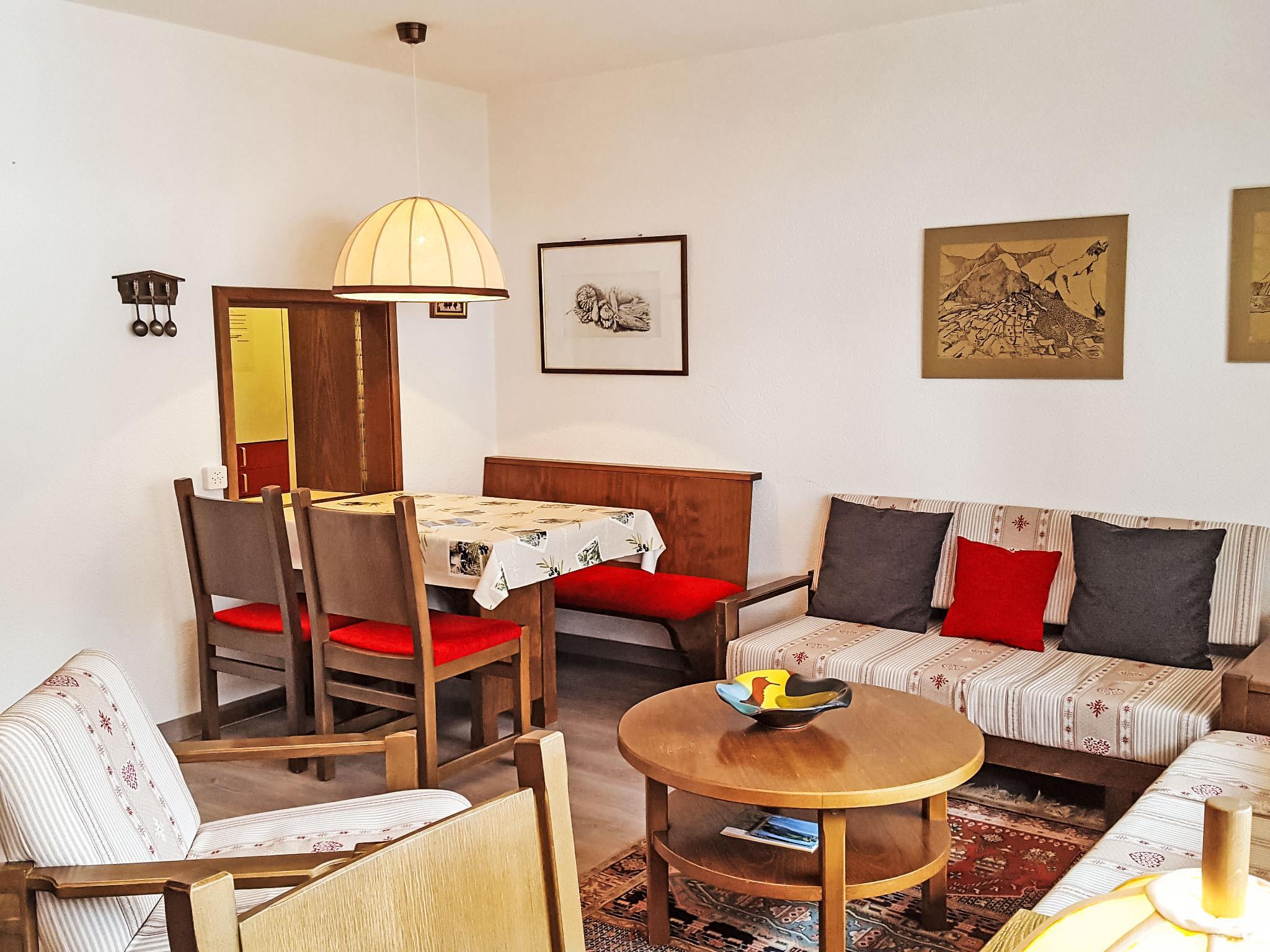 1-Zimmer-Wohnung 54 m2 im 1. Stock. Zweckmässig eingerichtet: Wohn-/Esszimmer mit 2 Wandschrankbetten und Kabel-TV (Flachbildschirm). Ausgang zum Balkon. Schlafnische mit Vorhang mit 2 Betten. Küche (4 Glaskeramikplatten, Mikrowelle, elektrische Kaffeemaschine, Kapseln für die Kaffeemaschine (Nespresso) extra). Bad/WC. Balkon. Terrassenmöbel. Sicht auf die Berge, das Tal und die Landschaft. Zur Verfügung: Internet (Wireless LAN, gratis). Bitte beachten: Nichtraucher-Unterkunft. Anstelle eines abgeschlossenen Schlafzimmers befinden sich manche Schlafplätze in einem offenen Bereich (Galerie, Nische etc.).