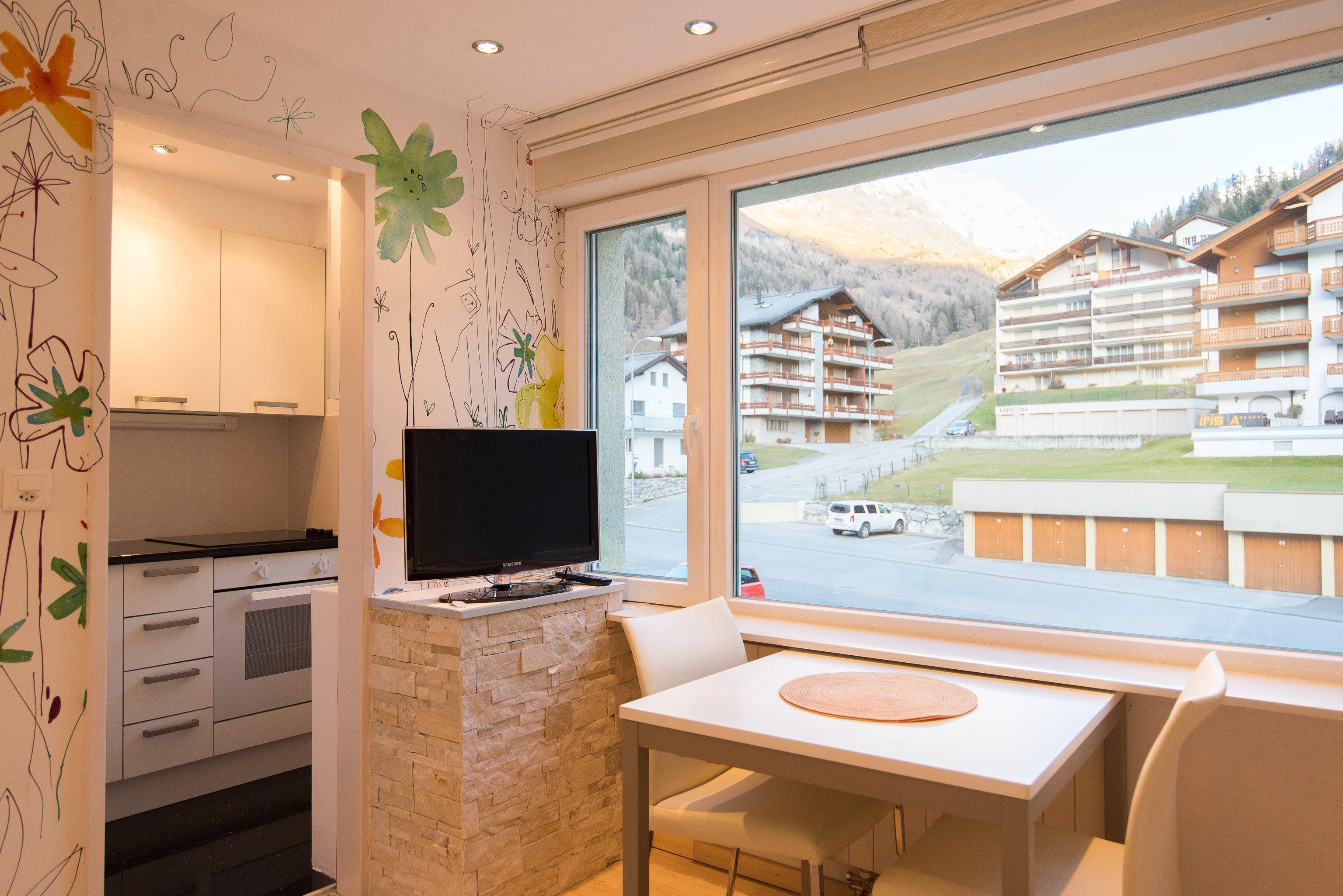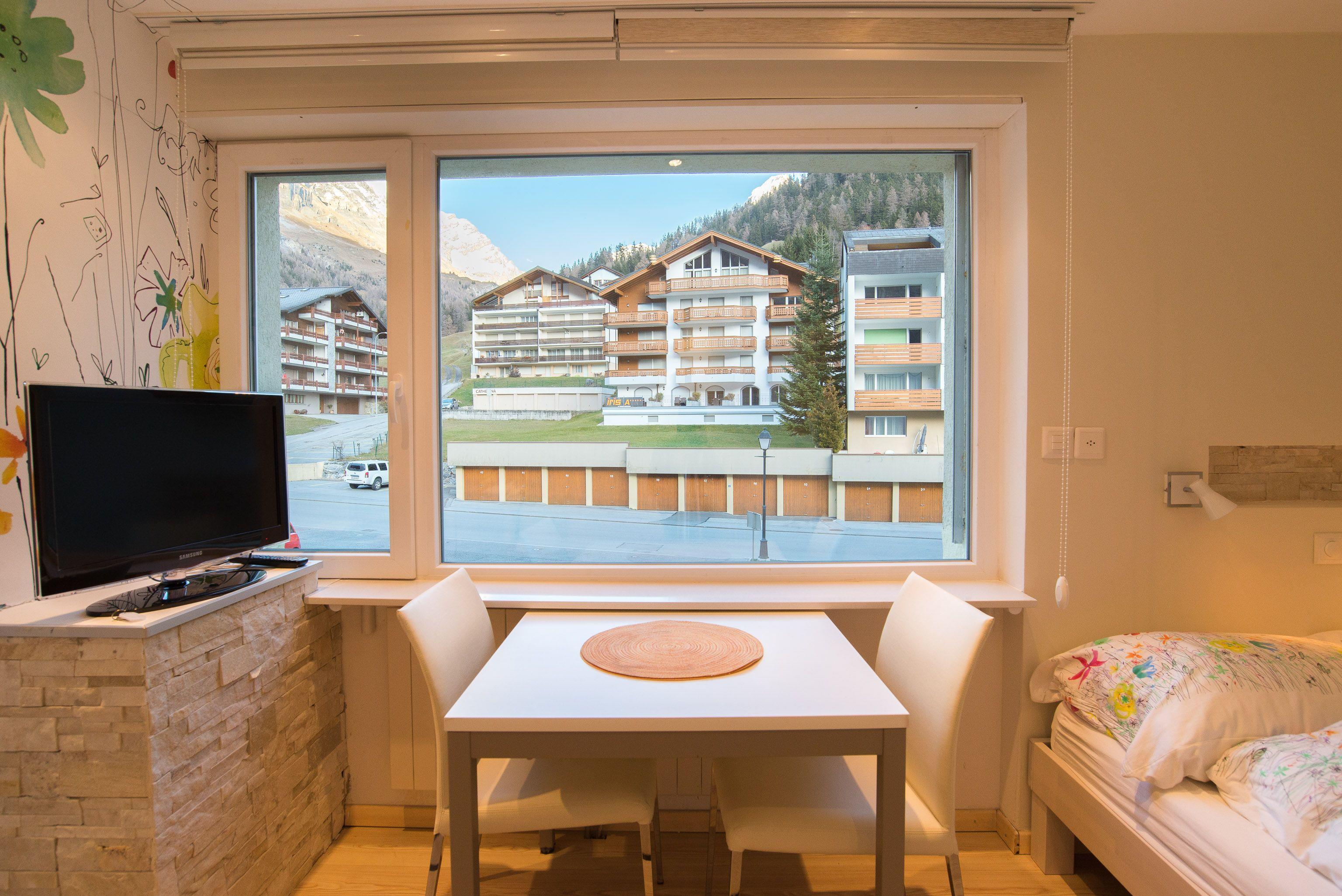 Panoramasicht auf Leukerbad und die umliegende Bergwelt. Alle Wohnungen (ausser: kleines Studio) mit grossem und sonnigem Balkon.