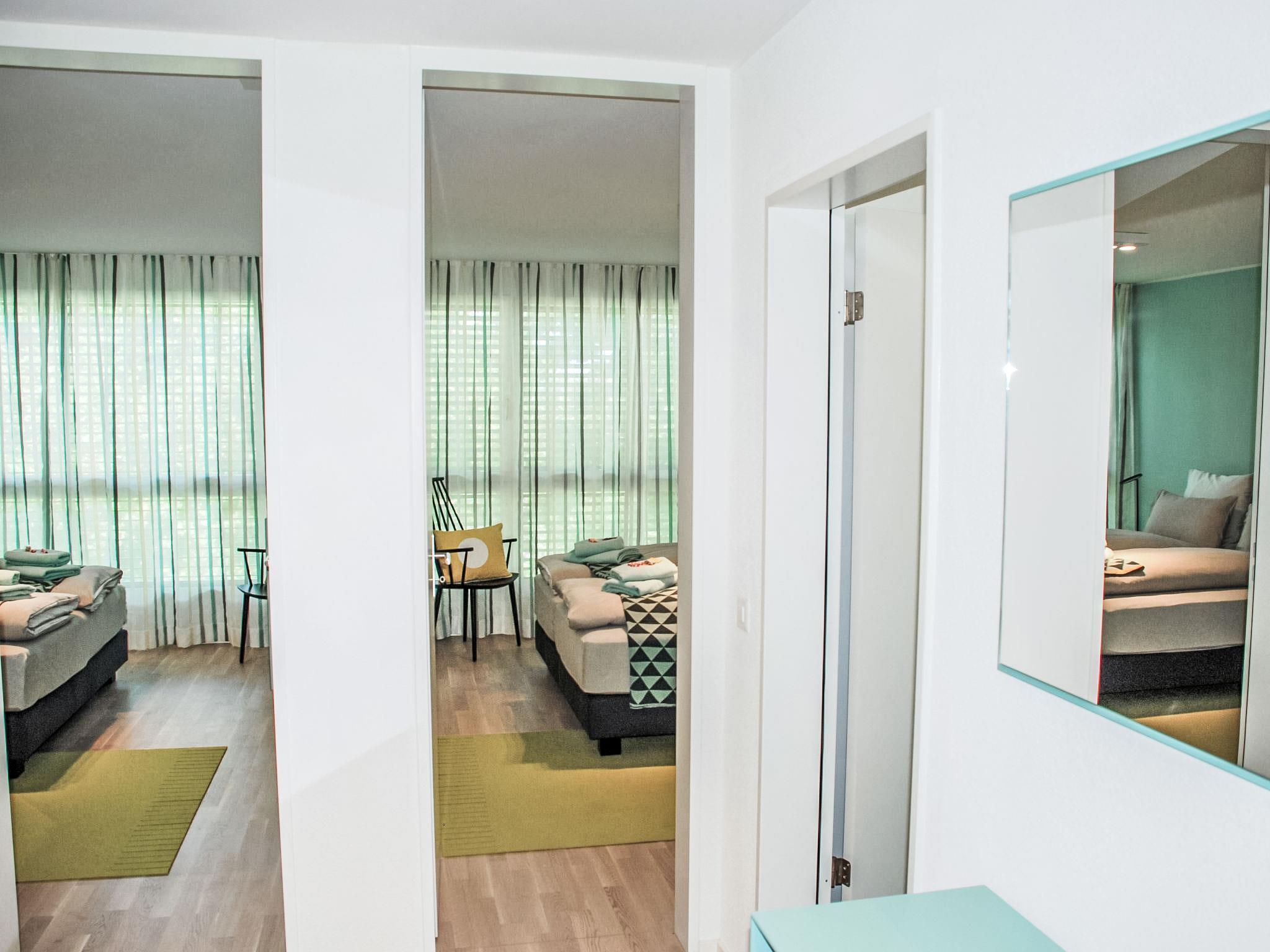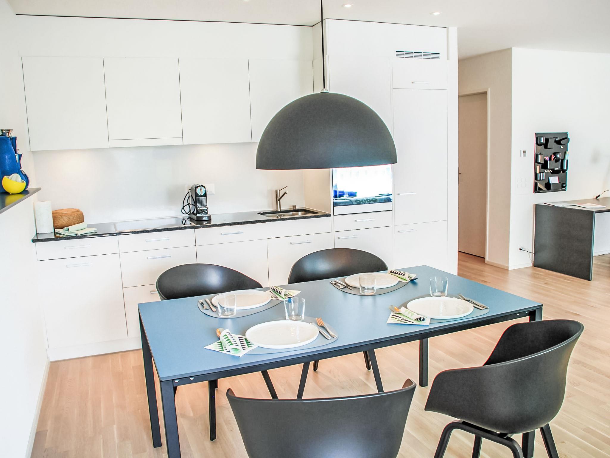 "LaVille A-4-3", 3-Zimmer-Wohnung 89 m2 im 4. Stock, Südwestlage. Geräumig und hell, modern und geschmackvoll eingerichtet: offenes grosses Wohn-/Esszimmer mit Sat-TV und Flachbildschirm. 1 Doppelzimmer mit 1 Doppelbett (2 x 90 cm, Länge 200 cm). 1 Zimmer mit 2 Betten (90 cm, Länge 200 cm). Offene Küche (Backofen, Geschirrspüler, 4 Induktionskochplatten, Tiefkühler, elektrische Kaffeemaschine, Kapseln für die Kaffeemaschine (Nespresso) extra) mit Esstisch. Ausgang zum Balkon. Bad/WC, Dusche/WC. Bodenheizung. Balkon 9 m2, Südlage und Westlage. Balkonmöbel, Liegestühle (1). Sicht auf die Berge und die Landschaft. Zur Verfügung: Waschmaschine, Wäschetrockner, Bügeleisen, Kinderhochstuhl, Babybett bis 2 Jahre (extra), Haartrockner. Internet (WLAN, gratis). Parkplatz Nr. 51 (extra), Höhe 210 cm, Breite 230 cm. Bitte beachten: Nichtraucher-Unterkunft. NL-00006857