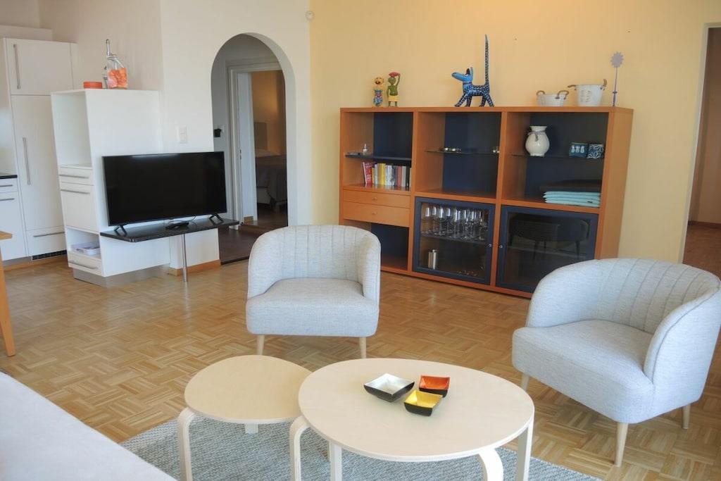 • 3.5 Zimmer Wohnung, 85 m2 • 4 Personen • Moderne, neuwertige Innenausstattung • Sonnige Hanglage mit 180° Panoramablick • Balkon mit Sonnenstoren, Sitzmöbel und Beistelltisch • Wohnzimmer mit Sofagarnitur, Salontisch, 2 Sessel • Esstisch mit 4 Stühlen • Flachbildschirm, Digital-TV • Internet (WLAN) • Komplett eingerichtete offene Küche • Ceranfeld Kochherd, Backofen, Geschirrspüler • Nespresso Kaffeemaschine (bitte Kapseln mitbringen) • Wasserkocher, Toaster • 1 Schlafzimmer mit Doppelbett (2 Matratzen), Kleiderschrank, Ventilator • 1 Schlafzimmer mit Boxspringbett 180 cm, Kleiderstange und Kommode • 1 Badezimmer mit Dusche/WC, Lavabo, Haarfön • Verdunkelung durch Fensterläden und Vorhänge • Aussensitzplatz mit Steintisch und kleiner Rasenfläche, 2 Liegestühle • beheizbarer Whirlpool zur alleinigen Benützung . • Haustiere nicht erlaubt • Nichtraucher, bitte nur im Aussenbereich rauchen • Zentralheizung • Waschmaschine und Tumbler im Kellerraum zur gemeinsamen Benützung Öffentlicher Parkplatz beim Zugang zum Haus (insgesamt 18 Parkplätze) Erfahrungsgemäss sind immer Parkplätze verfügbar, da alle umliegenden Anwohner über eigene Parkplätze verfügen. Tagestarif Werktags CHF 3.00 (Park and Pay)