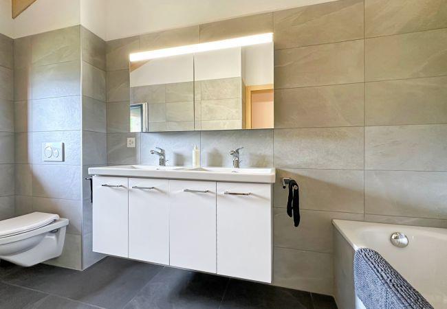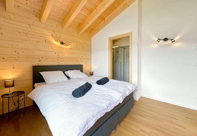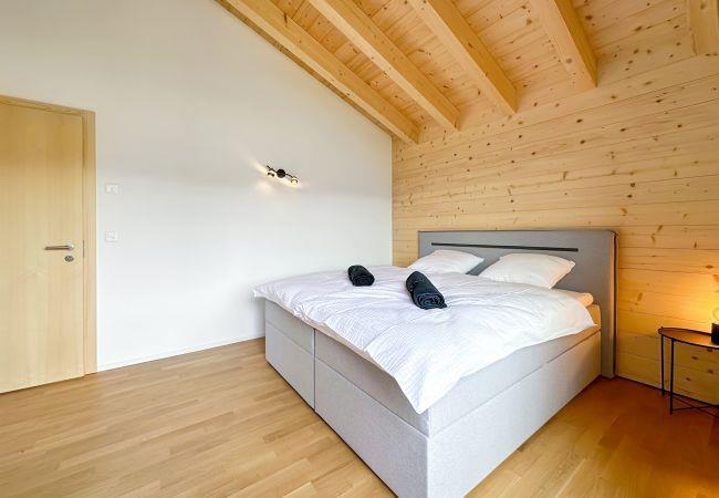 Oben: ein großes Hauptschlafzimmer, ausgestattet mit einem Boxpsing-Doppelbett, mit en-suite Badezimmer mit Dusche und WC. Zwei weitere Schlafzimmer sind ebenfalls mit Boxspring-Doppelbetten ausgestattet.