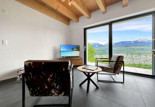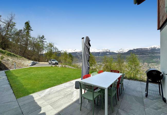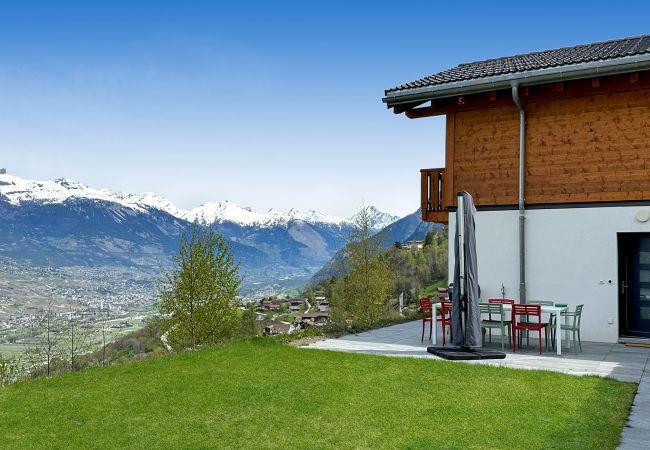 Eingebettet in üppiges Grün genießt es einen Panoramablick auf die Rhône-Ebene und die Berner Alpen.