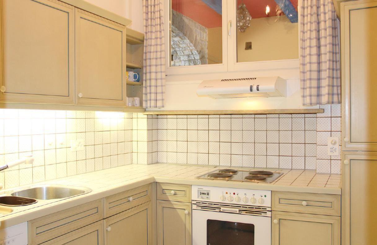 Küche "Bulthaup" im Landhausstil mit Arbeitsfläche in handgefertigten franz. Fliesen und 4-Platten Herd mit Edelstahl-Ueberkochmulde, Backofen, Kühl- und Tiefkühlschrank, Geschirrspüler, Dunstabzug, Fissler-Grill für Innen- u. Aussenbenutzung, Mikrowelle mit Grill, Fenster.