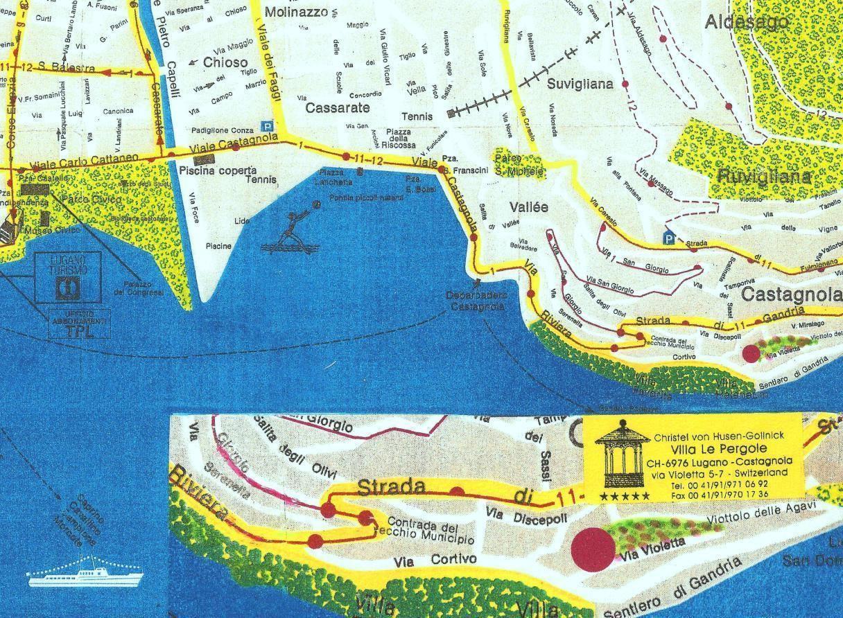 Zum: See mit komunalem Boots- und Badesteg 130 m + Treppen- stufen, Kursschiff bei Villa Heleneum 250 m, Bus 70- 400 m, Restaurants 300 m, Lebensmittelgeschaefte 1,4 km, "Monte Bré- Bergbahn 1,2 km, Lugano-Zentrum 2,5 km. Romantischer Fussweg am See entlang zum sehenswerten Fischerdorf "Gandria" vorbeiführend nach 600 m beim Lido "San Domenico" direkt erreichbar von via Violetta und/oder antikem Olivenfussweg. Gemeinde-Kinder-Spielplatz in 200 m im antiken Nukleo von Castagnola. Residenz vom Eigentuemer gefuehrt, der vor Ort wohnt. Nichtraucher-Wohnungen.