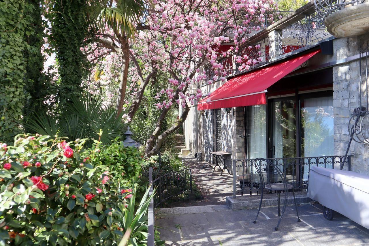 Eingang von aussen -- mit Terrassen/Balkonen für 1-8 Personen befindet sich im exklusiven Bezirk von Lugano-Castagnola am Fusse des "Monte Bre" der meist besonnte Berg der Schweiz). Die aussergewöhliche Residenz thront über einem terrassierten mediterranen Baumgarten (naturnah) mit Palmen zwischen privater Sackgasse Via Violetta und antikem Oliven-Fussweg von Lugano-Castagnola zum sehenswerten Fischerdorf "Gandria" (1,3 km) gelegen.