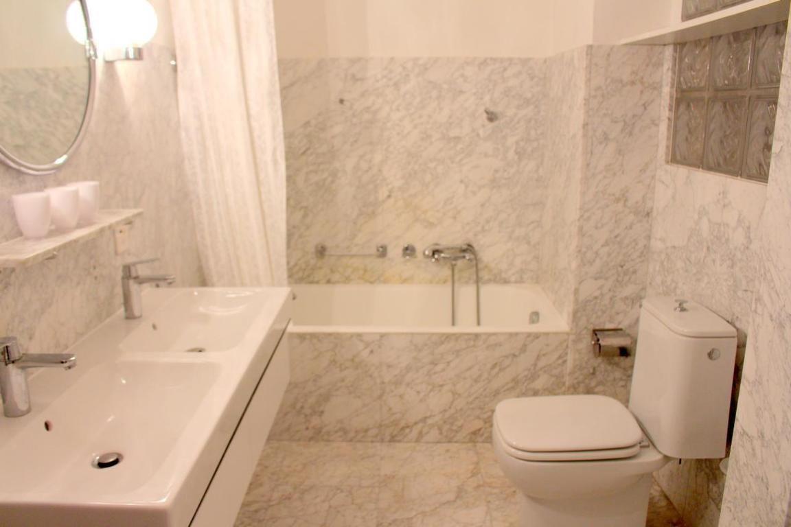 - Marmor-Badezimmer: Badewanne mit Duschenvorhang, Doppelwaschbecken, WC, Bidet,