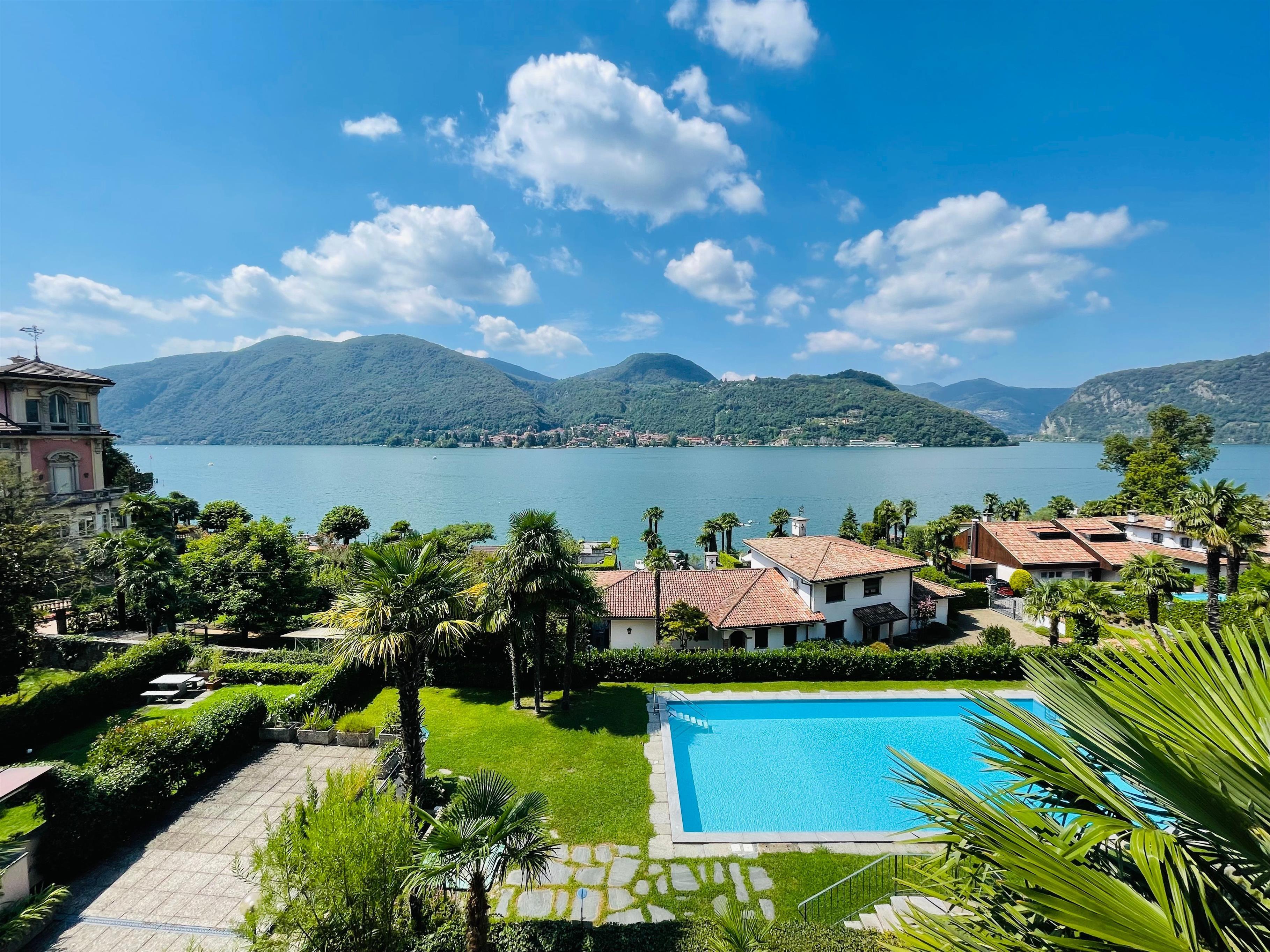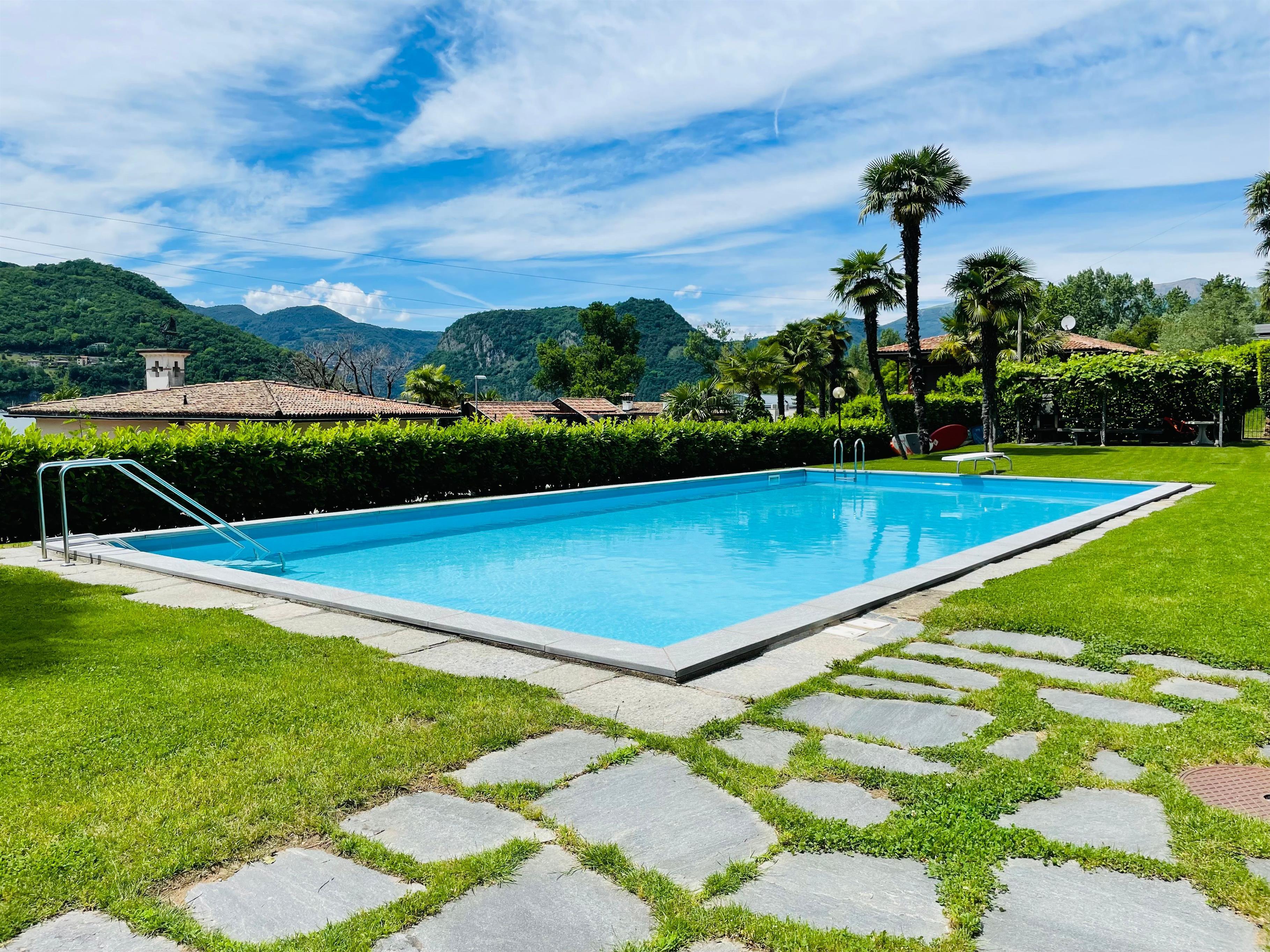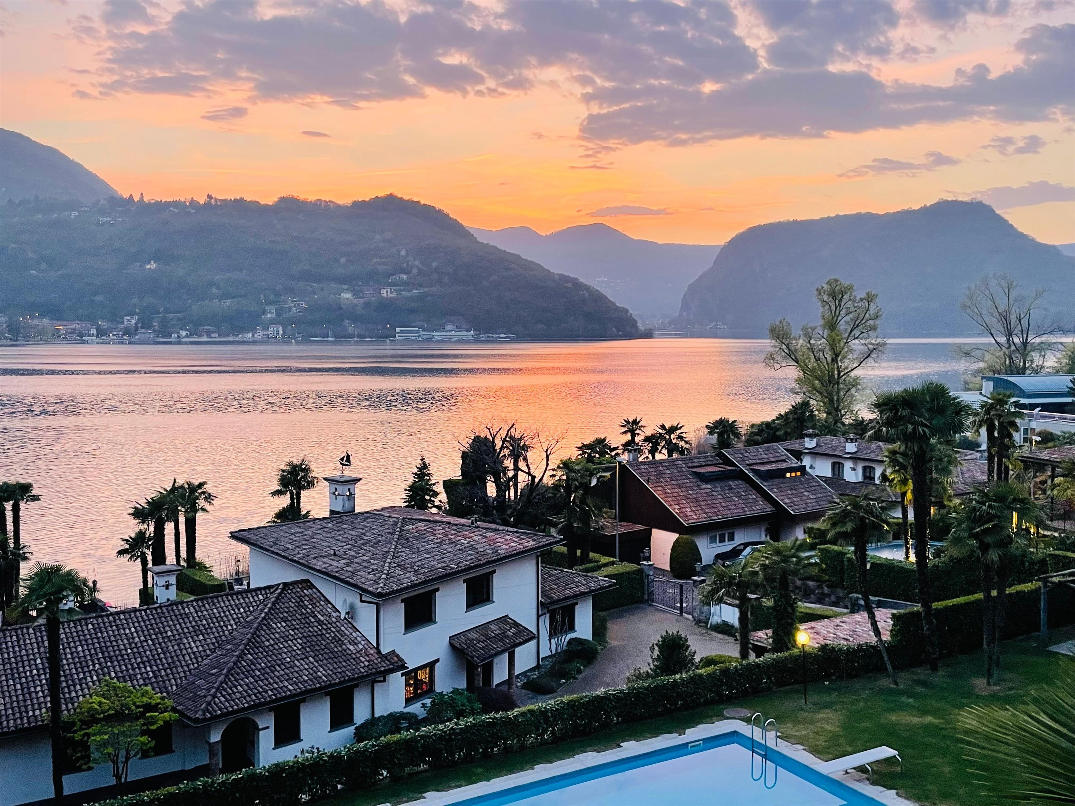 Das Highlight: eine grosse Terrasse mit fantastischem Blick auf den See und die Berge. Ein gemeinschaftlich genutzter Pool und Garten sorgen für zusätzliche Entspannung.