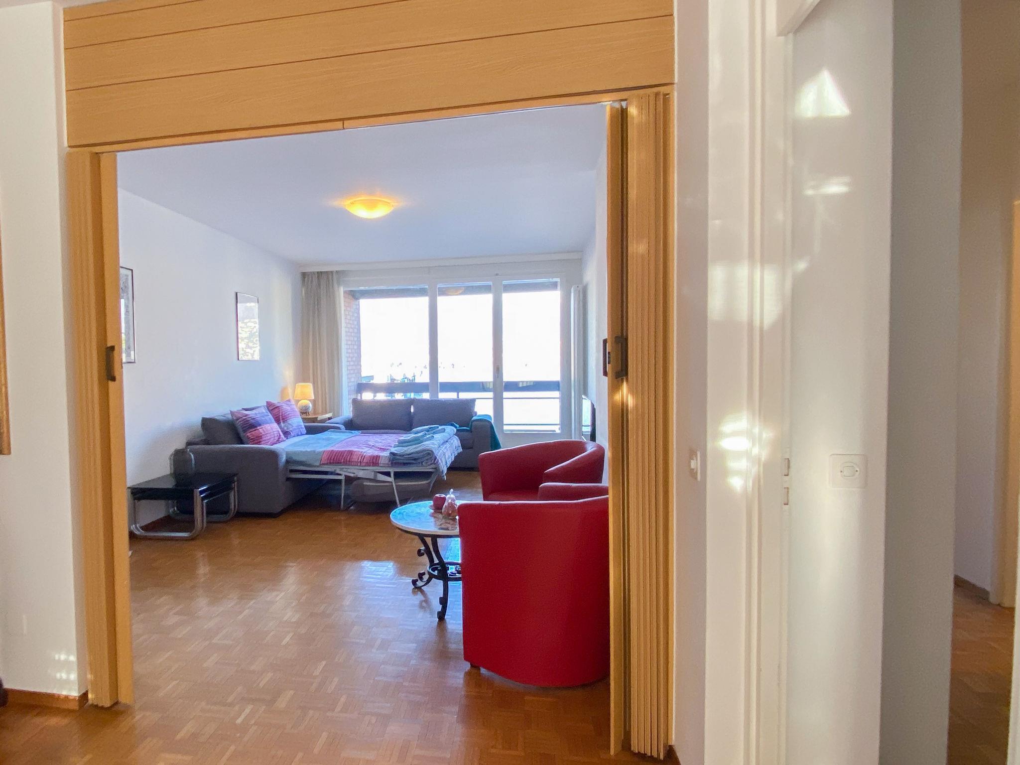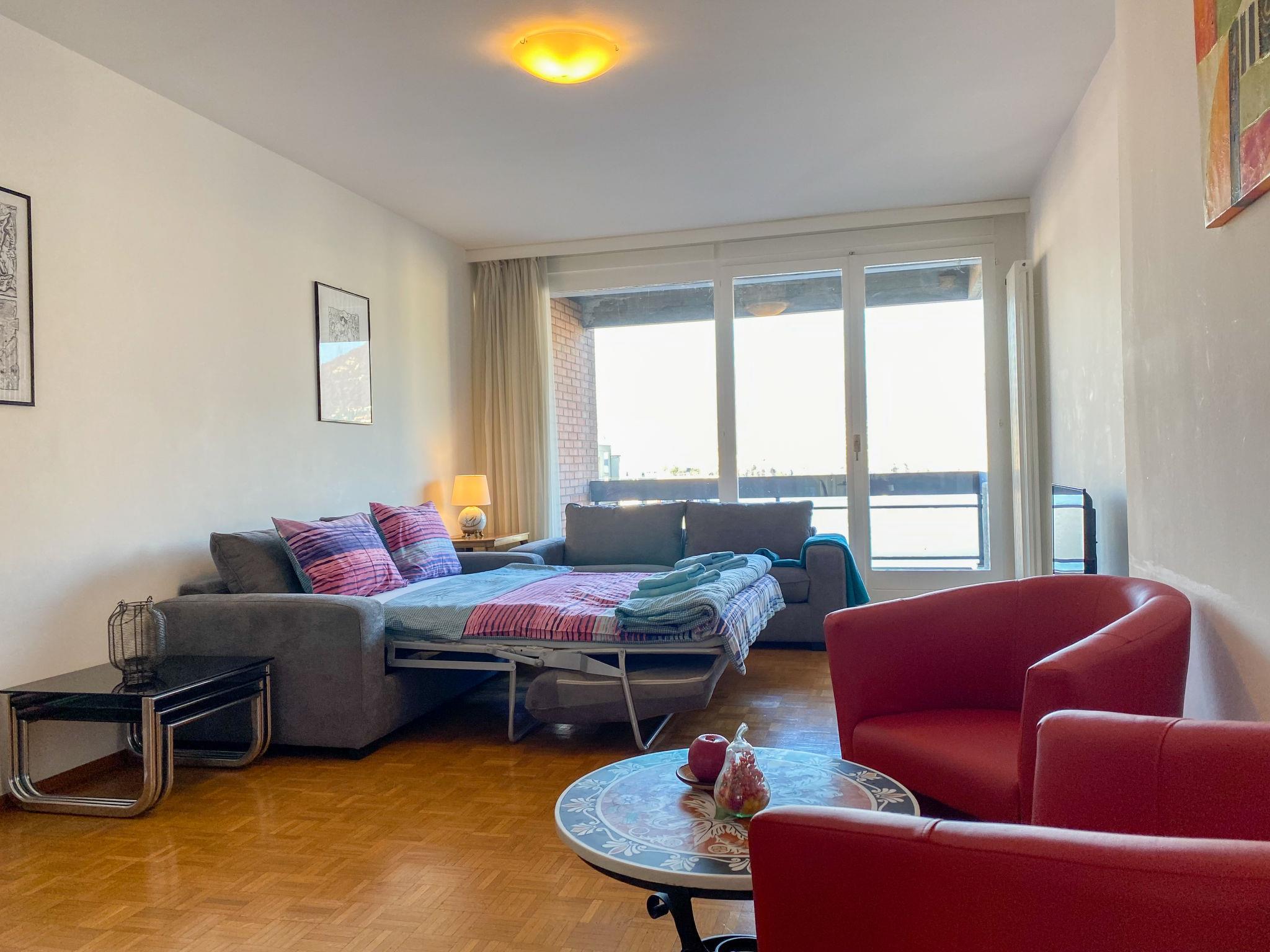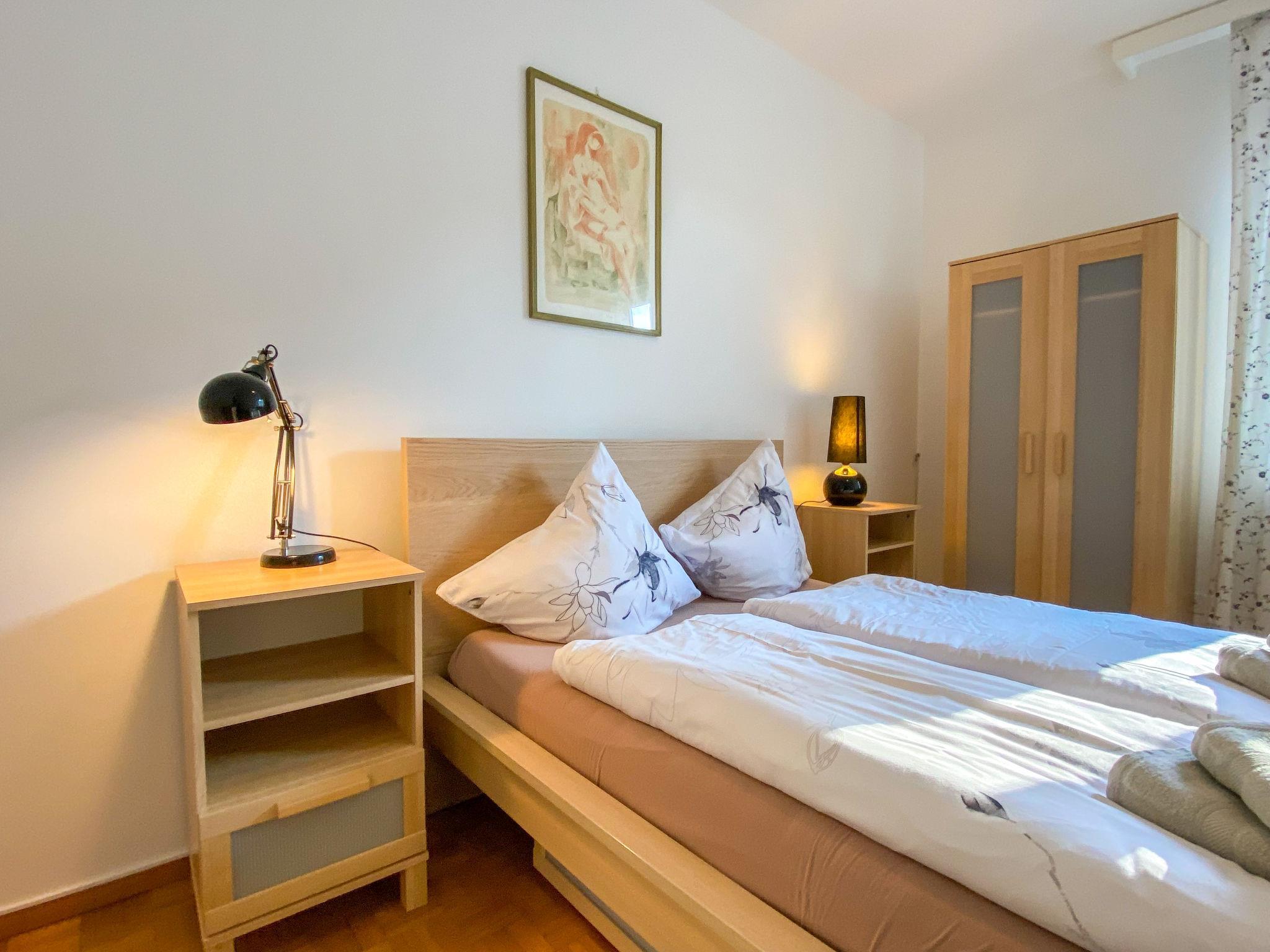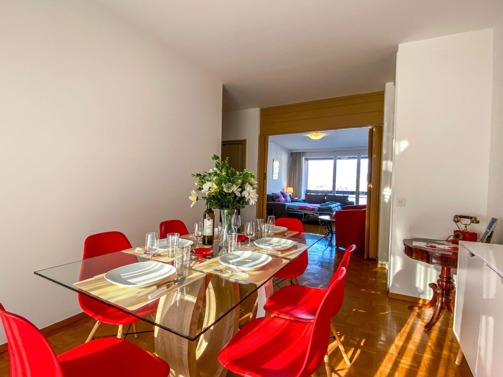 "App. Paradiso", 4-Zimmer-Wohnung 100 m2 im 5. Stock. Objekt geeignet für 4 Erwachsene + 2 Kinder. Geräumig und hell, komfortabel und gemütlich eingerichtet: offenes grosses Wohn-/Schlafzimmer mit 1 Diwanbett (140 cm, Länge 200 cm), Kabel-TV, Flachbildschirm und Radio. Ausgang zum Balkon. Offenes Esszimmer. Ausgang zum Balkon. 1 grosses Doppelzimmer mit 1 Doppelbett (2 x 90 cm, Länge 200 cm), Kabel-TV. 1 Doppelzimmer mit 1 franz. Bett (1 x 140 cm, Länge 200 cm). Grosse Küche (Backofen, Geschirrspüler, 4 Glaskeramikplatten, Mikrowelle, elektrische Kaffeemaschine, Kapseln für die Kaffeemaschine (Nespresso) extra, Fondue Set (Chinoise, Käse)) mit kleinem Esstisch. Ausgang zum Balkon. Bad/Bidet/WC, Dusche/WC. Heizung. Grosser Balkon, Südlage und Ostlage, kleiner Balkon, Nordlage. Balkonmöbel. Sehr schöne Panoramasicht auf den See, die Berge und die Landschaft. Zur Verfügung: Waschmaschine, Bügeleisen, Kinderhochstuhl bis 2 Jahre (extra), Haartrockner. Internet (WLAN, gratis). Garage Nr. AF auf dem Grundstück. Bitte beachten: Nichtraucher-Unterkunft. Maximal 1 Haustier/Hund erlaubt. NL-00007300
