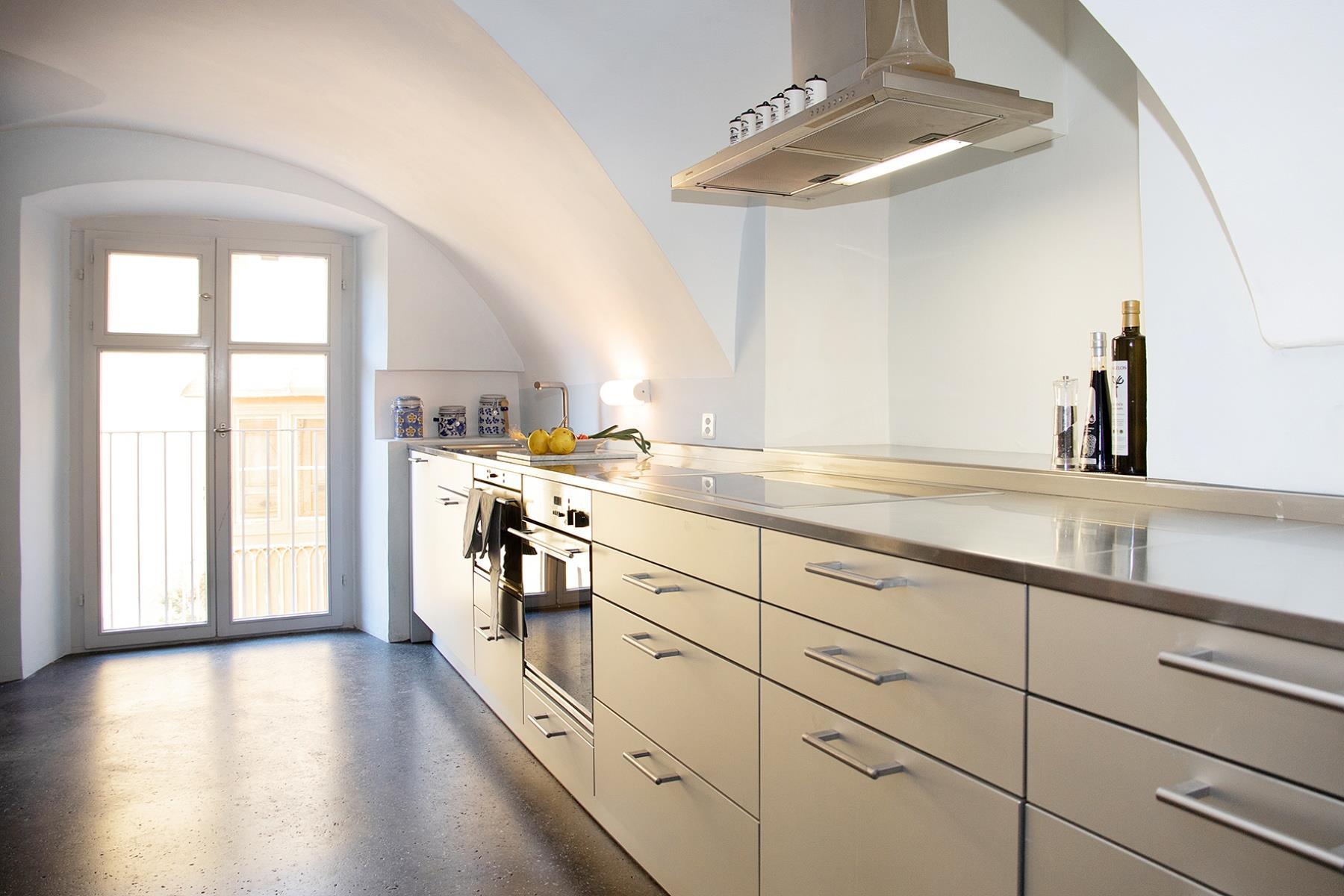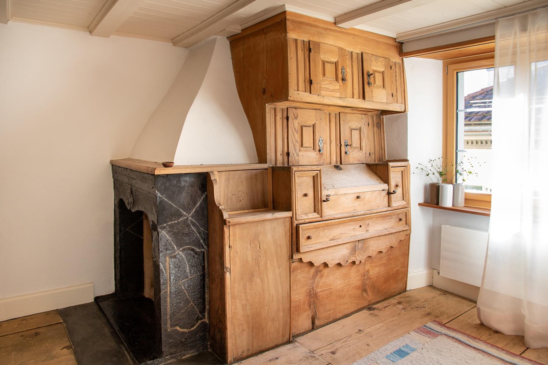 Die alte Wohnstube mit modernen Details lädt zum gemütlichen Verweilen ein. Im grosszügigen Raum steht der Esstisch für acht Personen - zudem ein wunderschöner Kachelofen und eine Sofaecke.Küche