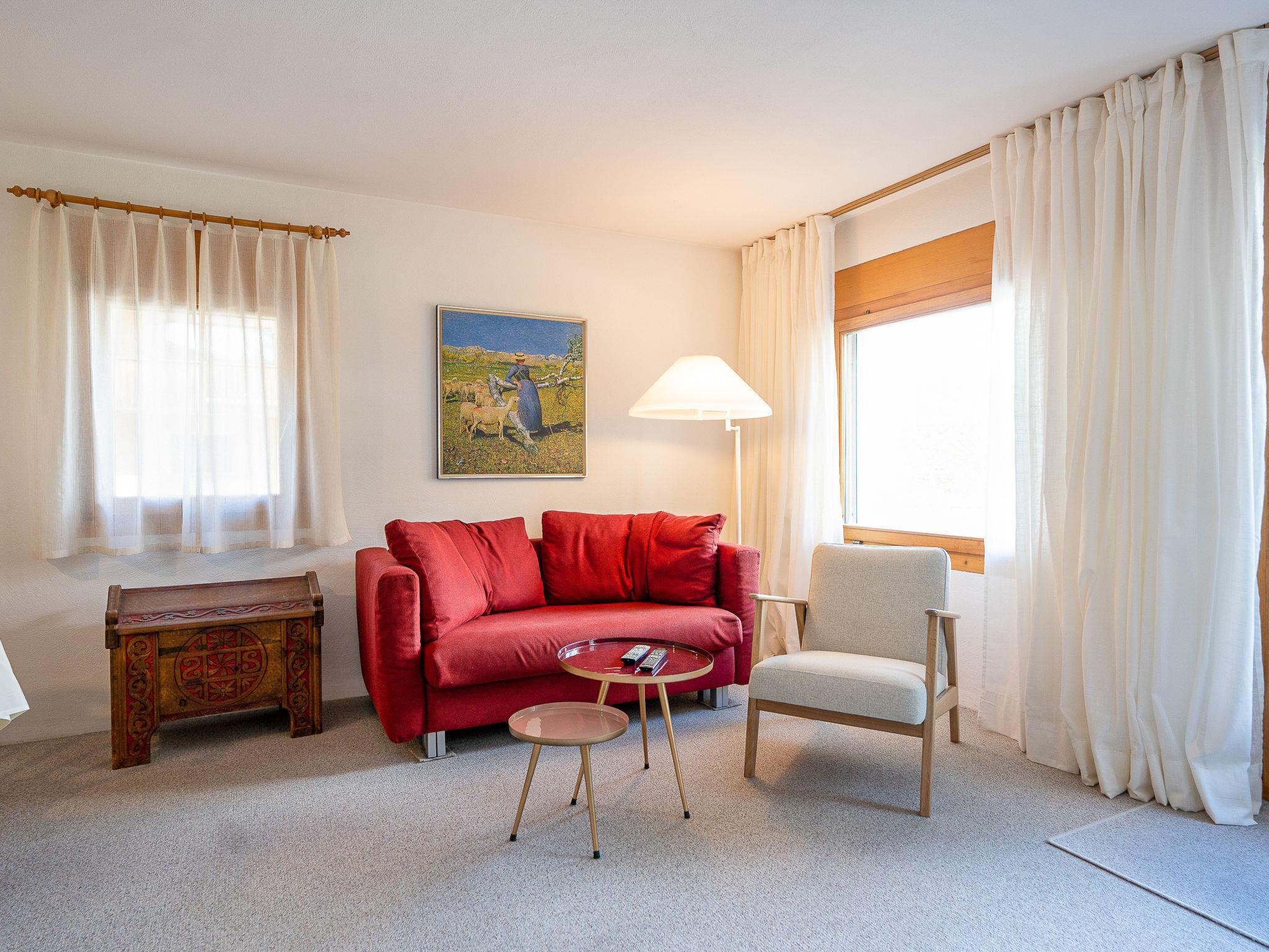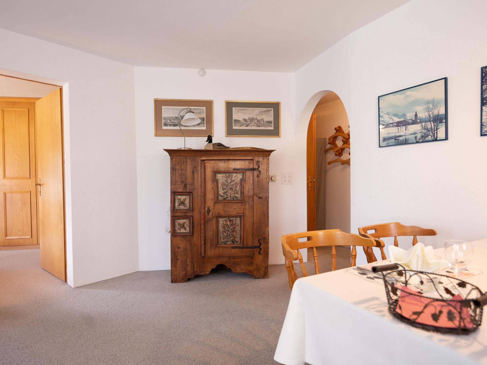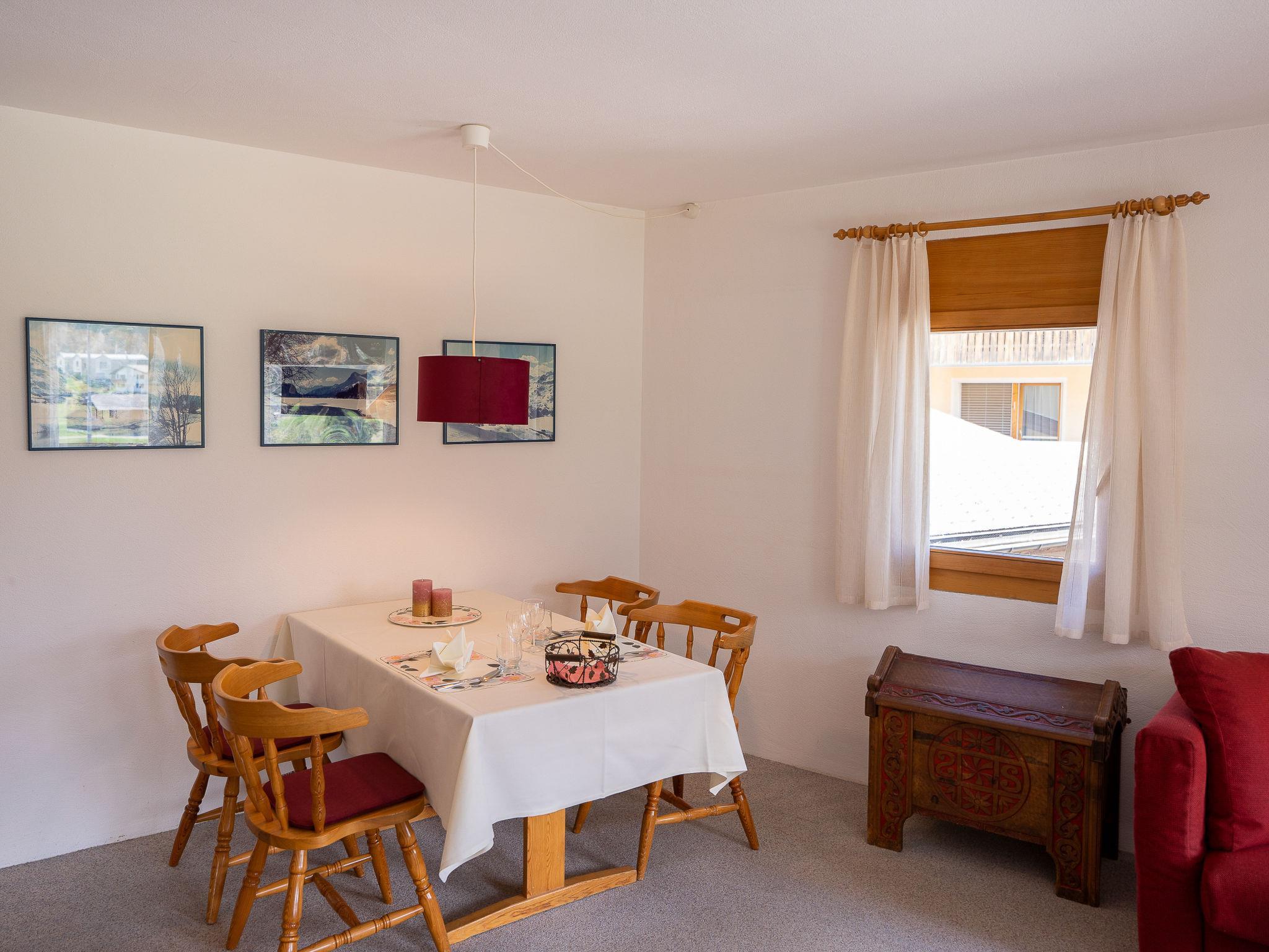 "Chesa Pra dSura 217", 2-Zimmer-Wohnung 52 m2 im 1. Stock. Hell, einfach und gemütlich eingerichtet: Wohn-/Esszimmer mit offenem Kamin (nur Deko), TV (Flachbildschirm). Ausgang zum Balkon. 1 Doppelzimmer mit 1 Doppelbett (2 x 90 cm, Länge 200 cm). Kleine Küche (3 Kochplatten, Backofen, Geschirrspüler, Toaster, Wasserkocher, elektrische Kaffeemaschine, Fondue Set (Käse)). Bad/WC. Teppichboden. Balkonmöbel. Schöne Sicht auf die Landschaft und die Ortschaft. Zur Verfügung: Haartrockner. Internet (WLAN, gratis). Garage Nr. 217 (1 Auto), Höhe 200 cm, Breite 210 cm. Bitte beachten: Nichtraucher-Unterkunft.