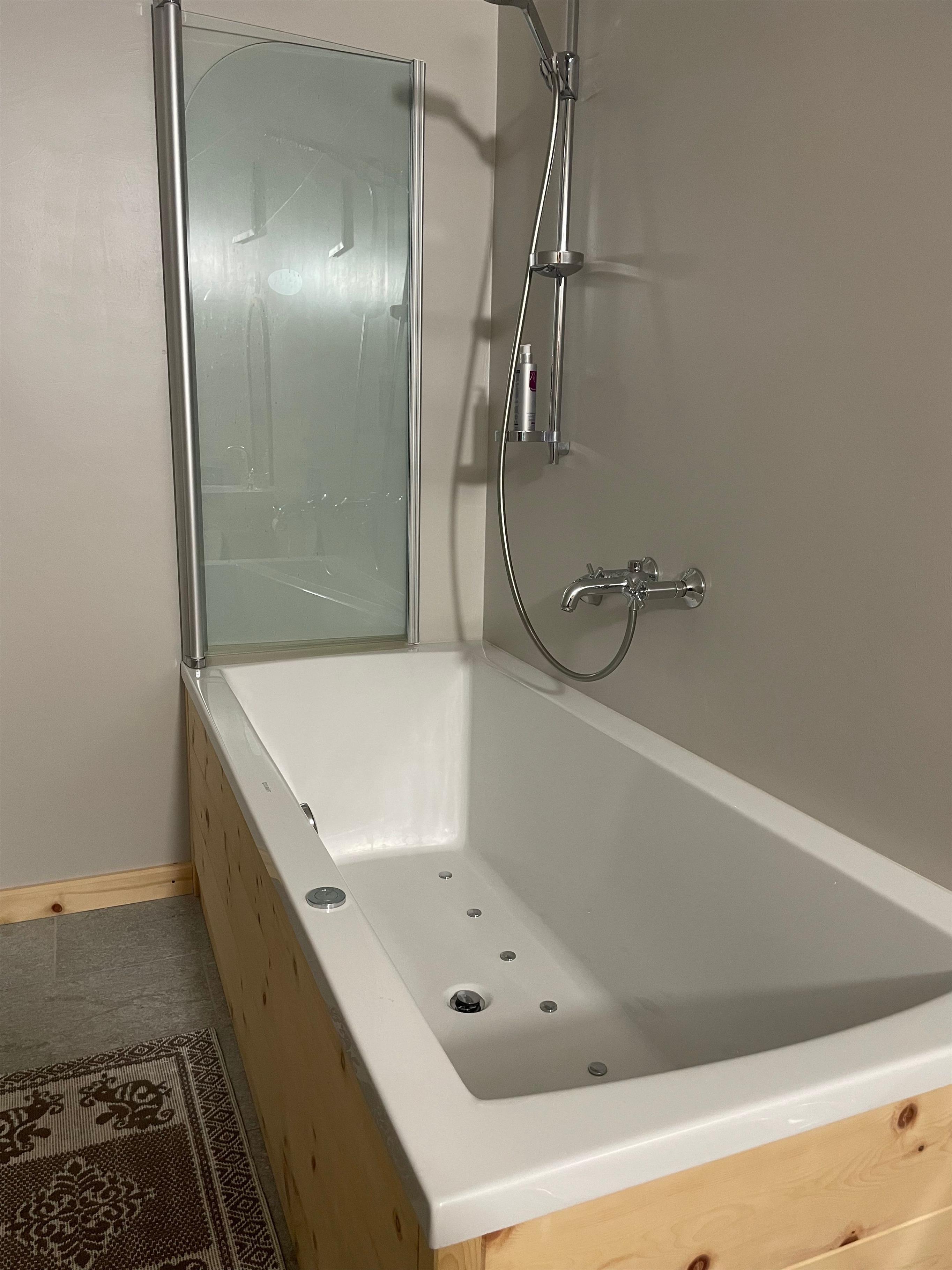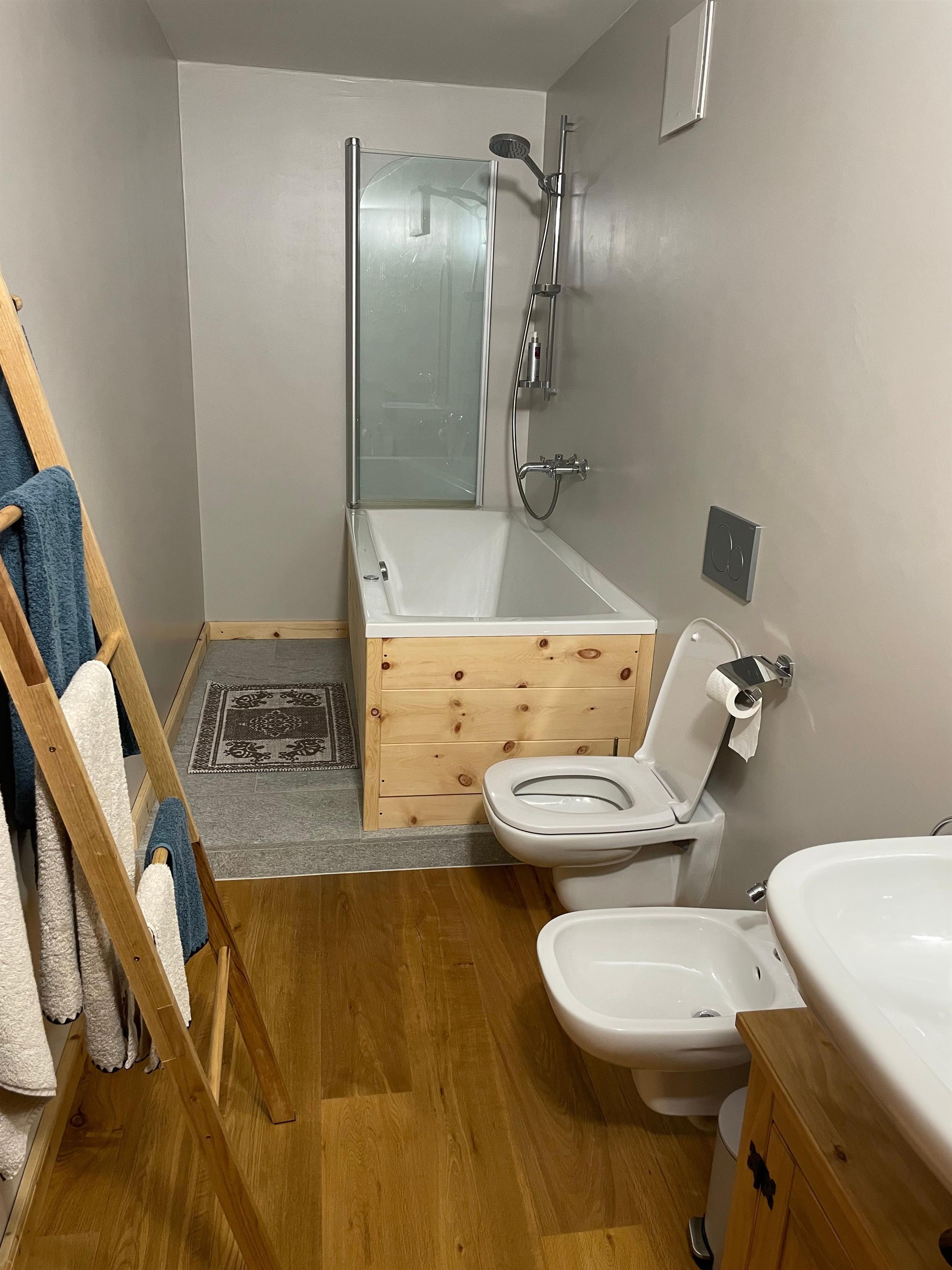 Das Innere der Wohnung ist so gestaltet, dass ein angenehmer und entspannender Aufenthalt gewährleistet ist. Sie befindet sich im zweiten Stock und verfügt über zwei Schlafzimmer, eines mit einem Doppelbett und einem Bad mit Whirlpool, das andere mit einem Etagenbett und einem Babybett. Die Küche ist mit modernen Geräten ausgestattet, darunter ein Cerankochfeld, eine Kapselkaffeemaschine, ein elektrischer Wasserkocher, eine Heißluftfritteuse und ein Geschirrspüler, die die Zubereitung der Mahlzeiten erleichtern. Das Wohnzimmer bietet einen gemütlichen Kamin für entspannende Momente, während die Waschmaschine und der Trockner, die im Gebäude zur gemeinsamen Nutzung zur Verfügung stehen, Ihren Aufenthalt noch angenehmer machen.