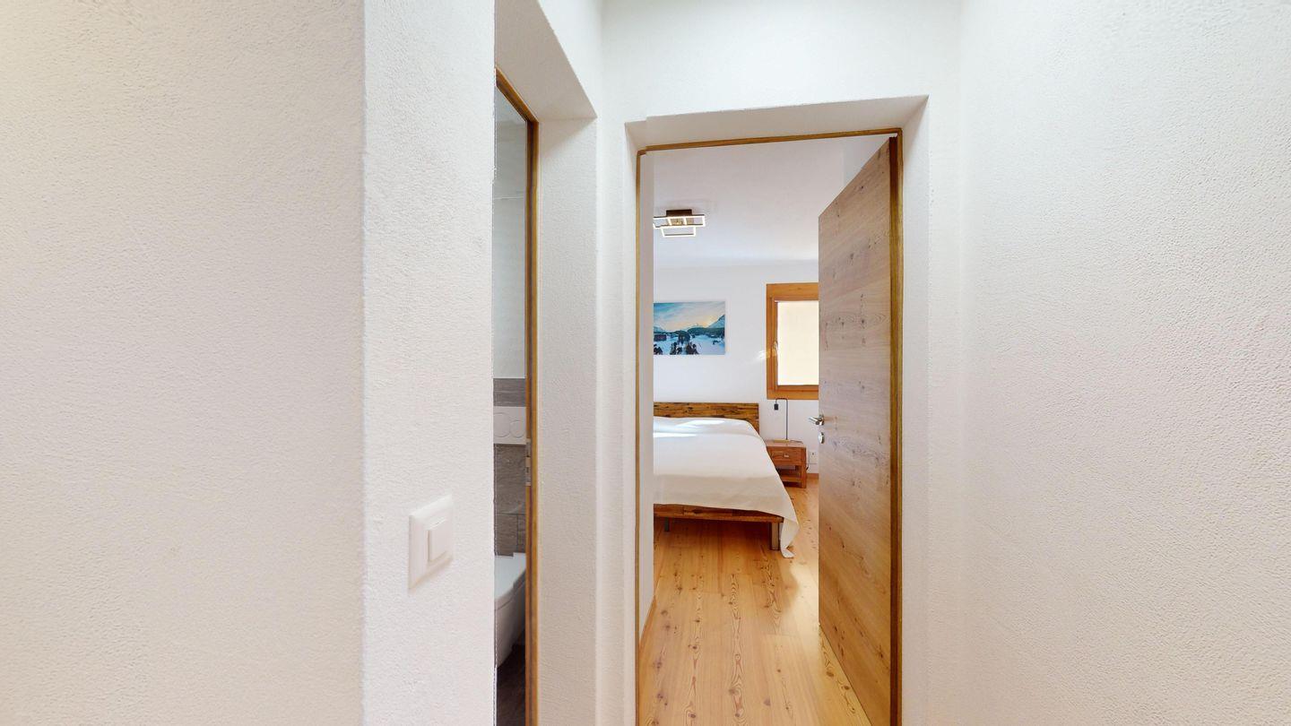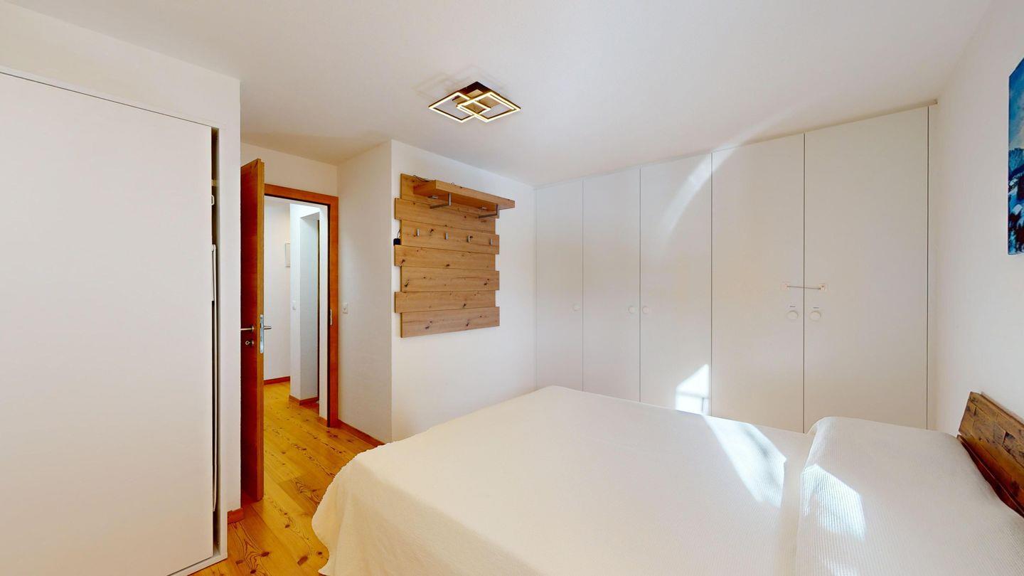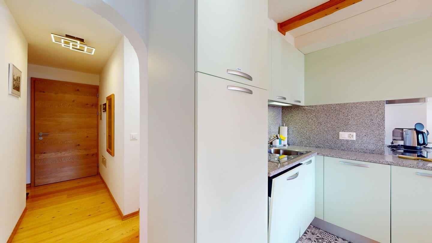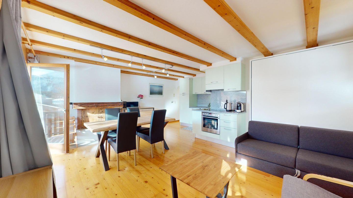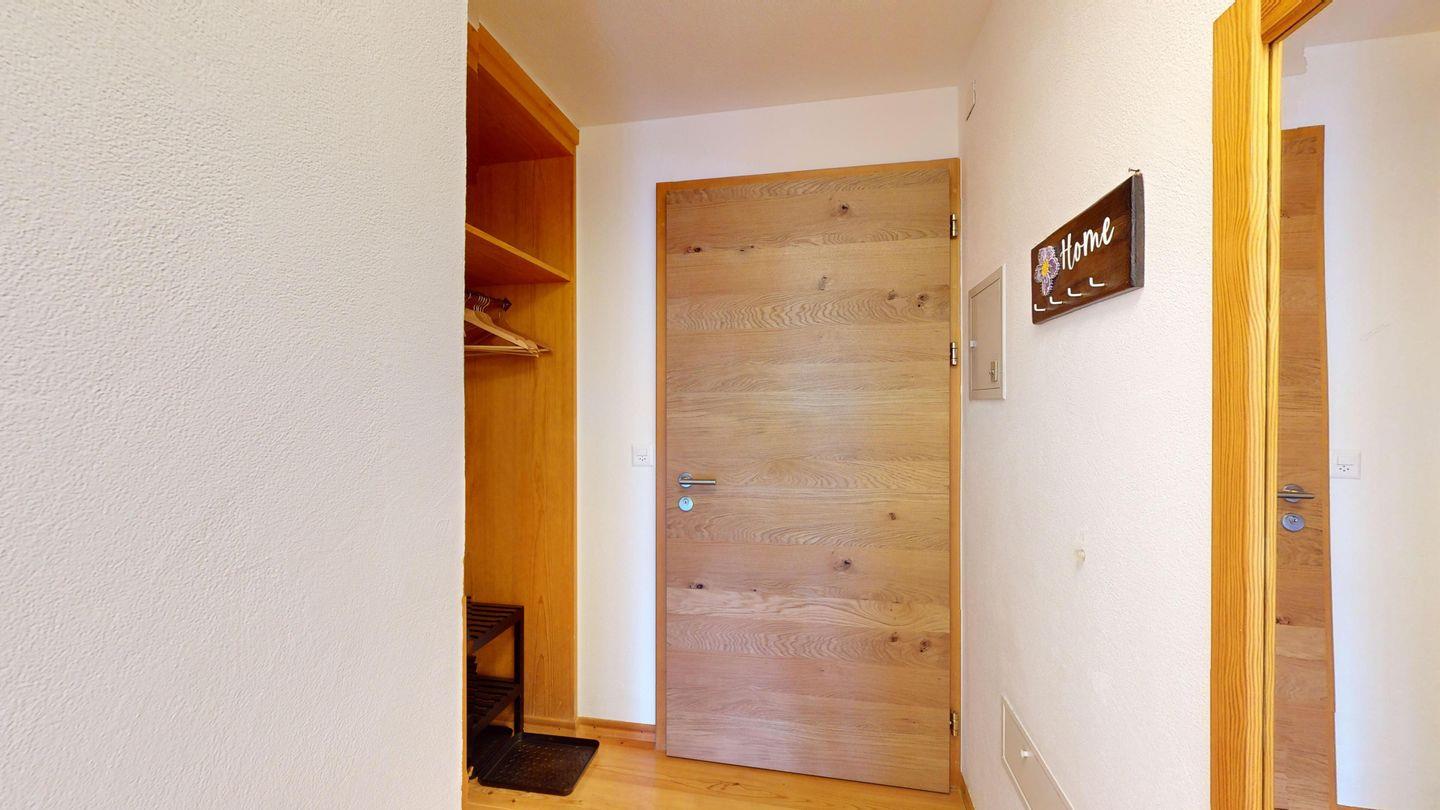 Moderne 2-Zimmer-Wohnung im 3. Stock mit ca. 60 m², im Herbst 2024 renoviert und neu eingerichtet. Eingang mit offener Garderobe. Schlafzimmer mit Doppelbett. Gemütliches Wohnzimmer mit Kaminecke und Ausgang auf den Balkon mit Bergblick. TV und Wi-Fi. Vollständig ausgestattete Küche mit Mikrowelle, Wasserkocher und Chicco d'oro-Kaffeemaschine. Neu renoviertes Bad mit begehbarer Dusche, Waschbecken und WC. Ein Parkplatz in der Garage. Gemeinsamer Skiabstellraum. Nichtraucherwohnung. Haustiere nicht erlaubt.