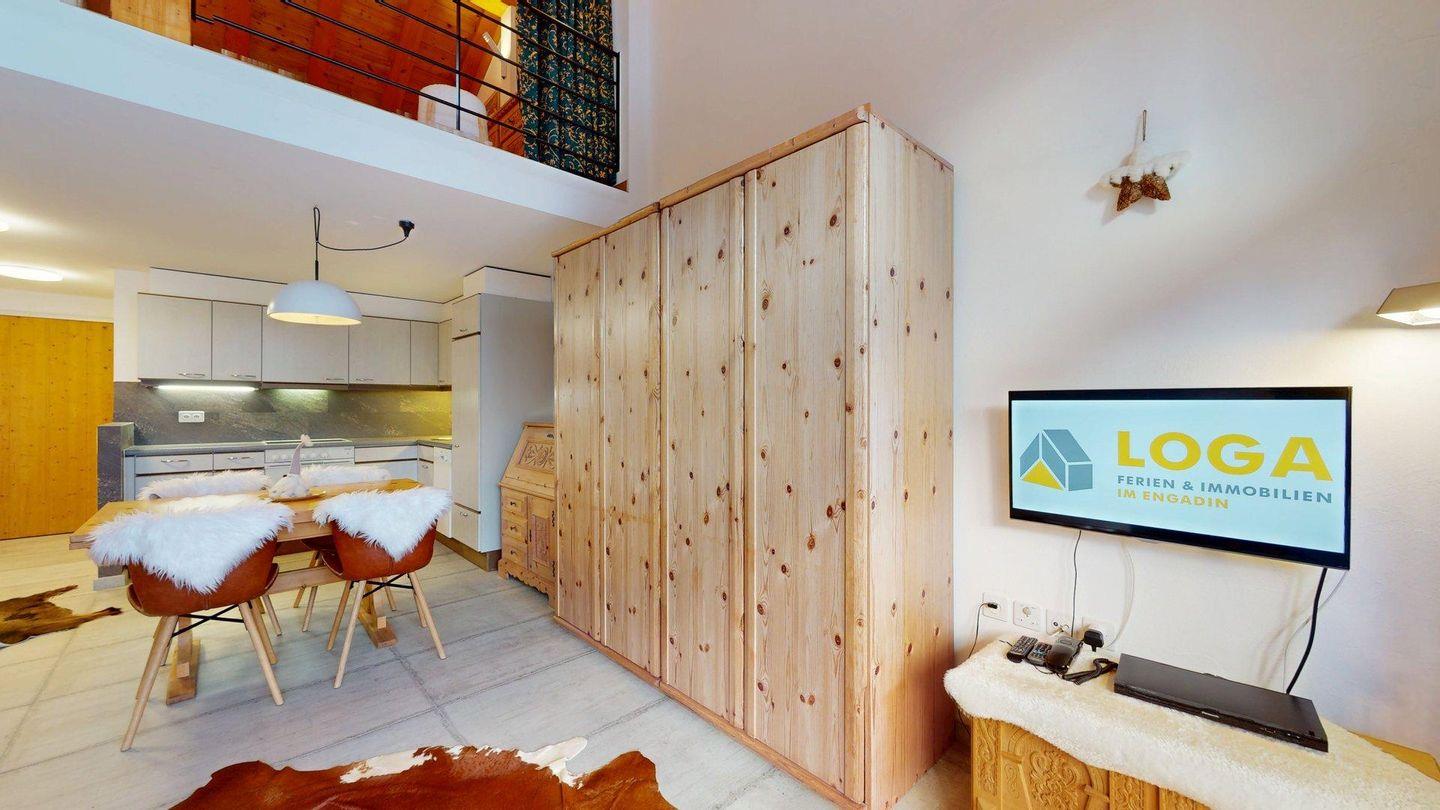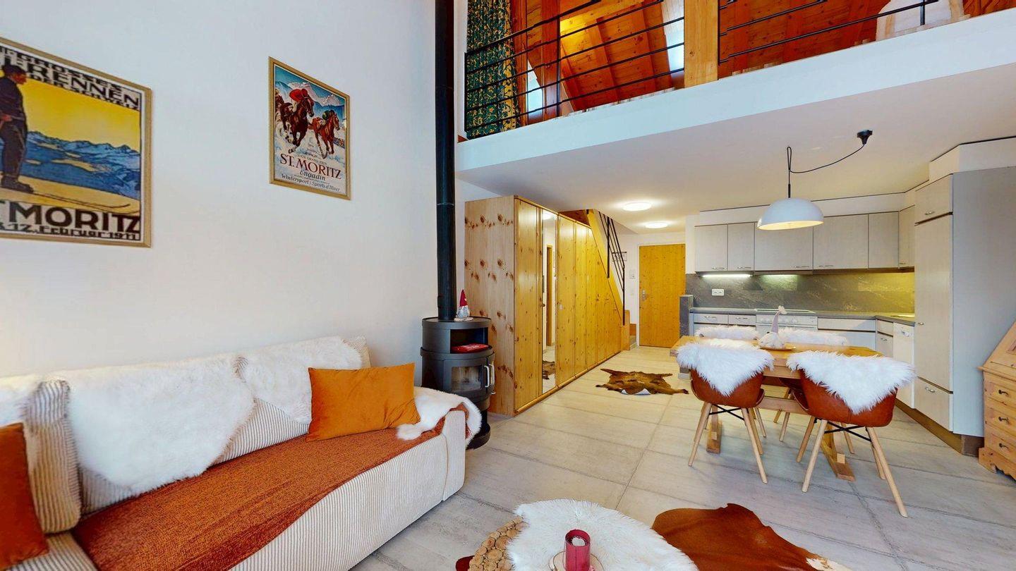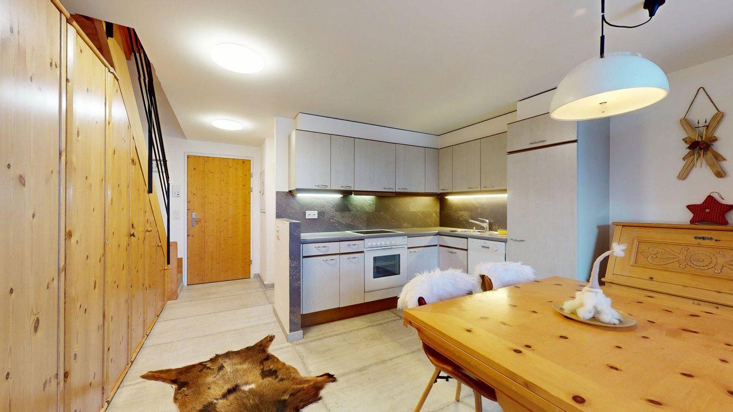 2½ -Zimmerwohnung auf der zweiten Etage, mit Lift. Entree mit Garderobe. Wohn-/ Esszimmer mit Ausgang zum Balkon. Radio/TV und Internet. Offene Küche mit Herd, Backofen, Kühlschrank mit kleinem Gefrierfach, Kaffeemaschine. Doppelschlafzimmer auf der Empore. Badezimmer mit Dusche/WC/Lavabo. Ein Parkplatz in der Garage. Ski- und Veloraum. Gemeinschaftliche Waschküche. Nichtraucherwohnung. Haustiere sind erlaubt.