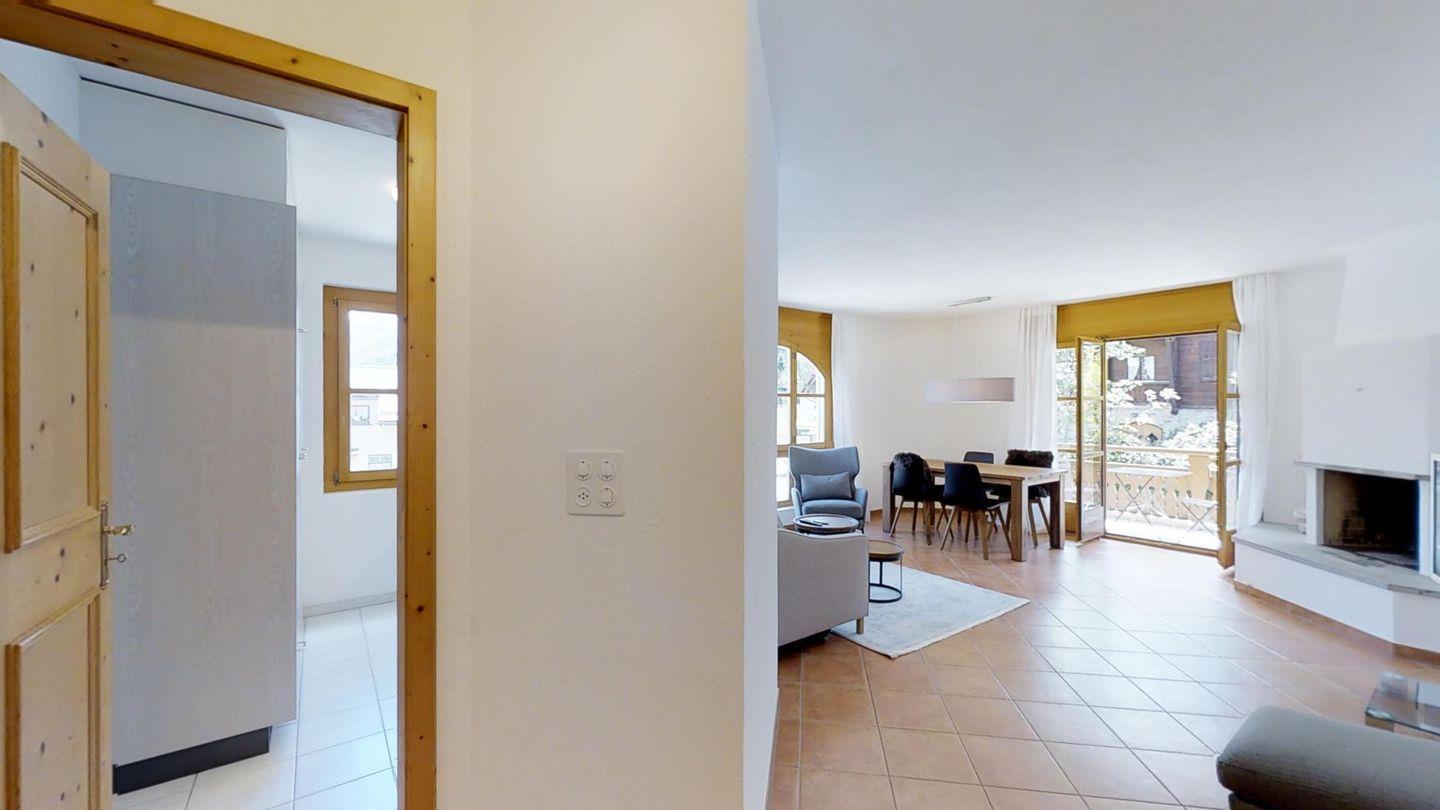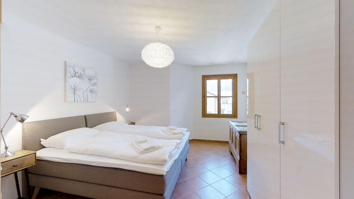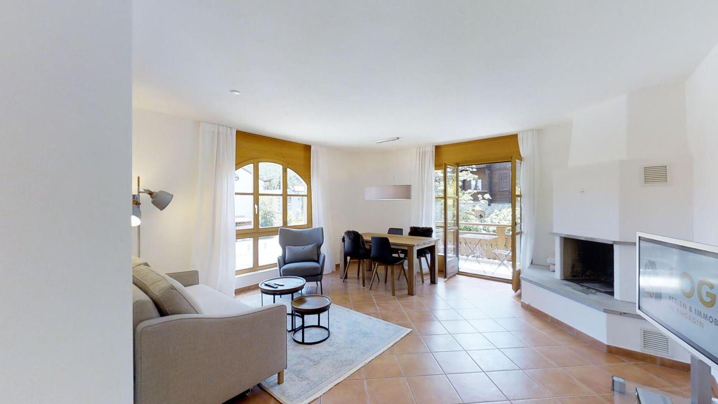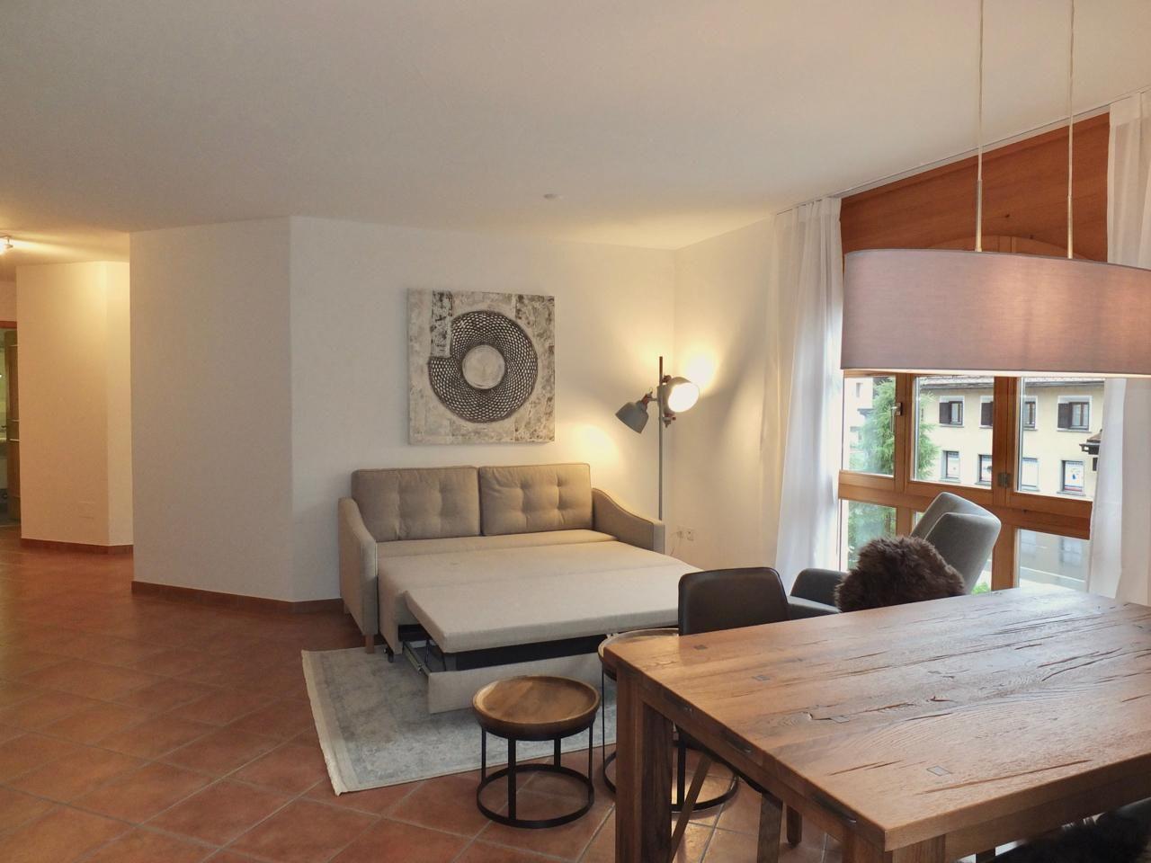 Moderne 2½-Zimmerwohnung im ersten Obergeschoss auf etwa 60 Quadratmetern. Heller Eingangsbereich mit offener Garderobe. Schlafzimmer mit Doppelbett. Wohnzimmer mit Esstisch für 4 Personen. Gemütliche Sofaecke mit Sofabett für 2 Personen. Kamin. Zugang zum Balkon mit Bergsicht. TV/Radio/WIFI. Abgetrennte Küche mit Herd, Kühlschrank/Kühlfach, Chicco d'oro Kaffeemaschine. Badezimmer mit Badewanne, Waschbecken, WC. Separater Abstellraum. Garagenplatz. Skikeller, Waschküche im Haus. Haustiere sind erlaubt.