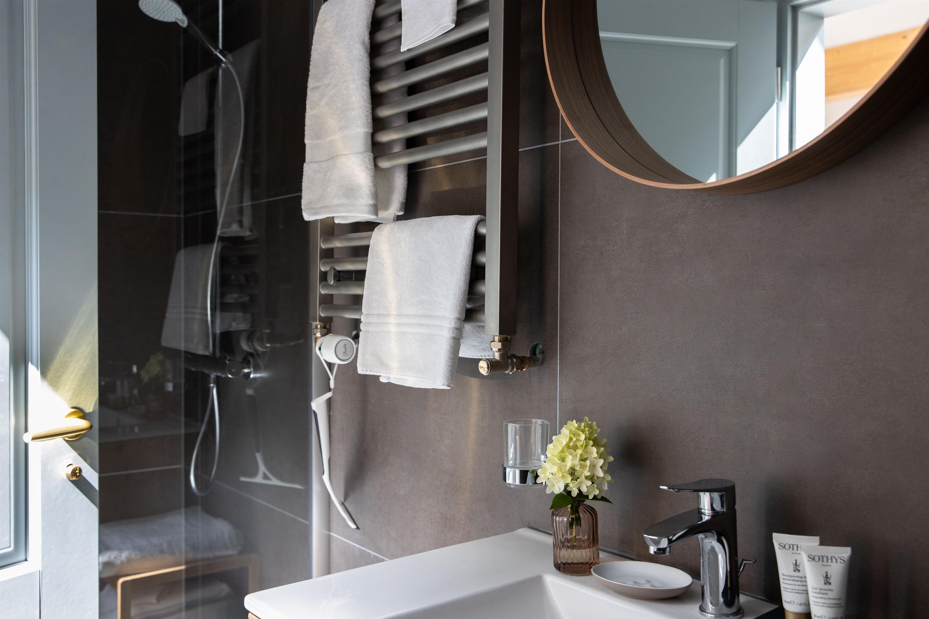 Das Innere des Appartements besticht durch seine durchdachte Ausstattung und elegante Einrichtung. Neben zwei komfortablen Schlafzimmern, darunter eine Suite mit einem en suite Badezimmer, bietet das Appartement einen flexiblen Büroraum, der je nach Bedarf in ein zusätzliches Schlafzimmer (für eine oder zwei Personen - jeweils ein Twin-Bett) umgewandelt werden kann. Eine großzügige offene Küche, ausgestattet mit einem Vier-Platten-Herd (Cerankochfeld), Kapsel-Kaffeemaschine, Spülmaschine und Wasserkocher, mündet in einen einladenden Wohnbereich, komplettiert durch einen Kamin, der für gemütliche Stunden sorgt. Des Weiteren steht Ihnen eine Waschmaschine zur alleinigen Nutzung zur Verfügung.