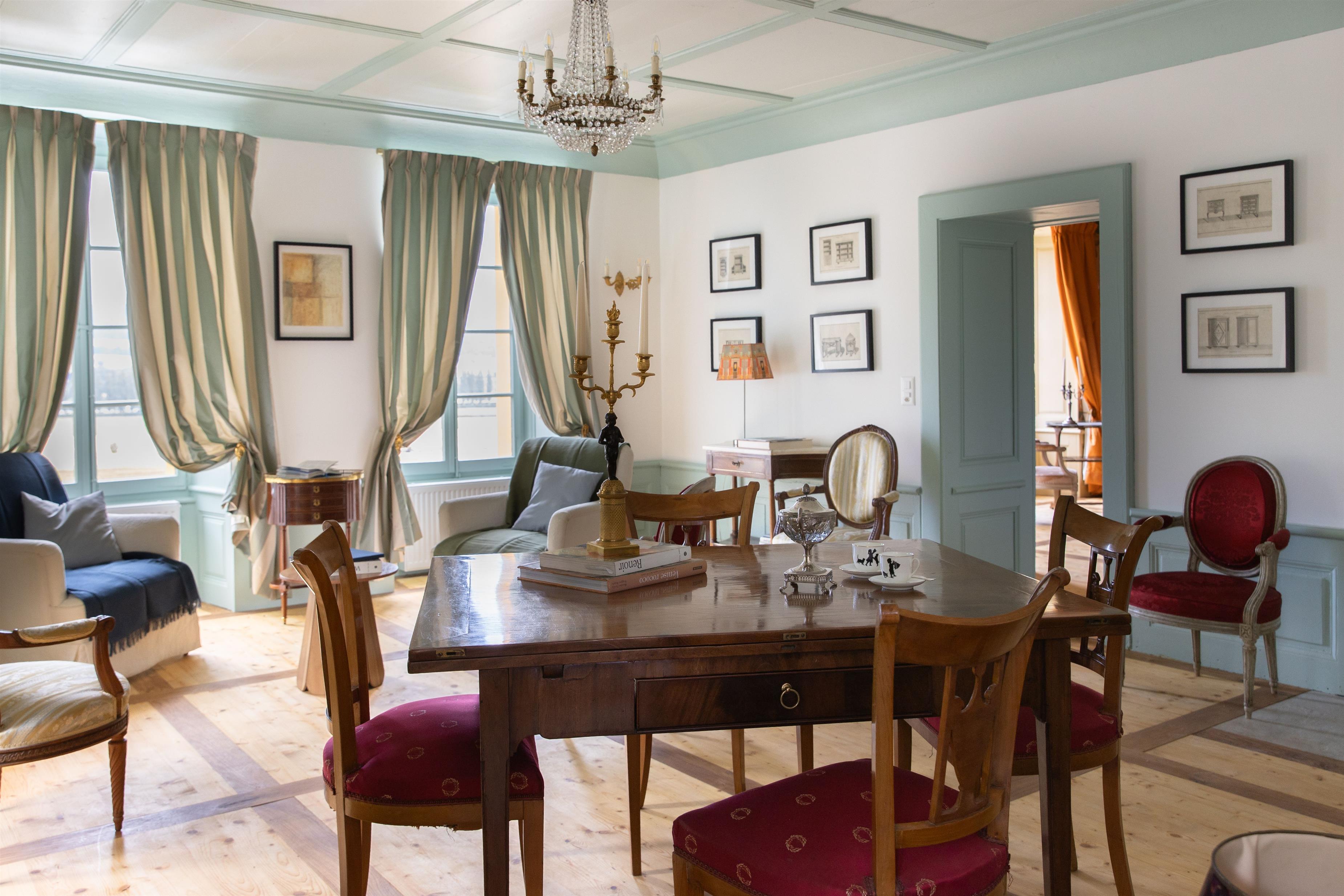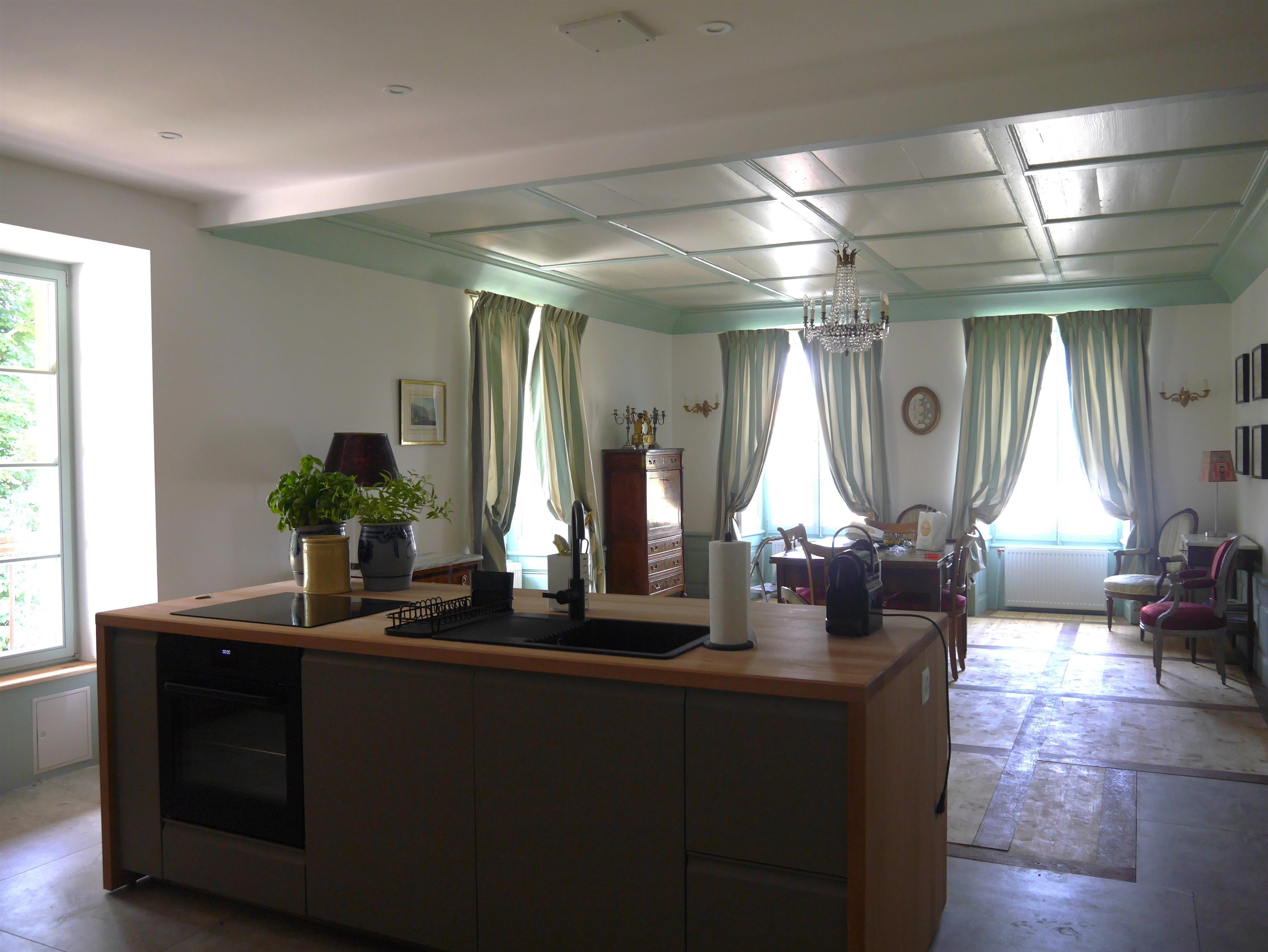 Im Inneren erwartet Sie eine geräumige Küche, die in ihrer Offenheit sowohl zur Zubereitung von Mahlzeiten als auch als kommunikativer Mittelpunkt des Apartments dient. Sie ist ausgestattet mit einem Vier-Platten-Cerankochfeld, einer Kapsel-Kaffeemaschine sowie einer Spülmaschine, was die Selbstversorgung zum Vergnügen macht. Die Küche öffnet sich zu einem großzügigen Esszimmer, das treu im Stil Louis XVI gestaltet ist und eine intime Atmosphäre für Mahlzeiten, gleich ob selbst gekocht oder vom Chefkoch zubereitet, bietet. Ergänzt wird die Einrichtung durch ein separates Badezimmer mit Dusche, ein WC und eine buanderie mit Waschmaschine, die dem Gast zur alleinigen Nutzung zur Verfügung steht.