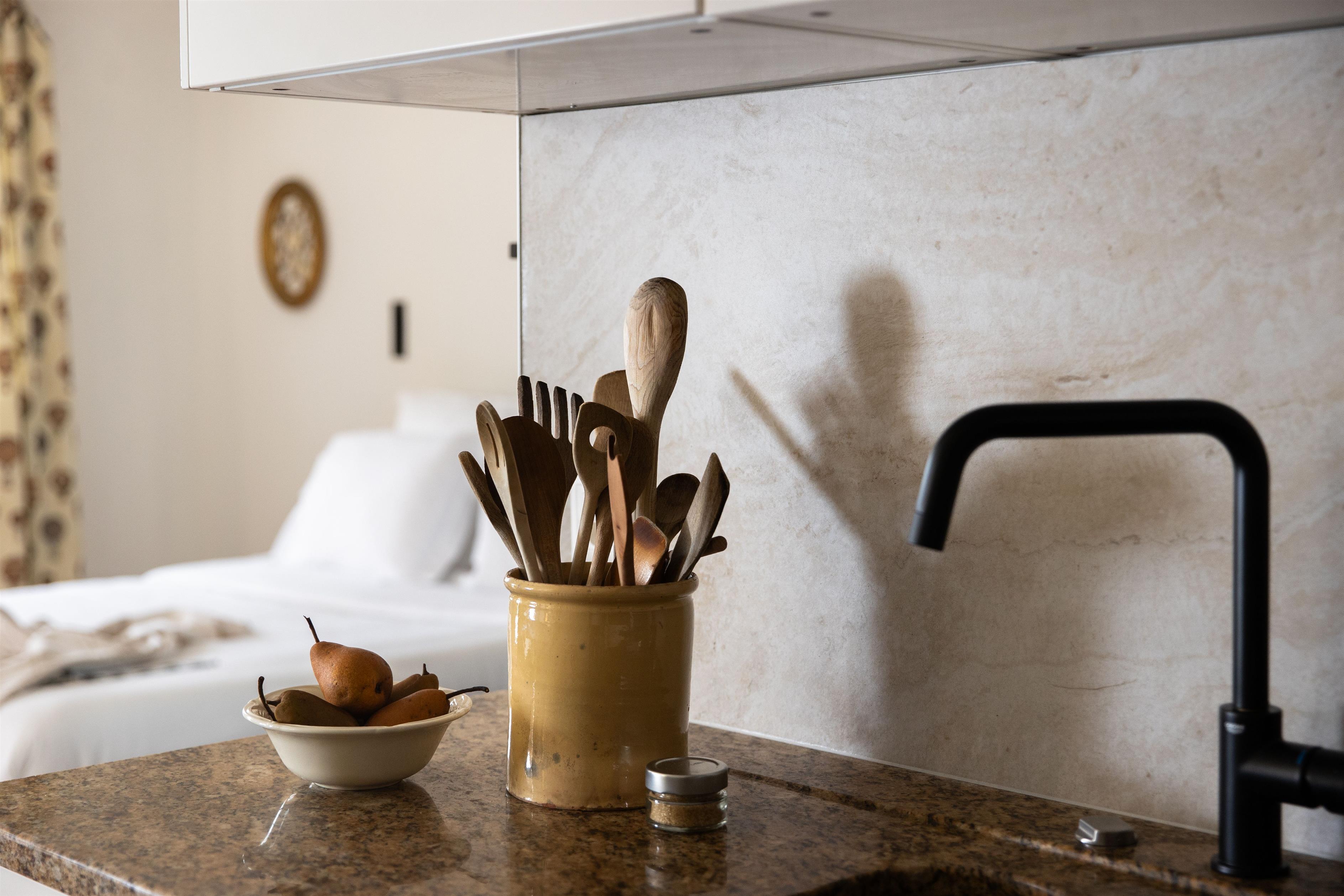 Das Interieur des Studios wurde sorgfältig ausgewählt, um Ihren Aufenthalt so angenehm wie möglich zu gestalten. Es verfügt über ein geräumiges 160cm Bett für erholsamen Schlaf, eine voll ausgestattete Kitchenette mit Kapsel-Kaffeemaschine, Wasserkocher und Minibackofen, eine praktische Esstischkombination sowie ein Badezimmer mit Dusche. All dies ohne die Notwendigkeit einer Klimaanlage oder Fußbodenheizung, da die Lage und Bauweise für ein angenehmes Raumklima sorgen.