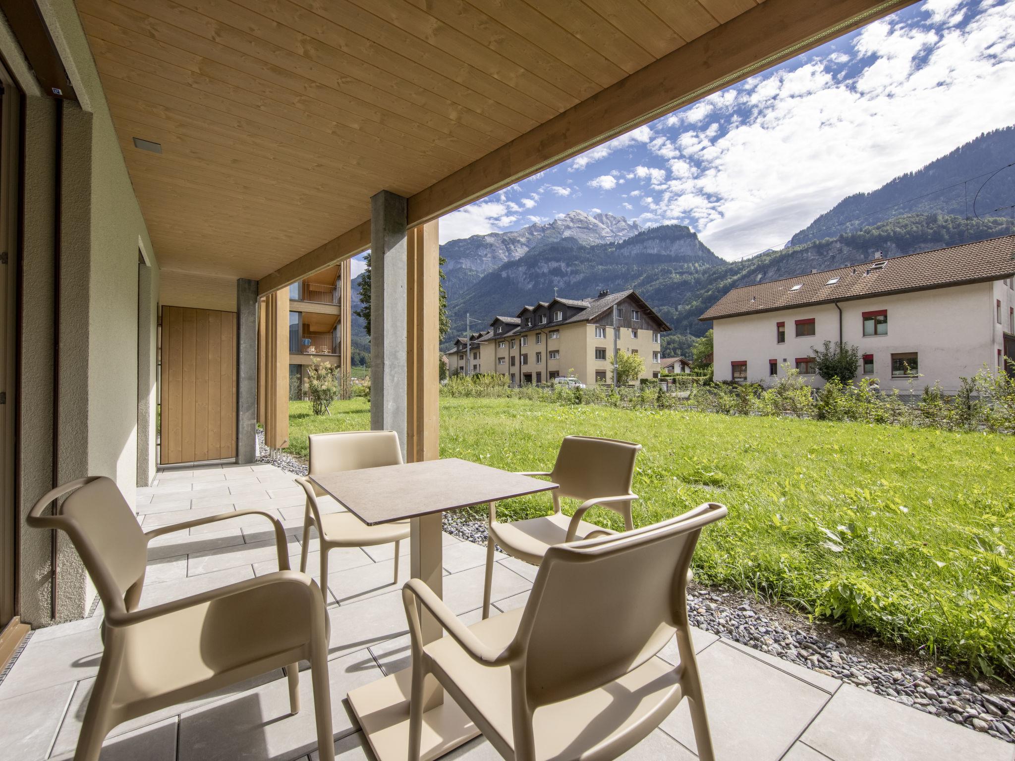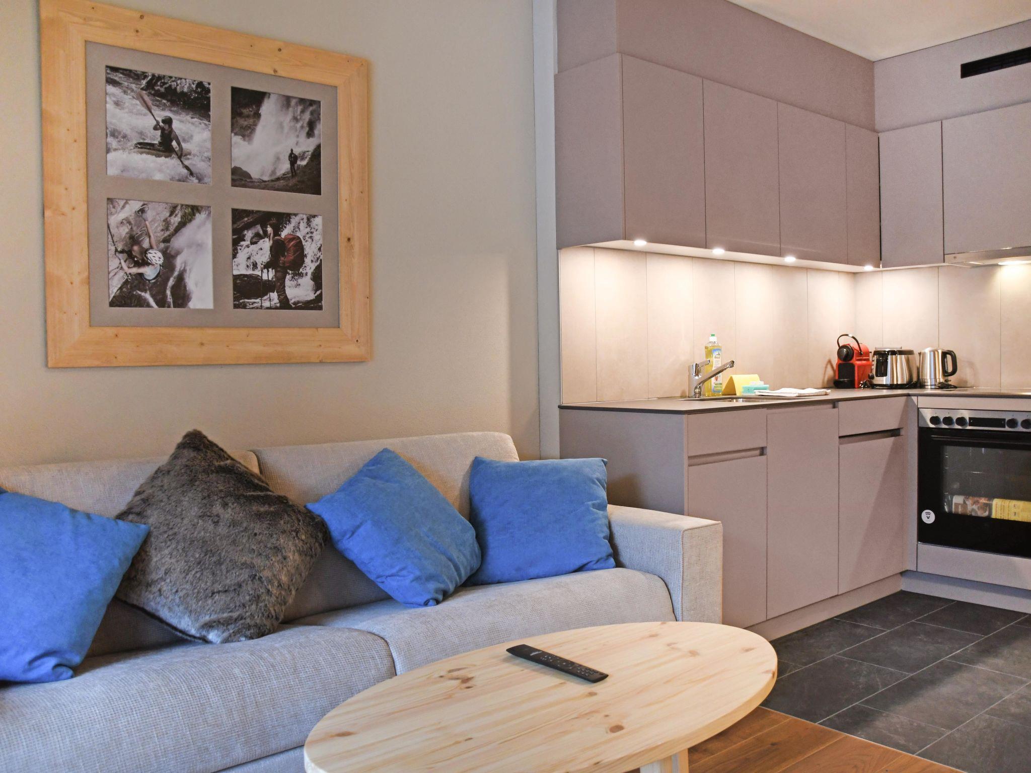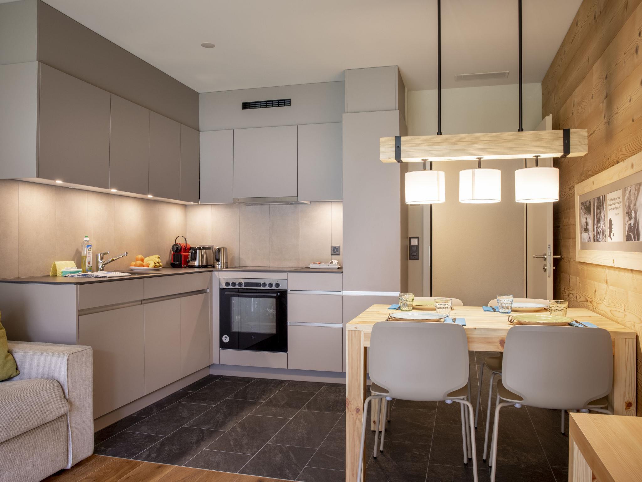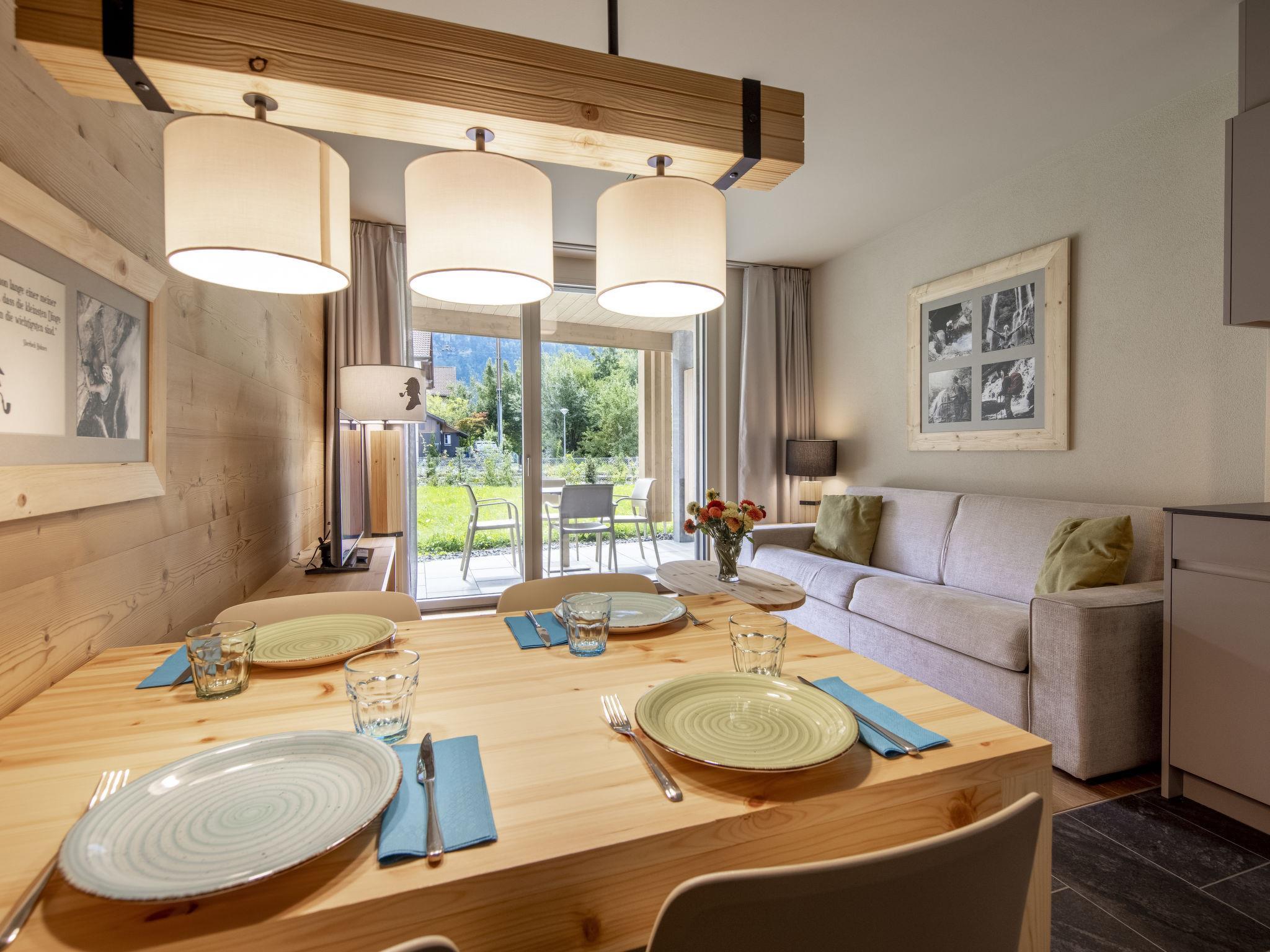"2 room apartment STANDARD - Aare", 2-Zimmer-Wohnung 39 bis 44 m2. Komfortabel und modern eingerichtet: Wohn-/Esszimmer mit 1 Doppeldiwanbett (160 cm, Länge 200 cm), Esstisch, Internationale TV-Sender und Flachbildschirm. Ausgang zum Balkon, zur Terrasse. 1 Zimmer mit 1 Doppelbett (2 x 90 cm, Länge 200 cm). Ausgang zum Balkon, zur Terrasse. Offene Küche (Backofen, Geschirrspüler, 4 Glaskeramikplatten, elektrische Kaffeemaschine, Kapseln für die Kaffeemaschine (Nespresso) extra). Dusche/WC. Fussbodenheizung. Parkettboden. Balkon 10 m2, Südwestlage oder Terrasse 12 m2, Südwestlage. Terrassenmöbel, Balkonmöbel. Eingeschränkte Sicht auf die Berge. Zur Verfügung: Haartrockner. Internet (WLAN, gratis). Bitte beachten: geeignet für Familien. Nichtraucher-Haus. 1 Haustier/Hund erlaubt. Beim Mietobjekt handelt es sich um ein Typenhaus bzw. Um eine Typenwohnung. Ein Fondue Set (Fleisch oder Käse) sowie ein Raclette Ofen kann an der Rezeption gegen ein Depot ausgeliehen werden.