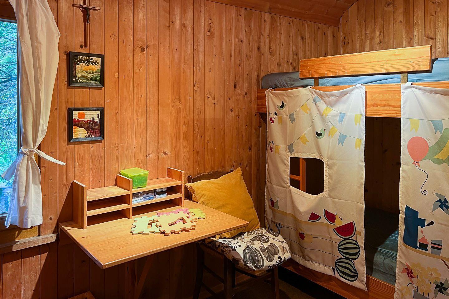 Das Chalet bietet zwei Schlafzimmer mit je einem Doppelbett und einem Kinderbett und ist ideal für vier Personen. Im Erdgeschoss befinden sich eine gemütliche Stube mit Sofa und Kamin sowie ein grosszügiges Esszimmer. Grosse Fenster und helle Räume sorgen für eine freundliche Atmosphäre.
