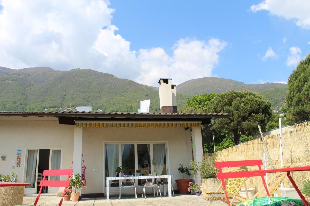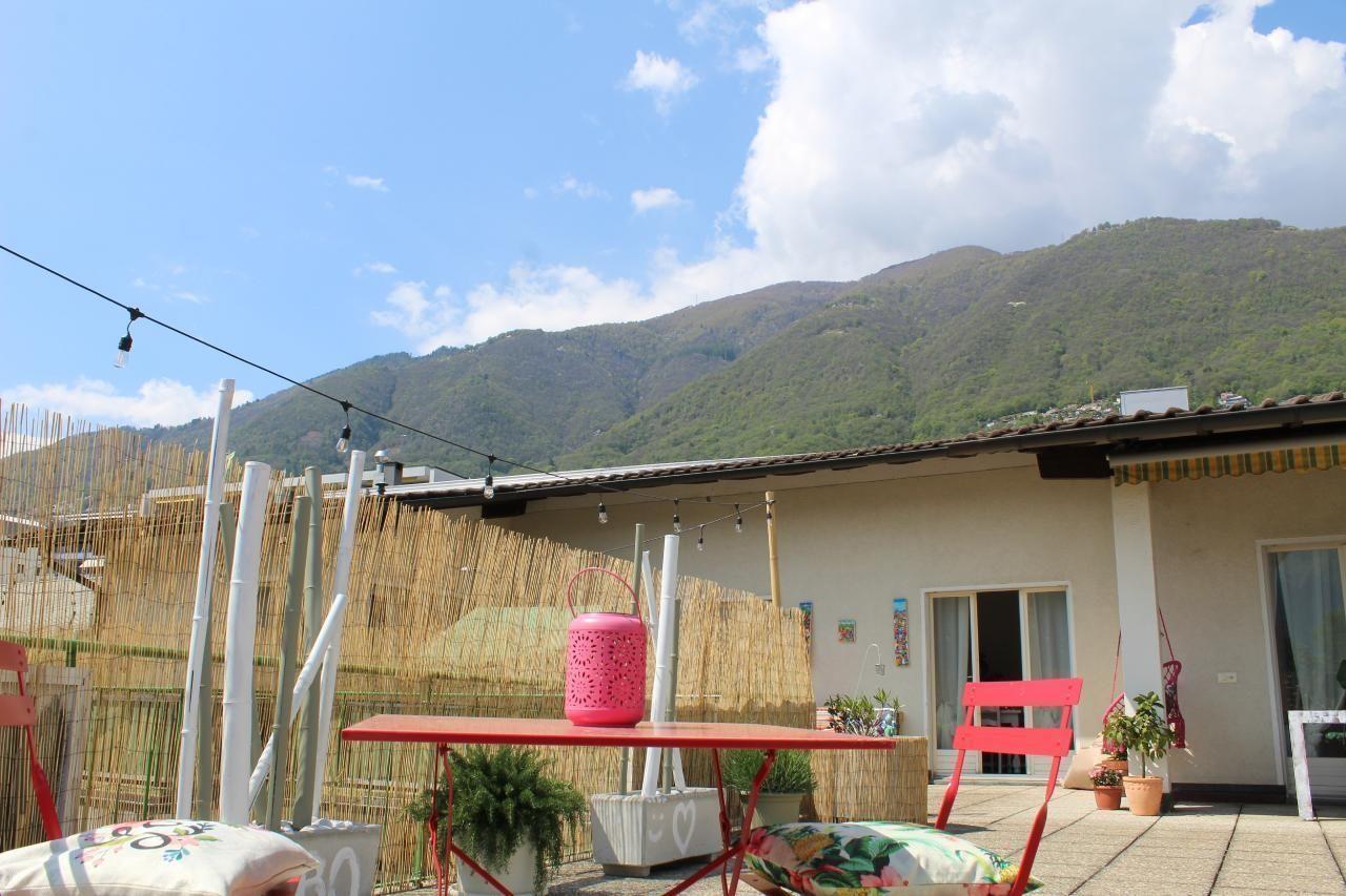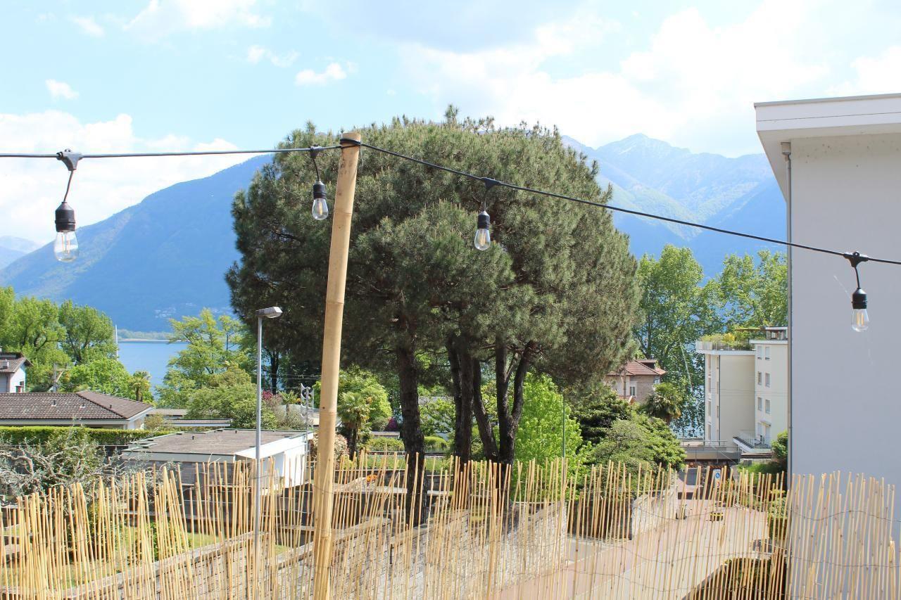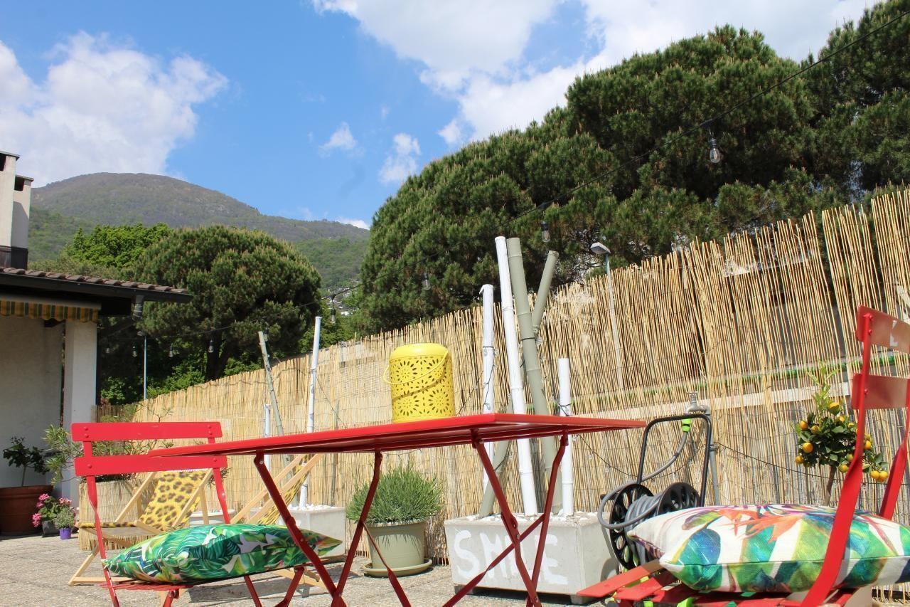Es ist eine sehr geräumige Wohnung mit einer privaten Terrasse voller Blumen (ca. 110 m²), die abends beleuchtet werden kann und in einer privilegierten Gegend am Lago Maggiore liegt.