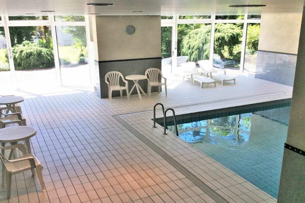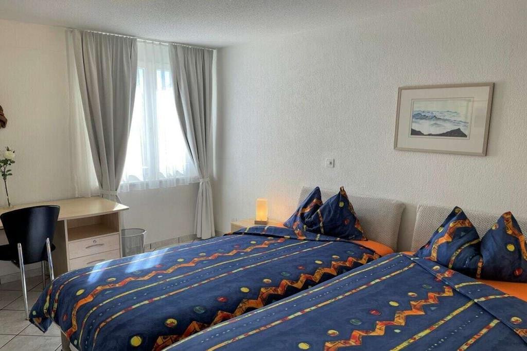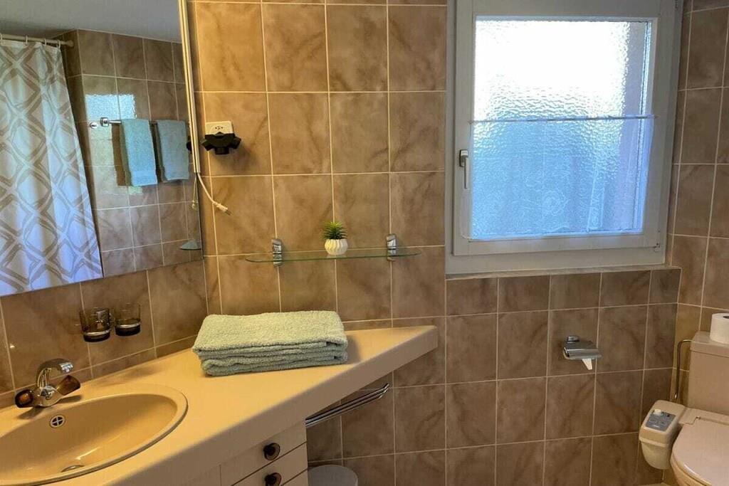 • 2.5 Zimmer, 60 m2, 3. Etage (Lift) • 3 Personen • Zentrale, ruhige Lage • Entrée mit Garderobenschrank • Wohn / Esszimmer mit Sofa und Einzelbett 100 x 200 cm • Esstisch und Stühle • Grosszügiger Balkon mit Esstisch, Sonnenstoren, 2 Liegestühle • LCD/LED TV, mit Netflix, Wlan • Gut ausgestattete separate Küche mit Durchreiche • Kühlschrank mit integriertem Gefrierfach • Backofen, Ceran-Kochfeld • Microwelle, Heissluftfritteuse • Espressomaschine La Mocca (Nespresso kompatibel) Kapseln mitbringen • Fondue- und Raclettgeschirr • Wasserkocher, Toaster • Schlafzimmer mit Doppelbett, 2 Matratzen à 100 x 200 cm • Grosser Spiegelschrank, Schreibtisch • Badezimmer mit Wanne / WC, Haartrockner • Plattenboden und Rolläden in allen Räumen • Bodenheizung • Reservierter Parkplatz in der Garage • Waschküche zur Mitbenutzung • gepflegtes Hallenbad mit Sitz- und Liegegelegenheit, Liegewiese, • zwei Duschen, WC und Föhnnische • Sauna zur Mitbenutzung (gegen Gebühr) • Haustiere nicht erlaubt • Rauchen nicht gestattet (bitte auf dem Balkon rauchen) • Bushaltestelle und Bahnhof in unmittelbarer Nähe