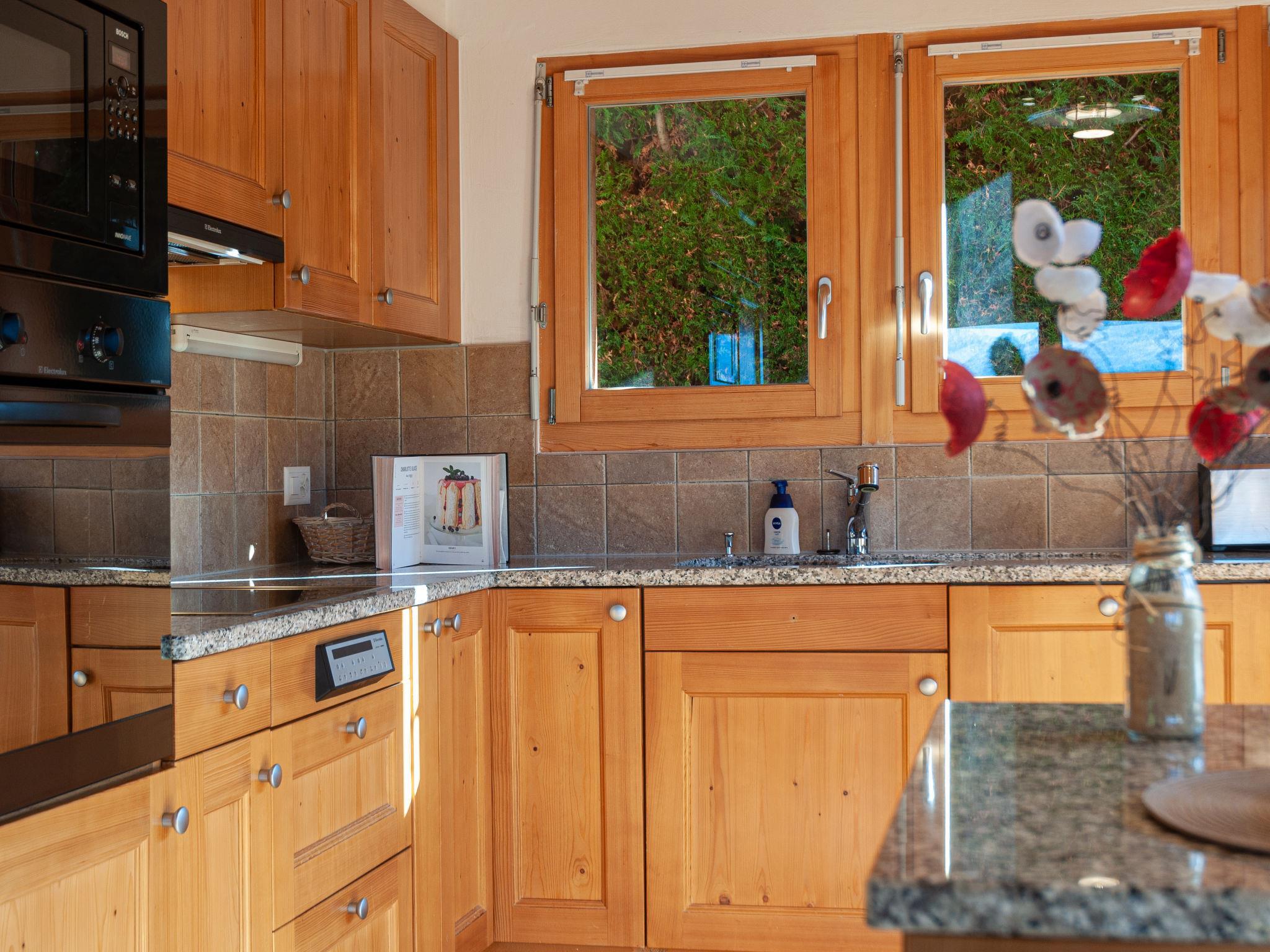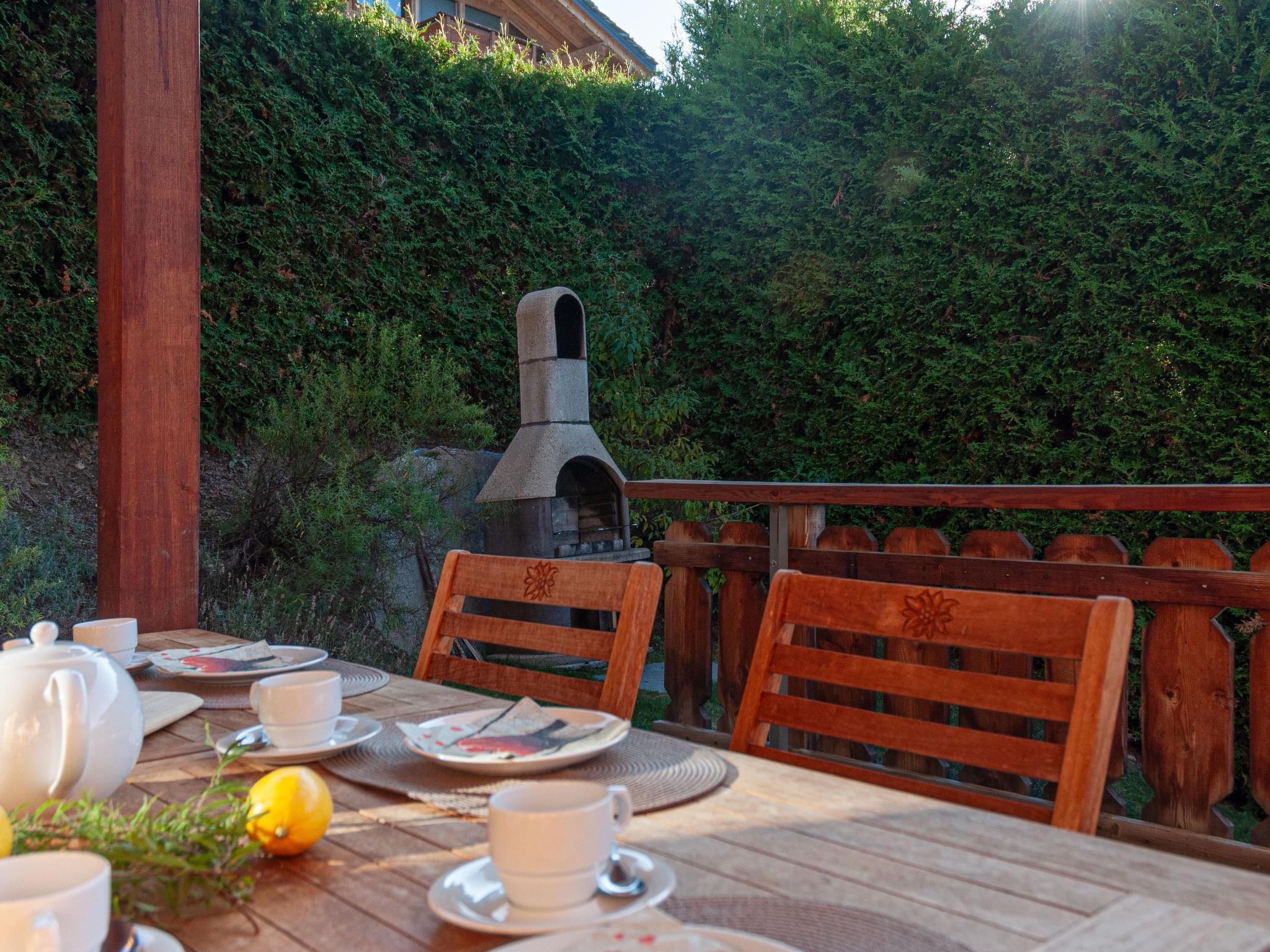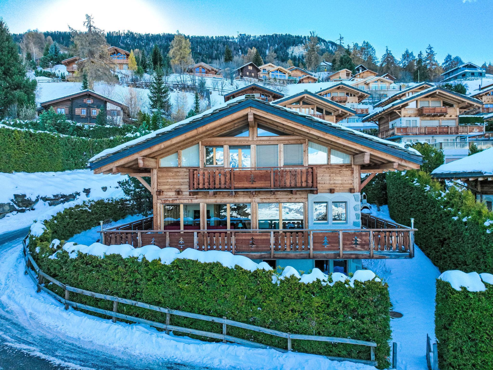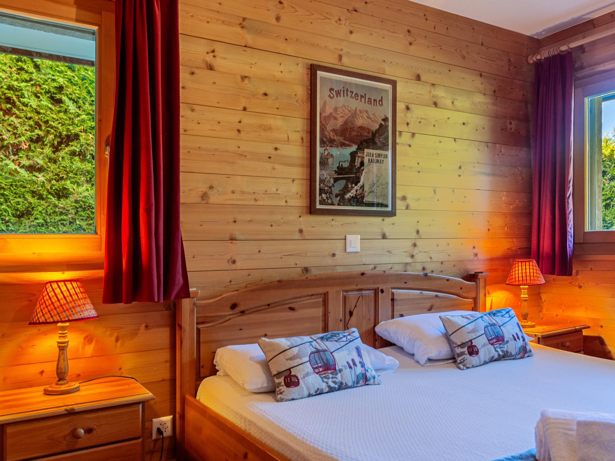 "Rêves des Alpes", 5-Zimmer-Chalet 150 m2 auf 3 Stockwerken. Geräumig, mit viel Holz eingerichtet: grosses Wohn-/Esszimmer mit offenem Kamin, Kabel-TV, Stereoanlage, DVD und E-Heizung. Ausgang zum Balkon, zur Terrasse. Offene Küche (Backofen, Geschirrspüler, 4 Glaskeramikplatten, Toaster, Wasserkocher, Mikrowelle, elektrische Kaffeemaschine, Kapseln für die Kaffeemaschine (Nespresso) extra, Racletteofen, Fondue Set (Käse)) mit Bar. Sep. WC. E-Heizung. Unteres Geschoss: 1 Zimmer mit 1 franz. Bett (180 cm, Länge 200 cm). 2 Zimmer, jedes Zimmer mit 2 Betten (90 cm, Länge 200 cm). Bad/WC, Bad/Dusche/WC. Obergeschoss: 1 grosses Zimmer mit 1 franz. Bett (160 cm, Länge 200 cm), Bad/WC. Ausgang zum Balkon. 2 Balkone, Nordlage und Westlage, kleiner Balkon, Südlage Terrasse. Terrassenmöbel, Gartengrill. Sehr schöne Sicht auf die Berge und das Tal. Zur Verfügung: Waschmaschine, Kinderhochstuhl, Haartrockner. Internet (WLAN, gratis). Parkplatz (1 Auto), Garage (2 Autos), Höhe 210 cm, Breite 240 cm. Bitte beachten: Nichtraucher-Unterkunft.
