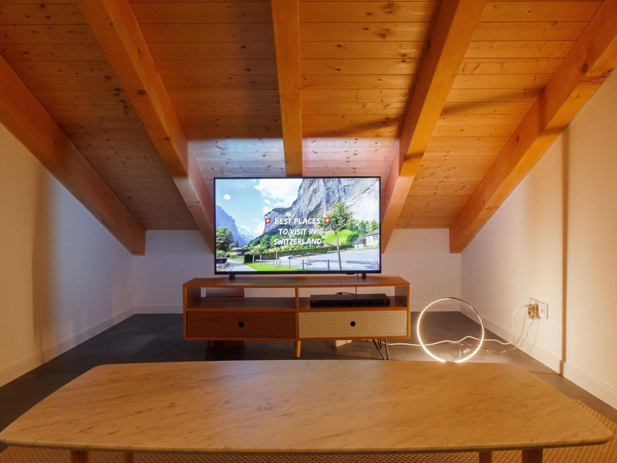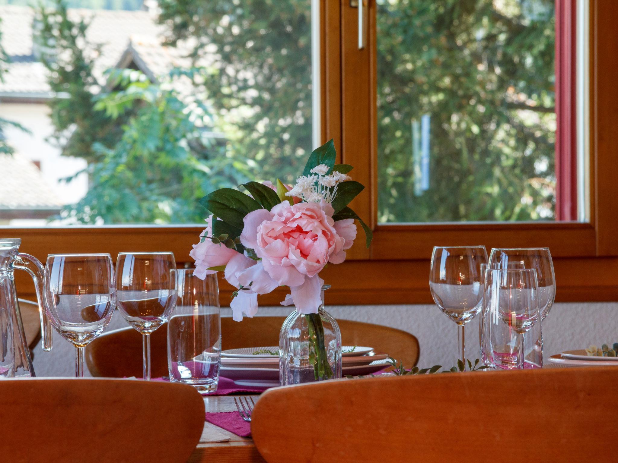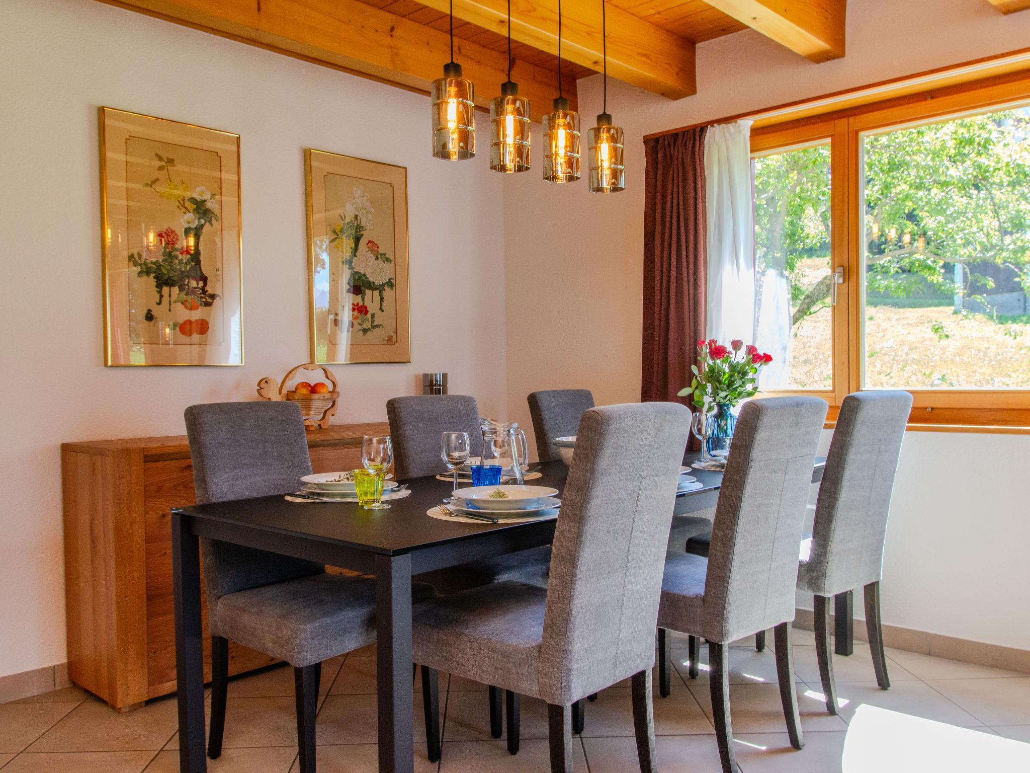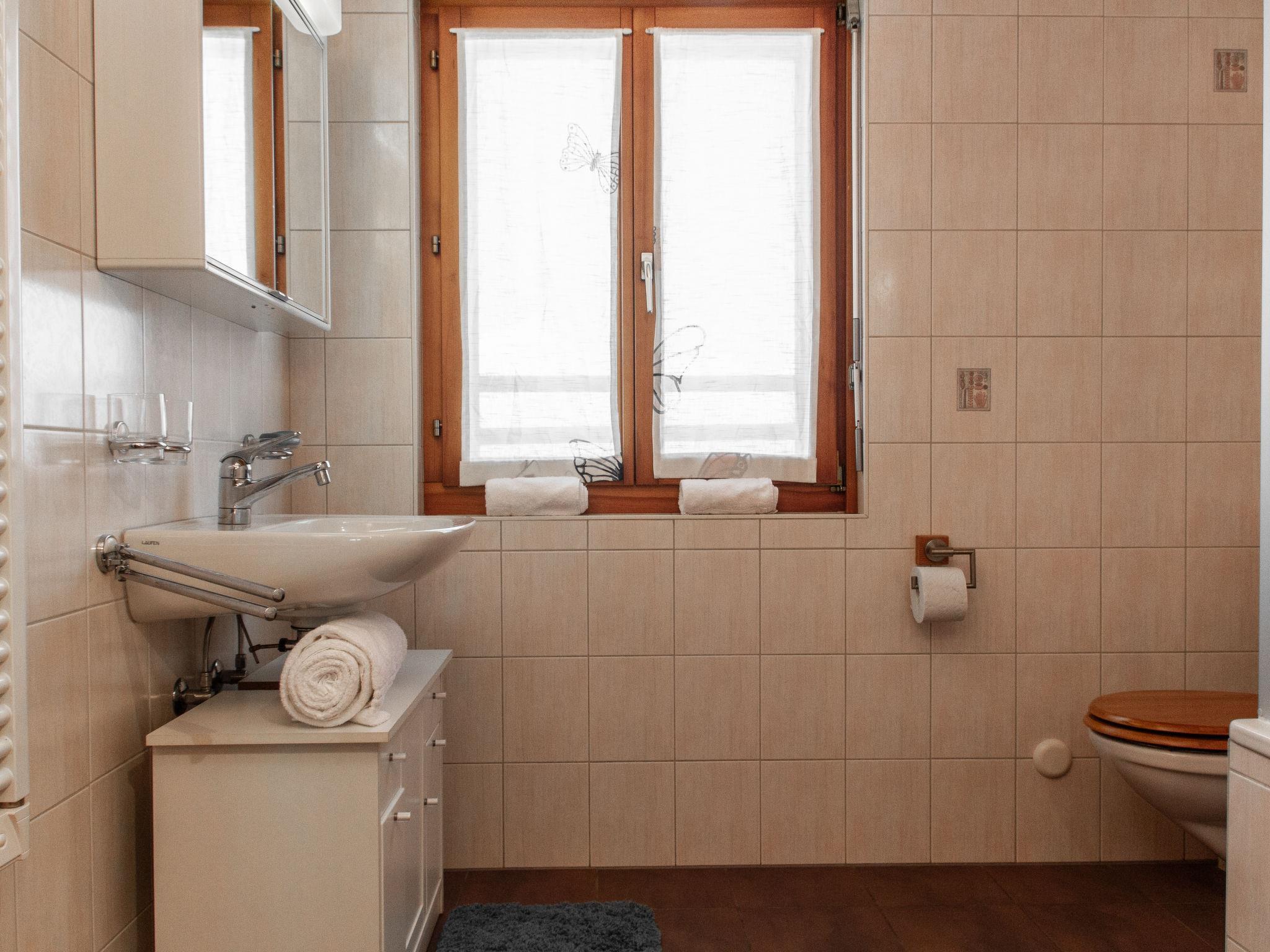 "Chalet Mirabelle", 5-Zimmer-Haus 178 m2 auf 3 Stockwerken, Nordwestlage. Geräumig, komfortabel und schön eingerichtet: Eingang. Grosses Wohnzimmer mit Esstisch und Kabel-TV. Ausgang zur Terrasse. 1 grosses Zimmer mit 1 Bett (160 cm, Länge 200 cm), Dusche/WC. Ausgang zur Terrasse. Küche (Backofen, Geschirrspüler, 4 Glaskeramikplatten, Toaster, Wasserkocher, elektrische Kaffeemaschine, Kapseln für die Kaffeemaschine (Nespresso) extra, Racletteofen, Fondue Set (Käse)) mit Esstisch. Sep. WC. E-Heizung. Unteres Geschoss: 1 Zimmer mit 2 Betten (90 cm, Länge 200 cm). Obergeschoss: 1 Zimmer mit 2 Betten (90 cm, Länge 200 cm). 1 Zimmer mit 2 Betten (90 cm, Länge 200 cm). Salon mit TV und DVD. Bad/WC. Terrasse 21 m2, Nordlage und Westlage, Garten. Balkonmöbel, Gartengrill, Wintergarten. Sehr schöne Sicht auf die Berge. Zur Verfügung: Waschmaschine, Wäschetrockner, Haartrockner. Internet (WLAN, gratis). Parkplatz (2 Autos), Garage (1 Auto). Bitte beachten: Nichtraucher-Unterkunft.