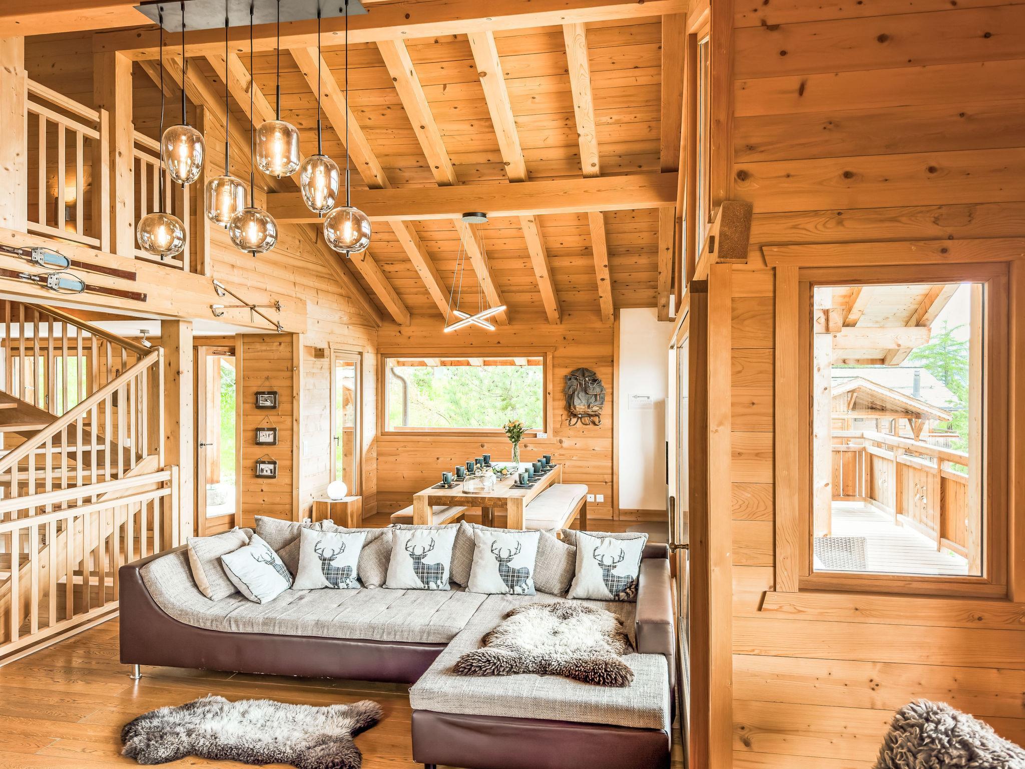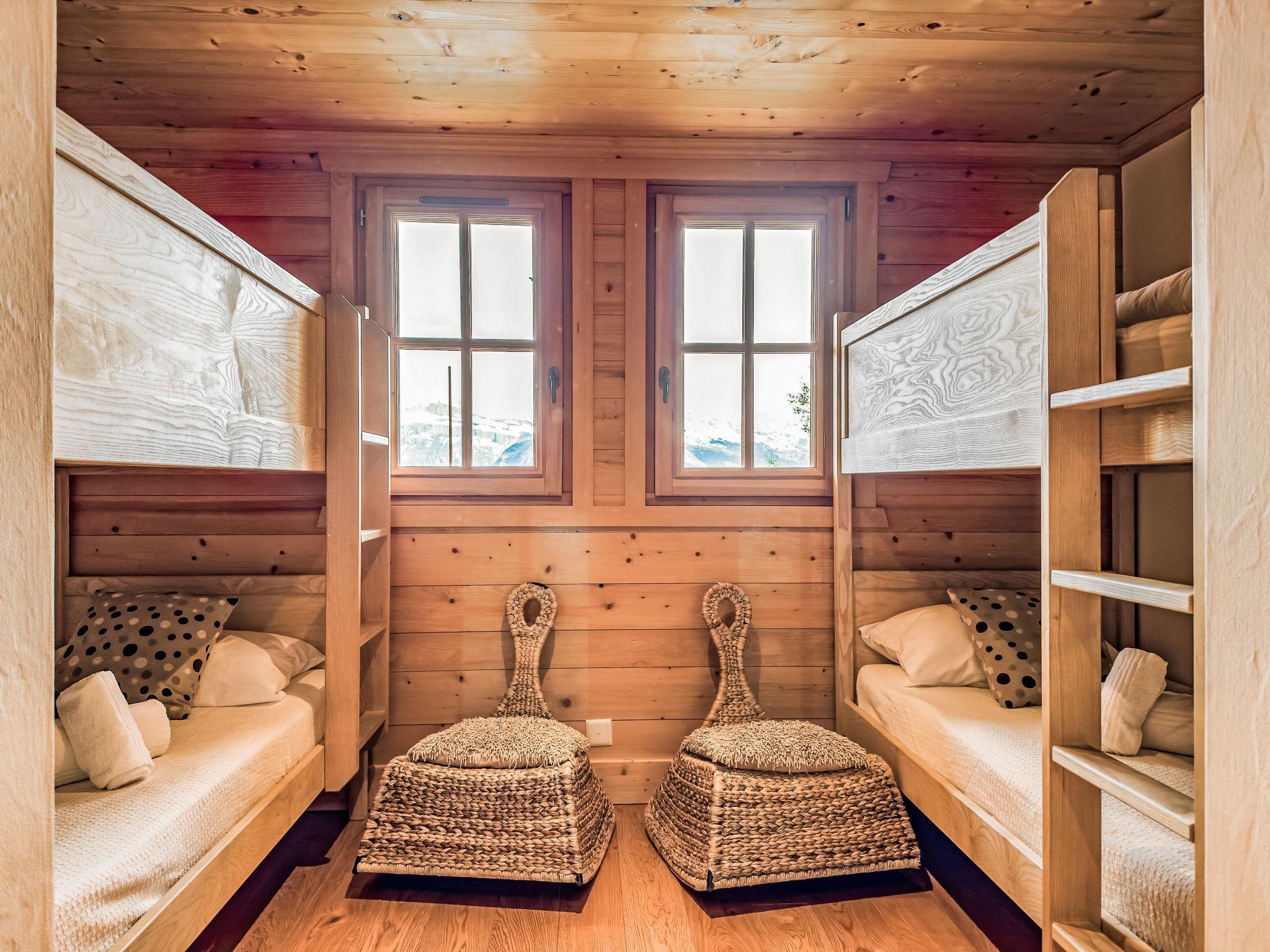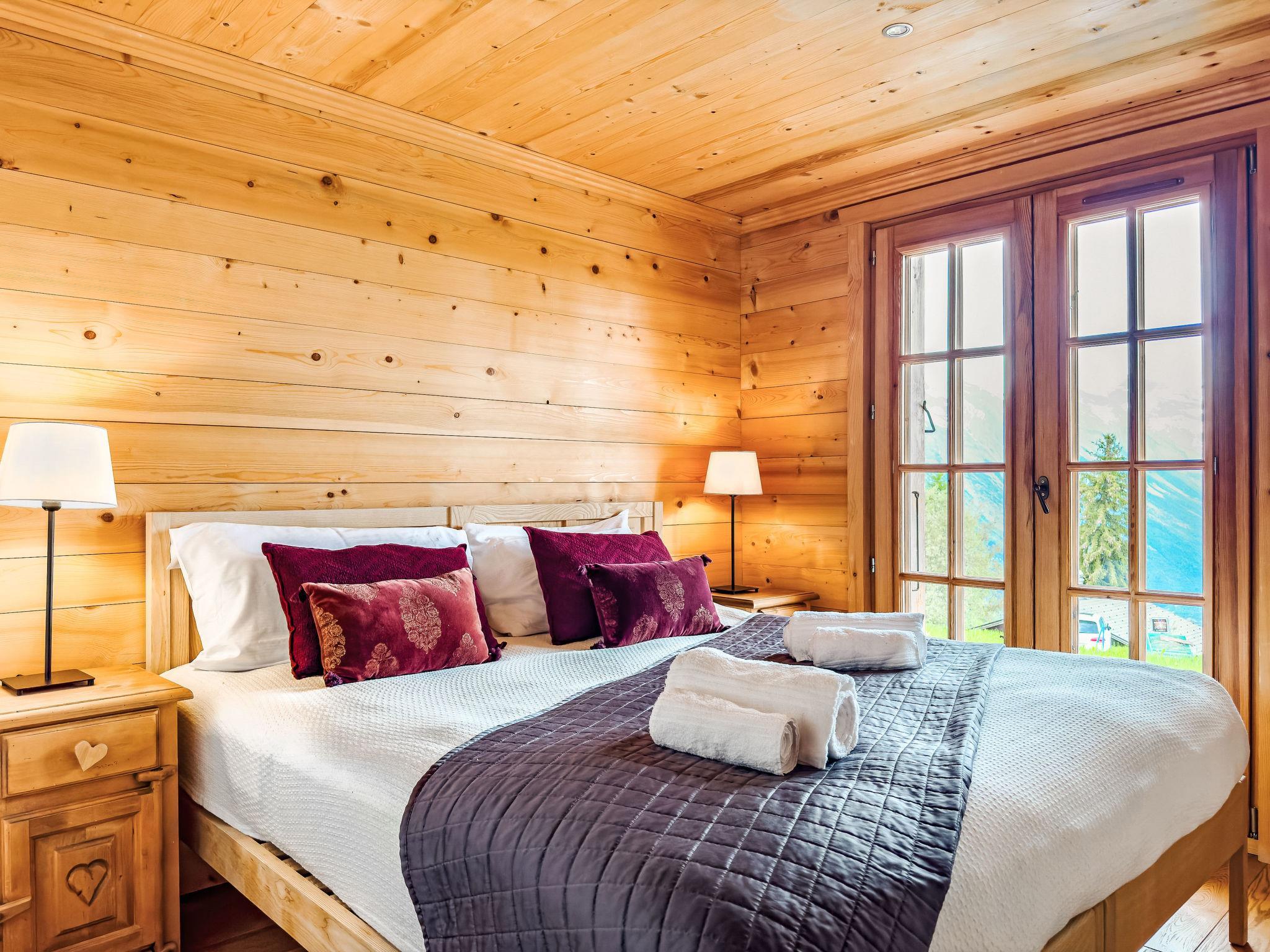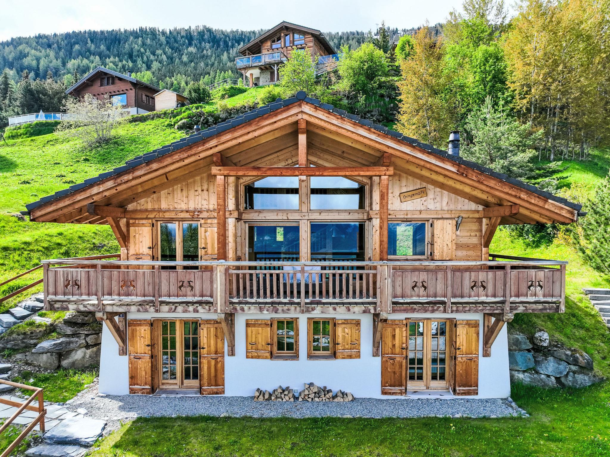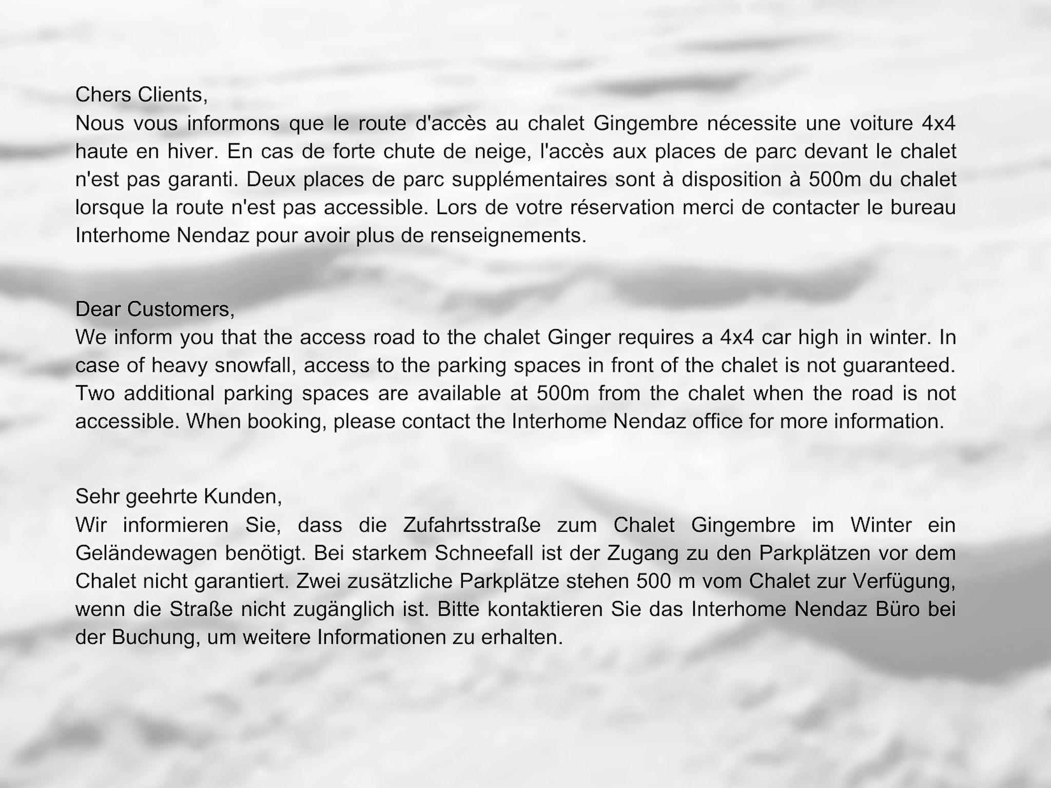 "Gingembre 12", 7-Zimmer-Chalet 250 m2 auf 3 Stockwerken. Geräumig, teilweise renoviert im Jahre 2023, komfortabel und schön eingerichtet: Eingang. Grosses Wohn-/Esszimmer 60 m2 mit Schwedenofen und Kabel-TV. Ausgang zur Terrasse. Grosse, offene Küche (Backofen, Geschirrspüler, 4 Induktionskochplatten, Toaster, Wasserkocher, Mikrowelle, Tiefkühler, elektrische Kaffeemaschine, Kapseln für die Kaffeemaschine (nespresso), Racletteofen, Fondue Set (Käse)). Unteres Geschoss: 2 Zimmer, jedes Zimmer mit 1 Doppelbett (2 x 90 cm, Länge 200 cm), Dusche/WC. Ausgang zur Terrasse. 1 Zimmer mit 2 x 2 Etagenbetten. Bad/WC. Fussbodenheizung. Obergeschoss: 1 Zimmer mit 1 Doppelbett (2 x 90 cm, Länge 200 cm), Bad/WC. Ausgang zum Balkon. 1 Zimmer mit 1 Doppelbett (2 x 90 cm, Länge 200 cm), Dusche/WC. Ausgang zum Balkon. 2 kleine Balkone, Südlage Balkon, Nordlage Terrasse, Südlage und Westlage. Gartengrill, Liegestühle (2). Sehr schöne Sicht auf die Berge und das Tal. Zur Verfügung: Waschmaschine, Wäschetrockner, Sauna, Kinderhochstuhl, Babybett bis 2 Jahre, Haartrockner. Internet (WLAN, gratis). Parkplatz (2 Autos), im Winter in 500 m. Bitte beachten: Nichtraucher-Unterkunft.