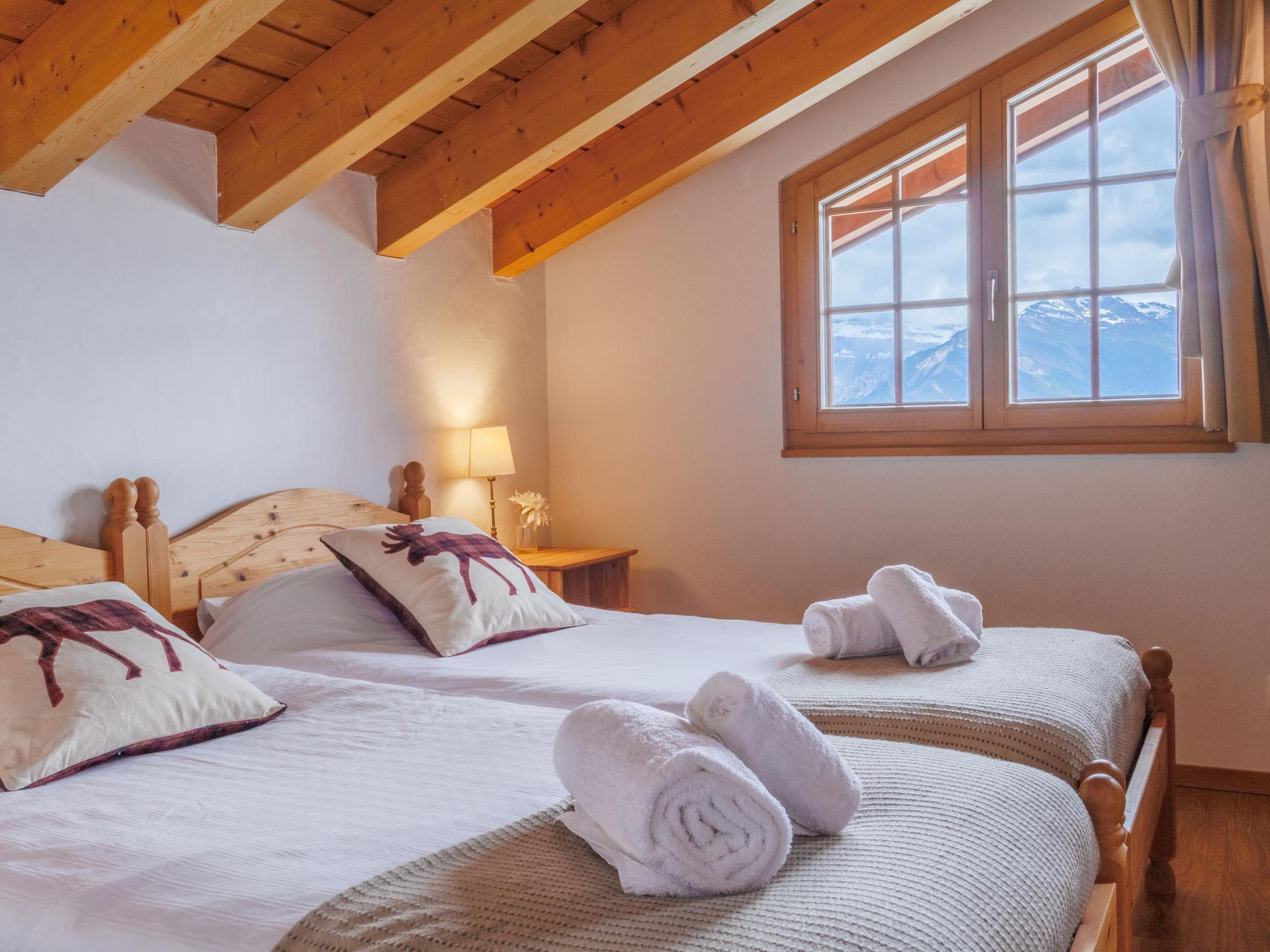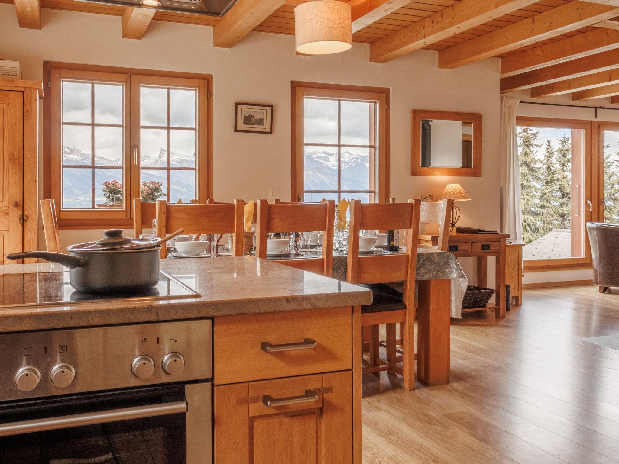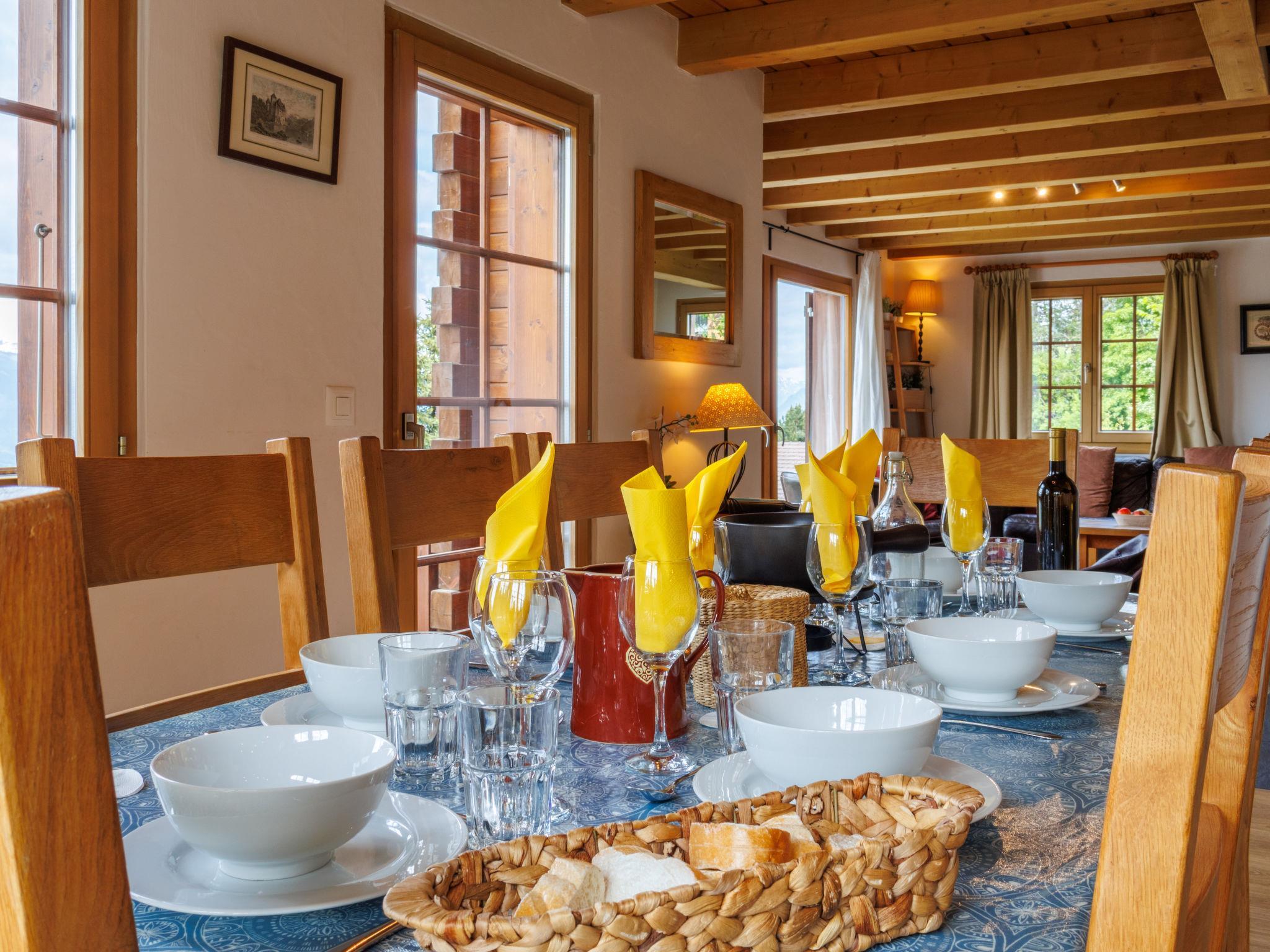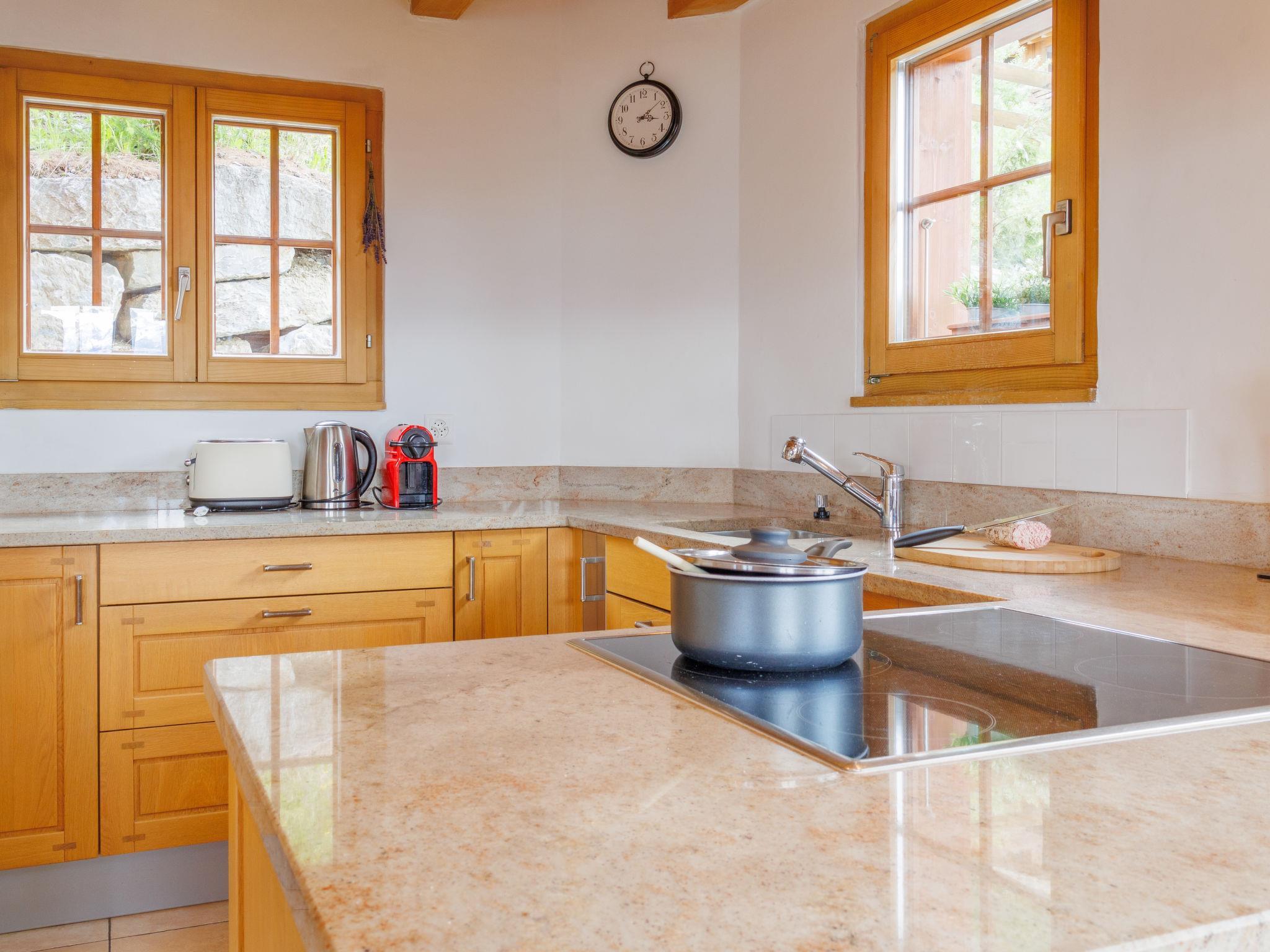 "Petit Nid", 5-Zimmer-Chalet 167 m2 auf 3 Stockwerken. Geräumig, komfortabel und schön eingerichtet: Wohn-/Esszimmer mit Schwedenofen, Kabel-TV und DVD. Ausgang zum Balkon, zur Terrasse, Richtung Norden und Richtung Westen. 1 Zimmer mit 2 Betten (90 cm, Länge 200 cm), Dusche/WC. Offene Küche (Backofen, Geschirrspüler, 4 Glaskeramikplatten, Toaster, Wasserkocher, Mikrowelle, elektrische Kaffeemaschine, Kapseln für die Kaffeemaschine (Nespresso) extra, Racletteofen, Fondue Set (Käse)). Fussbodenheizung. Unteres Geschoss: 1 Zimmer mit 2 Betten (90 cm, Länge 200 cm), Dusche/WC. Eingang. Obergeschoss: 1 grosses Zimmer mit 1 franz. Bett (160 cm, Länge 200 cm), Bad/Dusche/WC. 1 Zimmer mit 2 Betten (90 cm, Länge 200 cm), Dusche/WC. Balkon 10 m2, Nordlage, grosse Terrasse 33 m2, Westlage. Terrassenmöbel, Gartengrill, Liegestühle (2). Herrliche Panoramasicht auf die Berge, das Tal und die Ortschaft. Zur Verfügung: Waschmaschine, Wäschetrockner, Kinderhochstuhl, Babybett, Haartrockner. Internet (WLAN, gratis). Parkplatz (1 Auto), Garage (1 Auto). Bitte beachten: Nichtraucher-Haus.