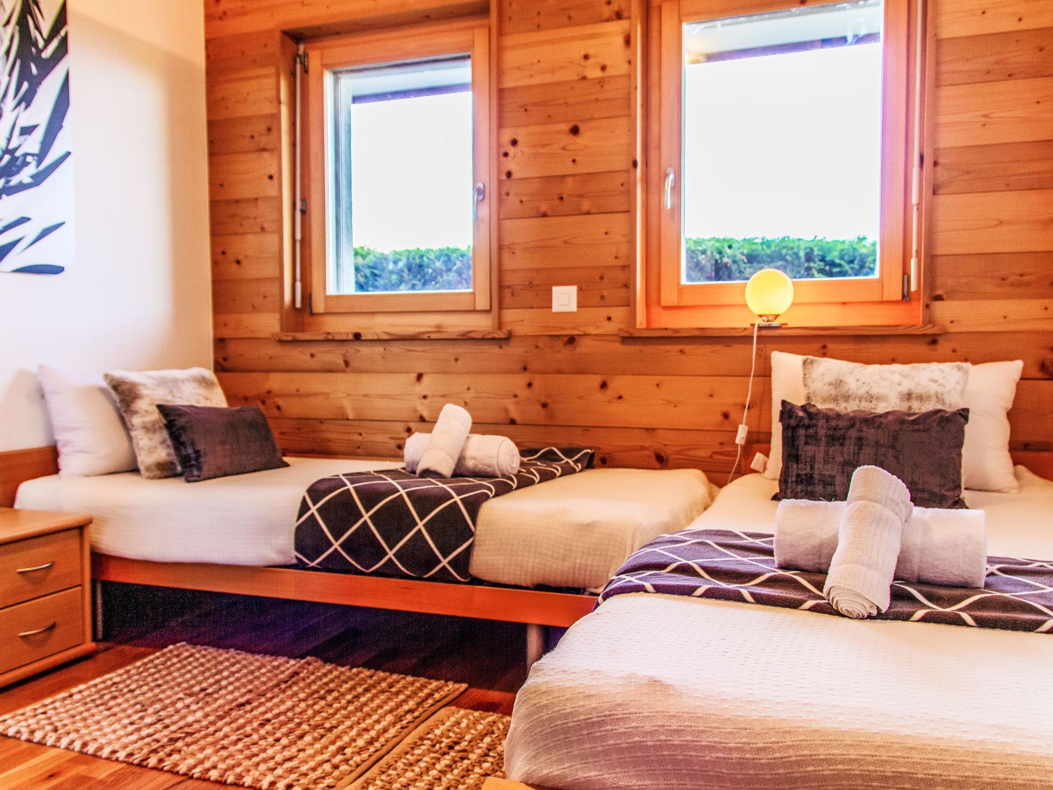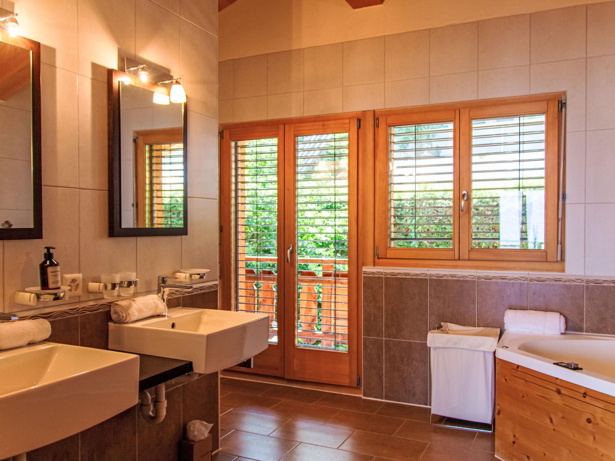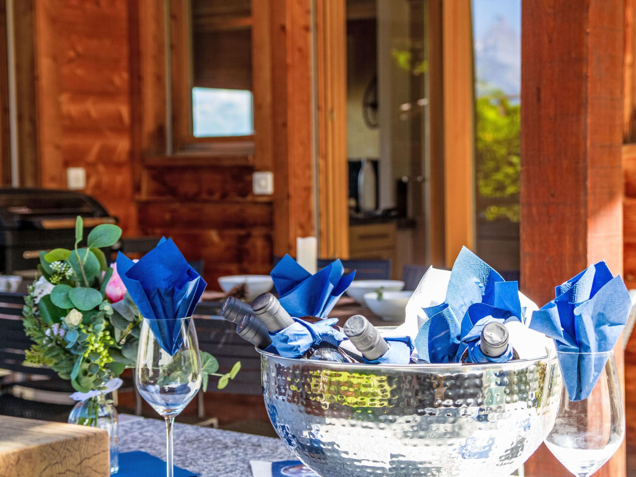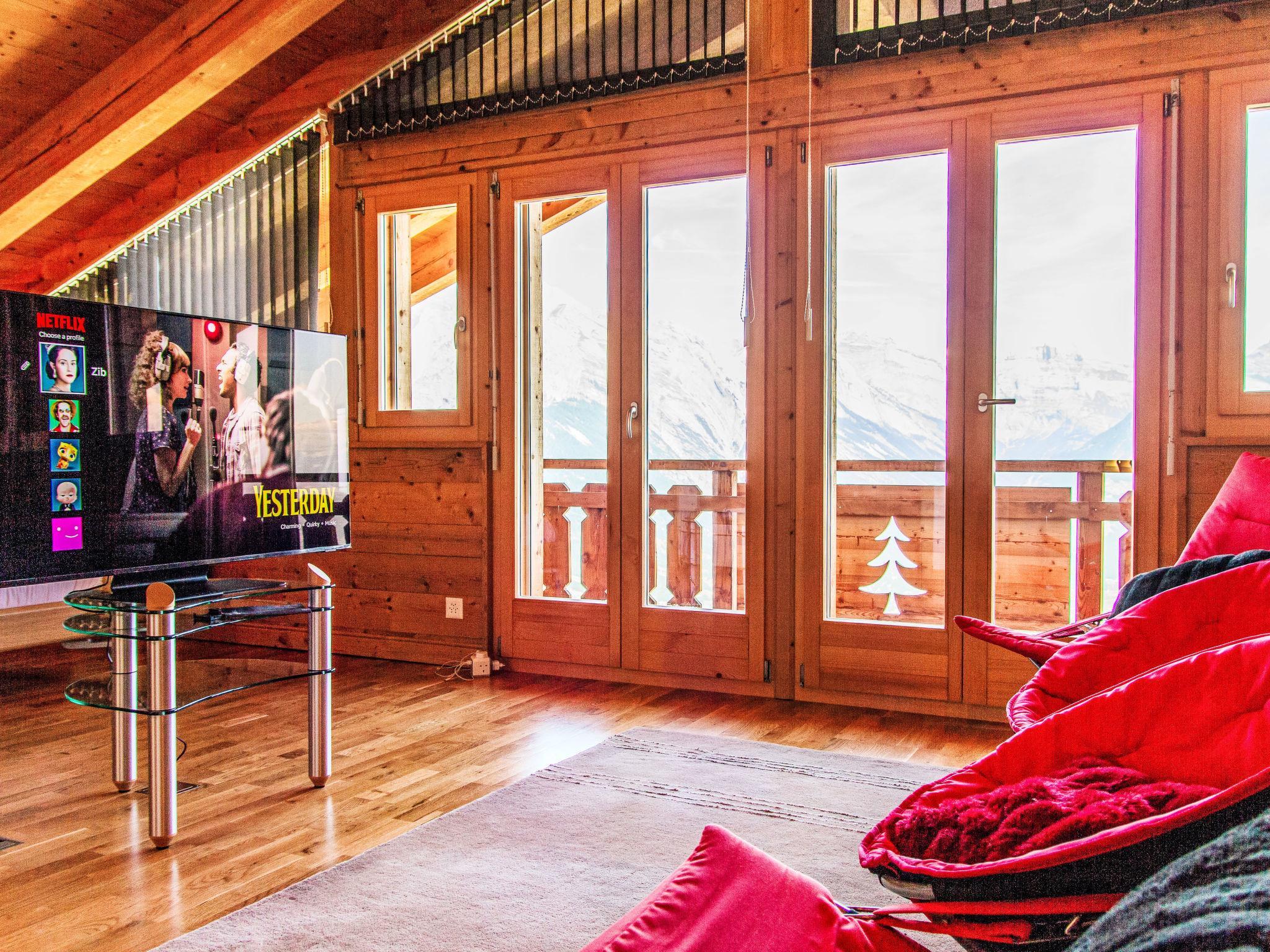 "Chalet Aurore", 5-Zimmer-Chalet 190 m2 auf 3 Stockwerken, Nordwestlage. Geräumig, komfortabel und geschmackvoll eingerichtet: Eingang. Grosses Wohn-/Esszimmer mit offenem Kamin und TV. Ausgang zum Balkon, Richtung Norden. Offene Küche (Backofen, Geschirrspüler, 4 Glaskeramikplatten, Toaster, Wasserkocher, Mikrowelle, Tiefkühler, elektrische Kaffeemaschine, Kapseln für die Kaffeemaschine (Nespresso) extra, Racletteofen, Fondue Set (Käse)). Ausgang zur Terrasse. Sep. WC. E-Heizung. Unteres Geschoss: 2 kleine Zimmer, jedes Zimmer mit 2 Betten (90 cm, Länge 200 cm). 1 Zimmer mit 1 franz. Bett (180 cm, Länge 200 cm), Dusche/WC und Doppelwaschbecken. Bad/WC, Dusche. Obergeschoss: 1 grosses Zimmer mit 1 franz. Bett (180 cm, Länge 200 cm), Bad/Dusche/WC, Doppelwaschbecken, mit Eckbadewanne und TV. Ausgang zum Balkon, Richtung Norden. Balkon, Nordlage, Terrasse, Ostlage. Terrassenmöbel, Balkonmöbel, Gartengrill, Liegestühle (4). Herrliche Sicht auf die Berge. Zur Verfügung: Waschmaschine, Wäschetrockner, Kinderhochstuhl, Babybett. Internet (WLAN, gratis). Garage (2 Autos). Bitte beachten: Nichtraucher-Unterkunft.