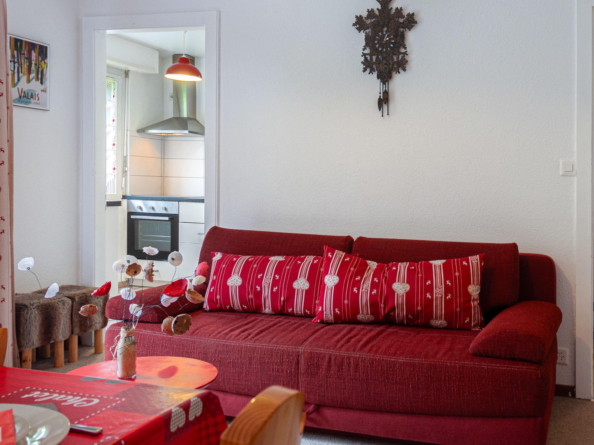 "Clair Matin 20", 2-Zimmer-Wohnung 47 m2 im 1. Stock. Objekt geeignet für 2 Erwachsene + 2 Kinder. Hell, vollständig renoviert im Jahre 2016, schön und geschmackvoll eingerichtet: Wohn-/Esszimmer mit Kabel-TV. Ausgang zum Balkon, Richtung Süden. 1 grosses Zimmer, Richtung Süden mit 1 x 2 Etagenbetten (90 cm, Länge 190 cm), 1 franz. Bett (160 cm, Länge 200 cm), Kabel-TV. Offene Küche (Backofen, Geschirrspüler, 3 Induktionskochplatten, Toaster, Wasserkocher, Mikrowelle, elektrische Kaffeemaschine, Kapseln für die Kaffeemaschine (nespresso) extra, Racletteofen, Fondue Set (Käse)). Dusche/WC. Balkon 5 m2, Südlage. Balkonmöbel. Eingeschränkte Sicht auf die Berge. Zur Verfügung: Internet (WLAN, gratis). Bitte beachten: Nichtraucher-Unterkunft. Maximal 1 Haustier/Hund erlaubt.