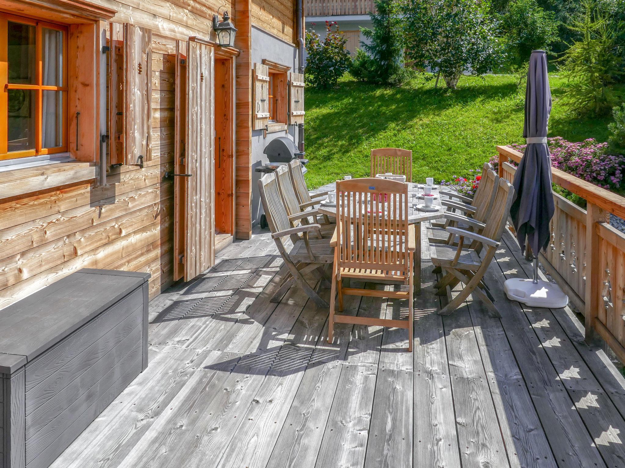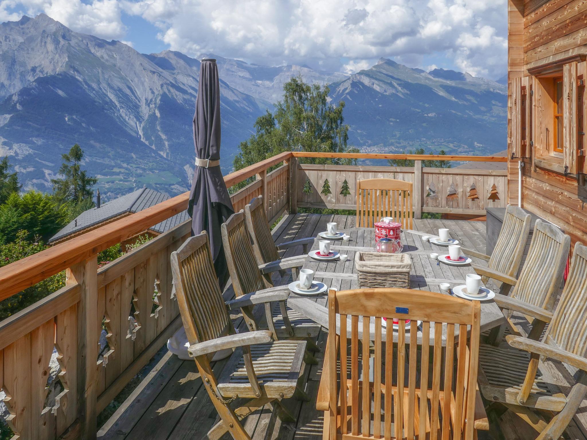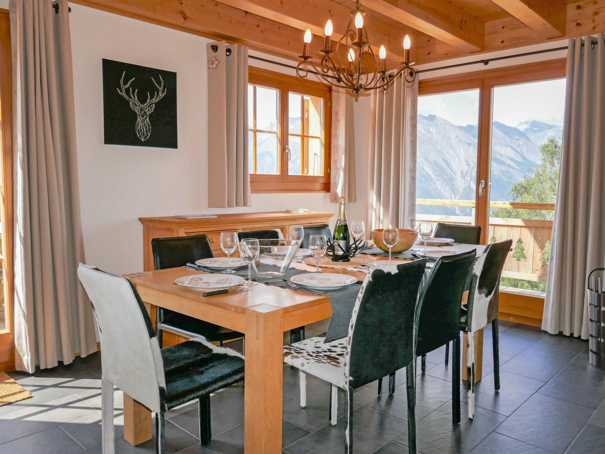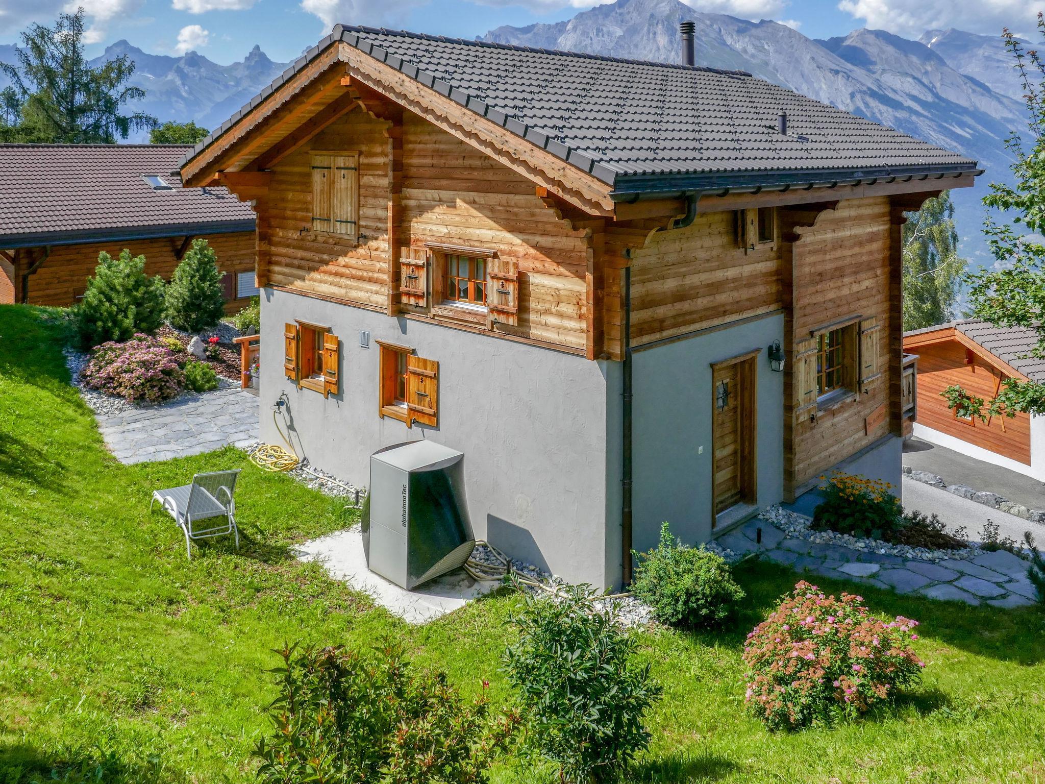 "Le Muveran V8", 5-Zimmer-Chalet 184 m2 auf 3 Stockwerken. Geräumig und hell, schön und geschmackvoll eingerichtet: Eingang. Wohn-/Esszimmer mit offenem Kamin, Kabel-TV und Radio. Ausgang zum Balkon, zur Terrasse, Richtung Norden und Richtung Westen. Offene Küche (Backofen, Geschirrspüler, 4 Glaskeramikplatten, Toaster, Wasserkocher, Mikrowelle, elektrische Kaffeemaschine, Kapseln für die Kaffeemaschine (nespresso) extra, Racletteofen, Fondue Set (Chinoise, Käse)). Sep. WC. Heizung. Unteres Geschoss: Eingang. 1 Zimmer mit 1 franz. Bett (160 cm, Länge 200 cm). 1 Zimmer mit 2 Betten (90 cm, Länge 200 cm). Dusche/WC. Obergeschoss: 1 Zimmer mit 1 franz. Bett (160 cm, Länge 200 cm). Ausgang zum Balkon, Richtung Norden. 1 Zimmer mit 2 Betten (90 cm, Länge 200 cm). Ausgang zum Balkon, Richtung Norden. Bad/Dusche/WC. Balkon, Nordlage Terrasse 27 m2, Westlage, Garten, Südlage. Terrassenmöbel, Gartengrill, Liegestühle (2). Sehr schöne Sicht auf die Berge. Zur Verfügung: Waschmaschine, Wäschetrockner, Kinderhochstuhl, Babybett, Haartrockner. Internet (WLAN, gratis). Parkplatz (3 Autos). Bitte beachten: Nichtraucher-Unterkunft.