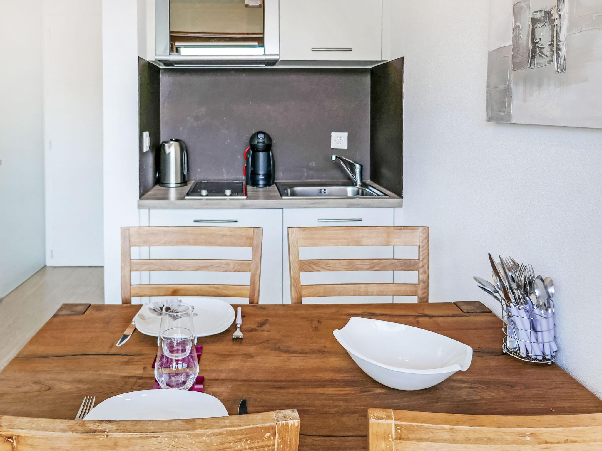 "Grenier 5", 1-Zimmer-Studio 20 m2 im 2. Stock. Eingang. Wohn-/Esszimmer mit 1 franz. Wandschrankbett (150 cm, Länge 200 cm). Ausgang zum Balkon, Richtung Norden. Kochnische (2 Glaskeramikplatten, Mikrowelle, elektrische Kaffeemaschine, Kapseln für die Kaffeemaschine (Dolce Gusto) extra, Racletteofen). Dusche/WC. Balkon, Nordlage. Balkonmöbel. Schöne Sicht auf die Berge und das Tal. Zur Verfügung: Haartrockner. Internet (Wireless LAN, gratis). Parkplatz Nr. 1. Bitte beachten: Nichtraucher-Unterkunft. 1 kleines Haustier/Hund erlaubt.