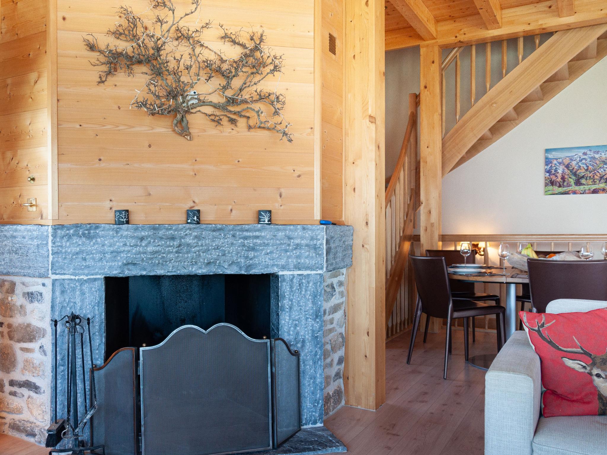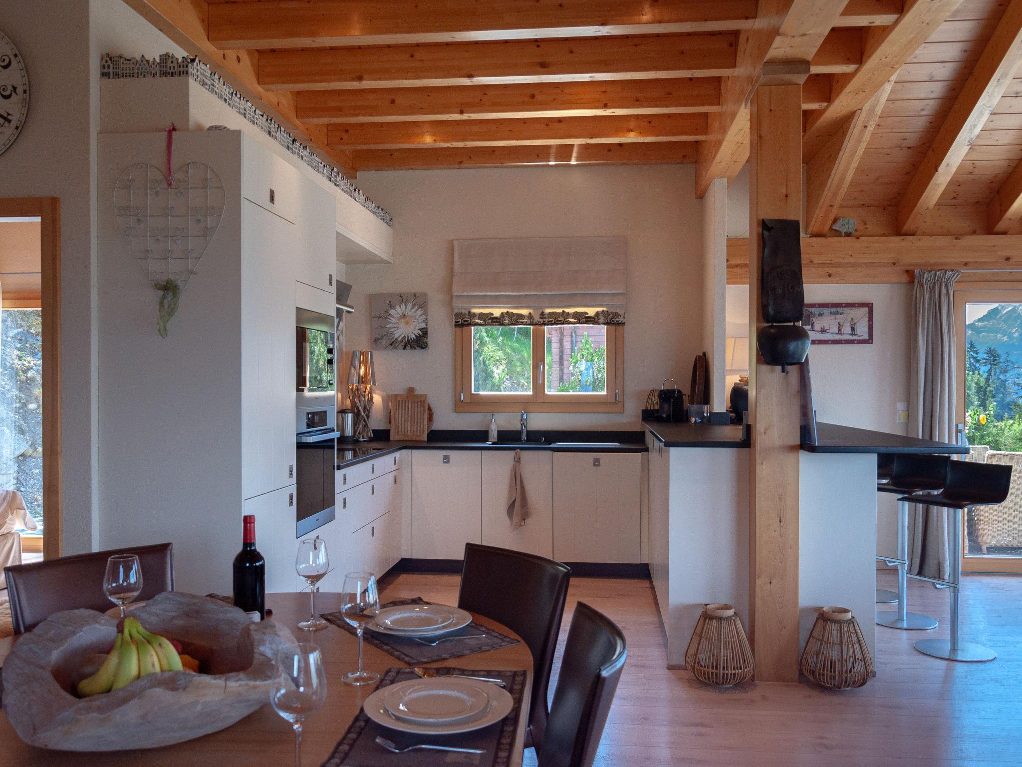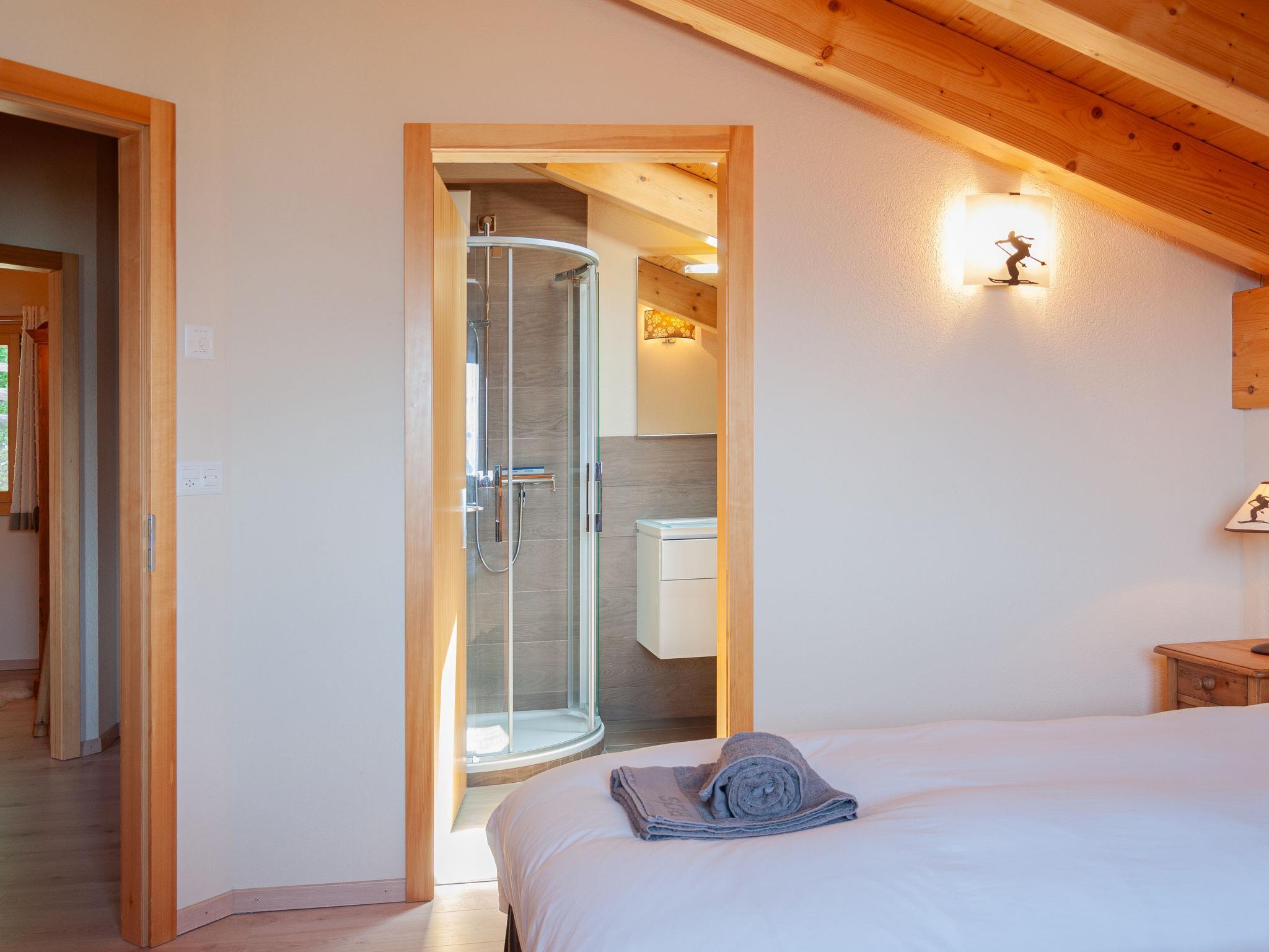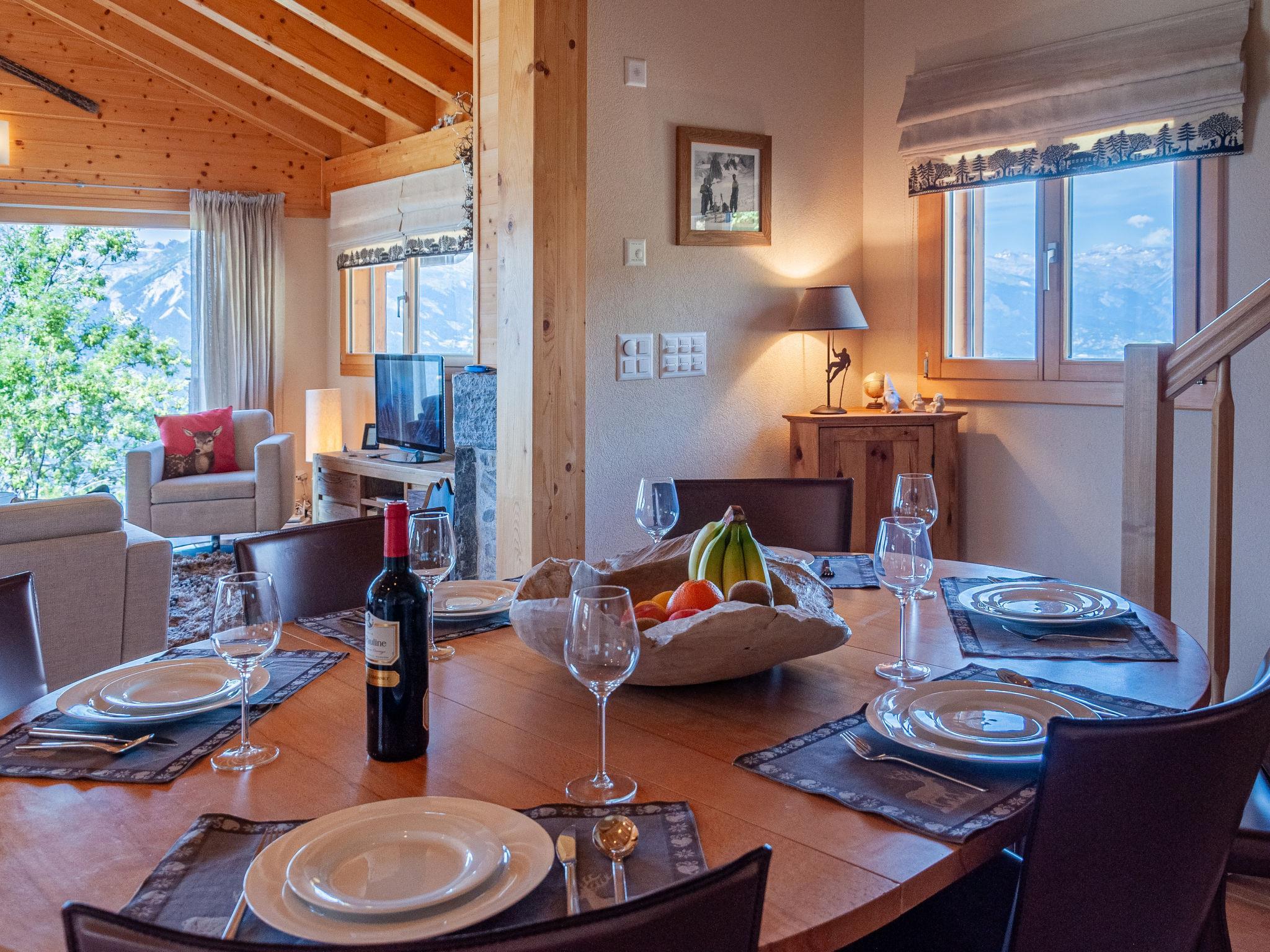 "Bonâme", 5-Zimmer-Chalet 188 m2. Geräumig, geschmackvoll und gemütlich eingerichtet: grosses Wohn-/Esszimmer mit offenem Kamin und Kabel-TV. Ausgang zur Terrasse, Richtung Norden und Richtung Westen. 1 Zimmer mit 1 Doppelbett (2 x 90 cm, Länge 210 cm), Dusche/WC und Doppelwaschbecken. Ausgang zur Terrasse. Grosse, offene Küche (Backofen, Geschirrspüler, 5 Induktionskochplatten, Toaster, Wasserkocher, Mikrowelle, Tiefkühler, elektrische Kaffeemaschine, Kapseln für die Kaffeemaschine (Nespresso) extra, Racletteofen, Fondue Set (Chinoise, Käse)) mit Bar. Unteres Geschoss: grosser Eingang. Sep. WC. Obergeschoss: 1 Zimmer mit 2 Betten (90 cm, Länge 210 cm), Dusche/WC. 2 Zimmer, jedes Zimmer mit 2 Betten (90 cm, Länge 210 cm). Bad/Dusche/WC. Grosse Terrasse, Nordlage und Westlage. Terrassenmöbel, Liegestühle (2). Sehr schöne Panoramasicht auf die Berge. Zur Verfügung: Waschmaschine, Wäschetrockner. Internet (Wireless LAN, gratis). Parkplatz, Garage (2 Autos), Höhe 220 cm, Breite 520 cm. Bitte beachten: für Kleinkinder nicht geeignet nicht geeignet für Kinder unter 6 Jahren. Nichtraucher-Unterkunft.