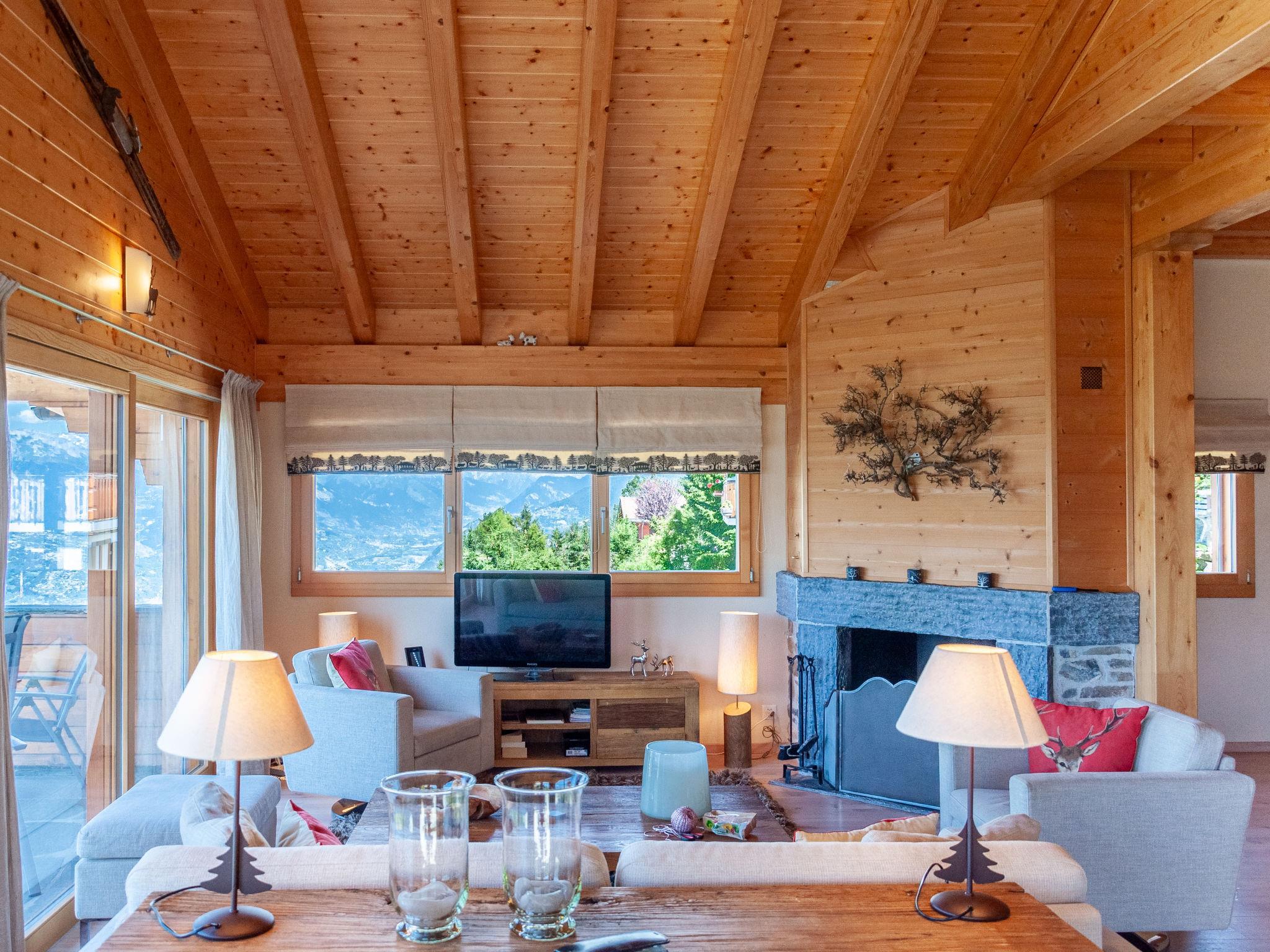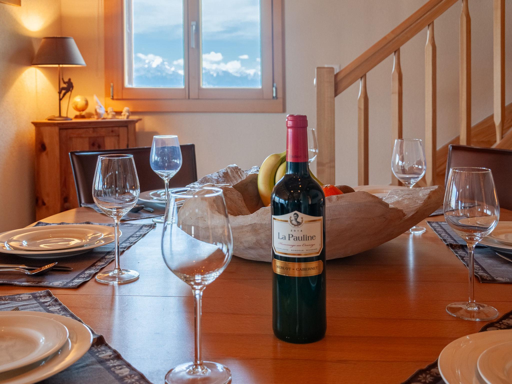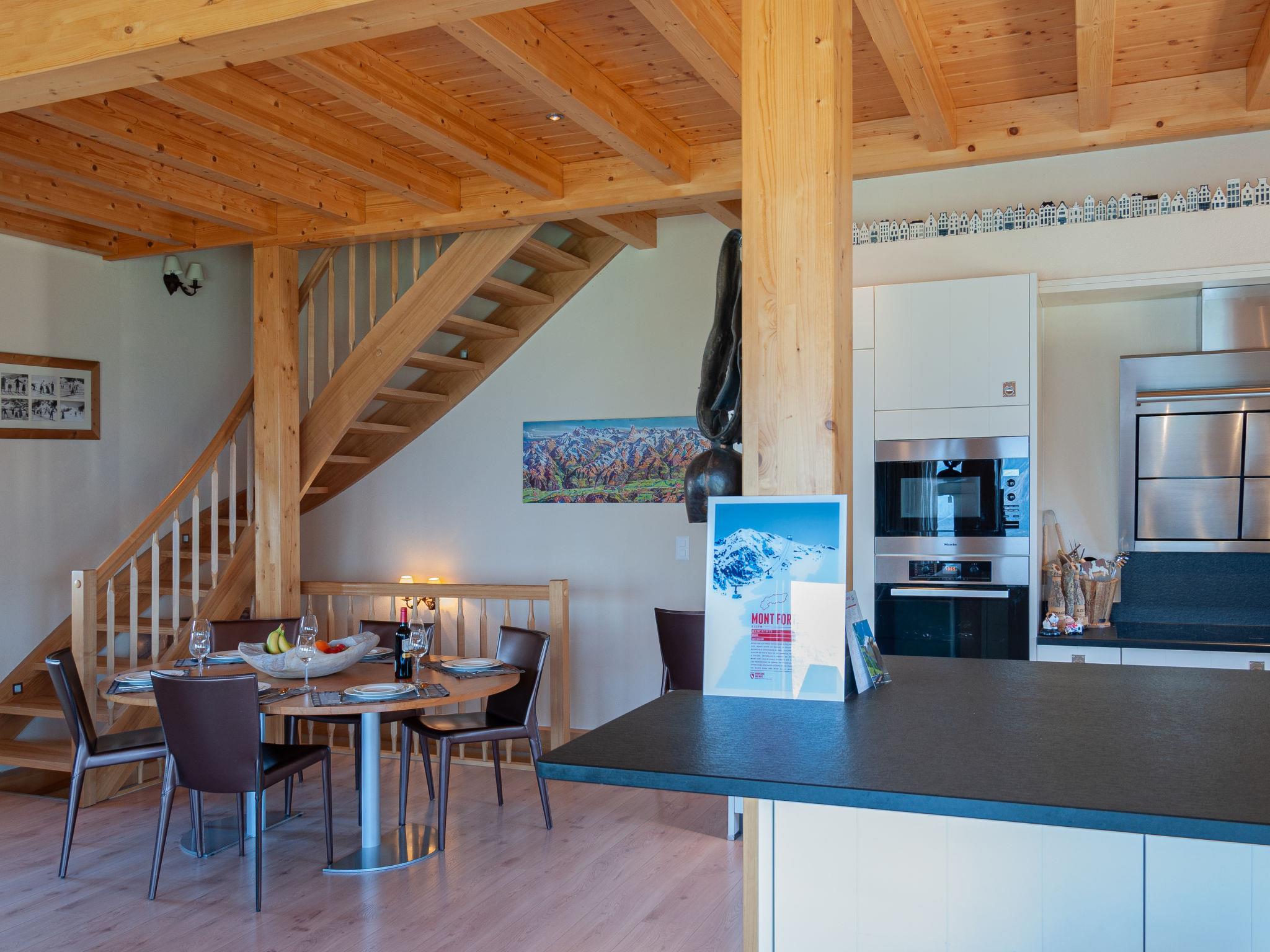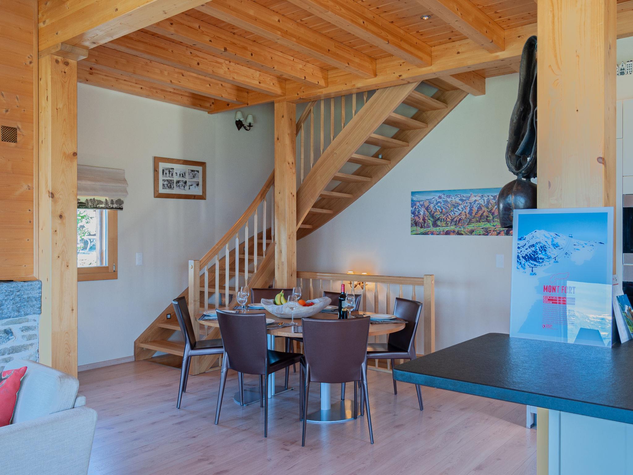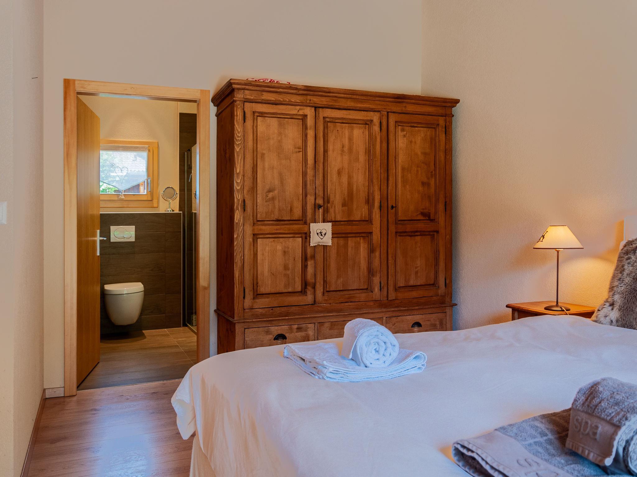 "Bonâme", 5-Zimmer-Chalet 188 m2. Geräumig, geschmackvoll und gemütlich eingerichtet: grosses Wohn-/Esszimmer mit offenem Kamin und Kabel-TV. Ausgang zur Terrasse, Richtung Norden und Richtung Westen. 1 Zimmer mit 1 Doppelbett (2 x 90 cm, Länge 210 cm), Dusche/WC und Doppelwaschbecken. Ausgang zur Terrasse. Grosse, offene Küche (Backofen, Geschirrspüler, 5 Induktionskochplatten, Toaster, Wasserkocher, Mikrowelle, Tiefkühler, elektrische Kaffeemaschine, Kapseln für die Kaffeemaschine (Nespresso) extra, Racletteofen, Fondue Set (Chinoise, Käse)) mit Bar. Unteres Geschoss: grosser Eingang. Sep. WC. Obergeschoss: 1 Zimmer mit 2 Betten (90 cm, Länge 210 cm), Dusche/WC. 2 Zimmer, jedes Zimmer mit 2 Betten (90 cm, Länge 210 cm). Bad/Dusche/WC. Grosse Terrasse, Nordlage und Westlage. Terrassenmöbel, Liegestühle (2). Sehr schöne Panoramasicht auf die Berge. Zur Verfügung: Waschmaschine, Wäschetrockner. Internet (Wireless LAN, gratis). Parkplatz, Garage (2 Autos), Höhe 220 cm, Breite 520 cm. Bitte beachten: für Kleinkinder nicht geeignet nicht geeignet für Kinder unter 6 Jahren. Nichtraucher-Unterkunft.