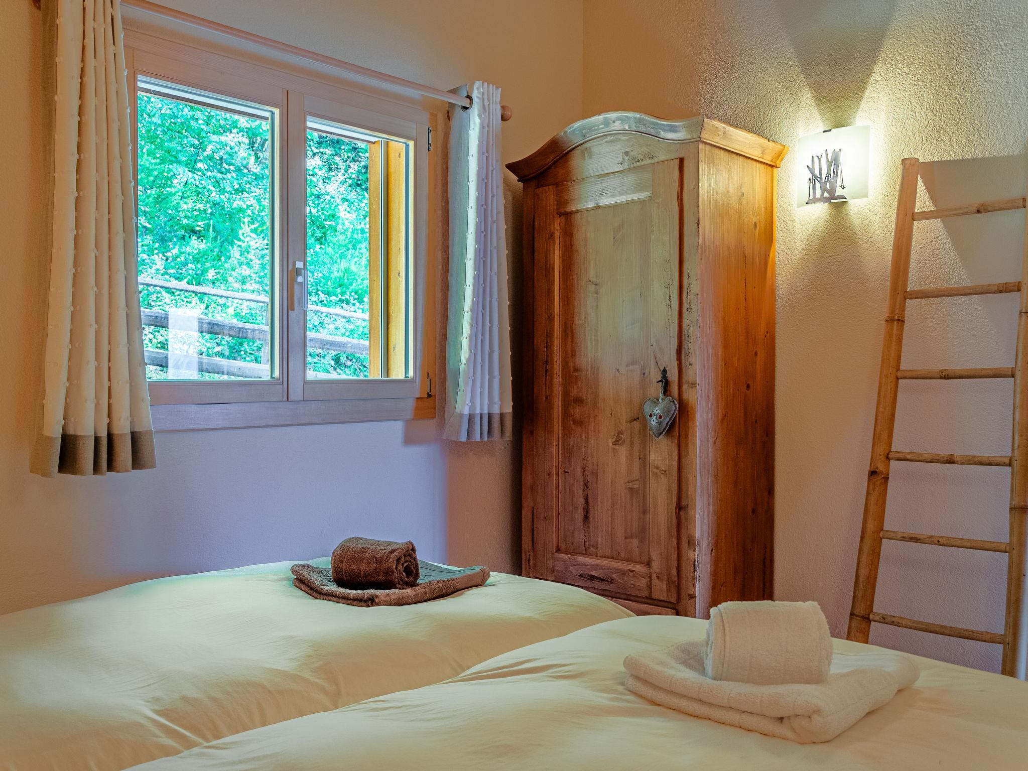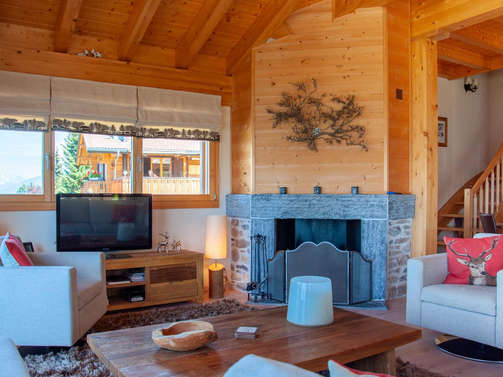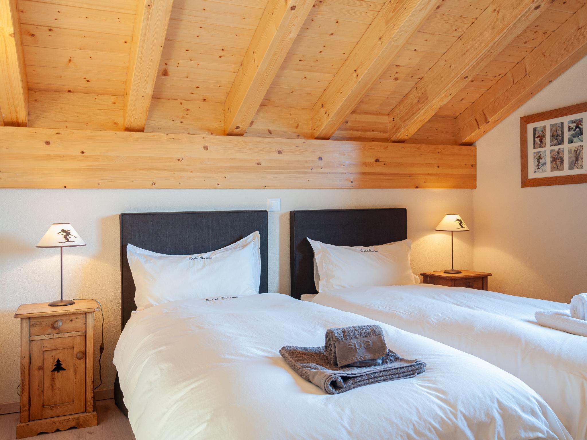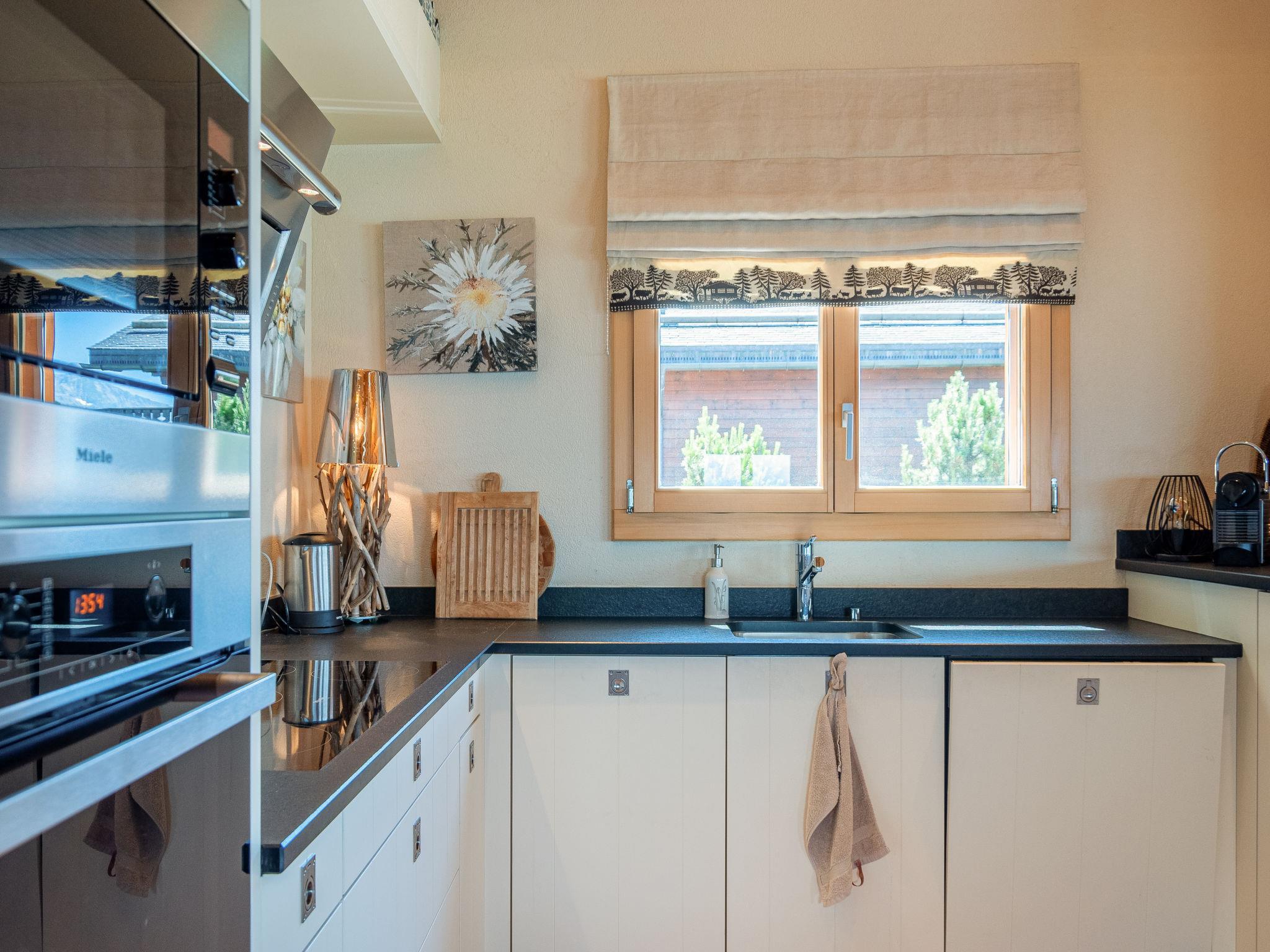 "Bonâme", 5-Zimmer-Chalet 188 m2. Geräumig, geschmackvoll und gemütlich eingerichtet: grosses Wohn-/Esszimmer mit offenem Kamin und Kabel-TV. Ausgang zur Terrasse, Richtung Norden und Richtung Westen. 1 Zimmer mit 1 Doppelbett (2 x 90 cm, Länge 210 cm), Dusche/WC und Doppelwaschbecken. Ausgang zur Terrasse. Grosse, offene Küche (Backofen, Geschirrspüler, 5 Induktionskochplatten, Toaster, Wasserkocher, Mikrowelle, Tiefkühler, elektrische Kaffeemaschine, Kapseln für die Kaffeemaschine (Nespresso) extra, Racletteofen, Fondue Set (Chinoise, Käse)) mit Bar. Unteres Geschoss: grosser Eingang. Sep. WC. Obergeschoss: 1 Zimmer mit 2 Betten (90 cm, Länge 210 cm), Dusche/WC. 2 Zimmer, jedes Zimmer mit 2 Betten (90 cm, Länge 210 cm). Bad/Dusche/WC. Grosse Terrasse, Nordlage und Westlage. Terrassenmöbel, Liegestühle (2). Sehr schöne Panoramasicht auf die Berge. Zur Verfügung: Waschmaschine, Wäschetrockner. Internet (Wireless LAN, gratis). Parkplatz, Garage (2 Autos), Höhe 220 cm, Breite 520 cm. Bitte beachten: für Kleinkinder nicht geeignet nicht geeignet für Kinder unter 6 Jahren. Nichtraucher-Unterkunft.