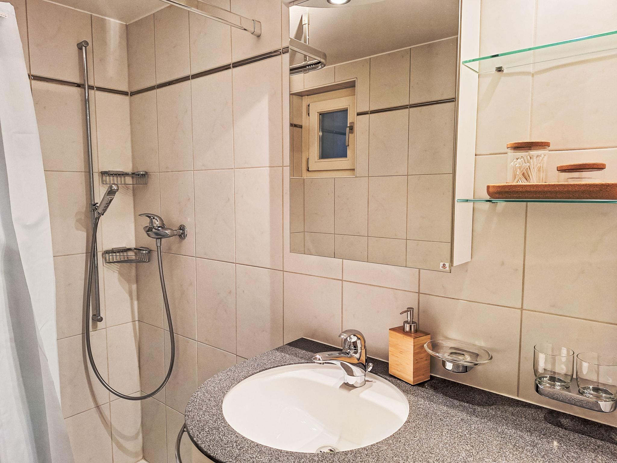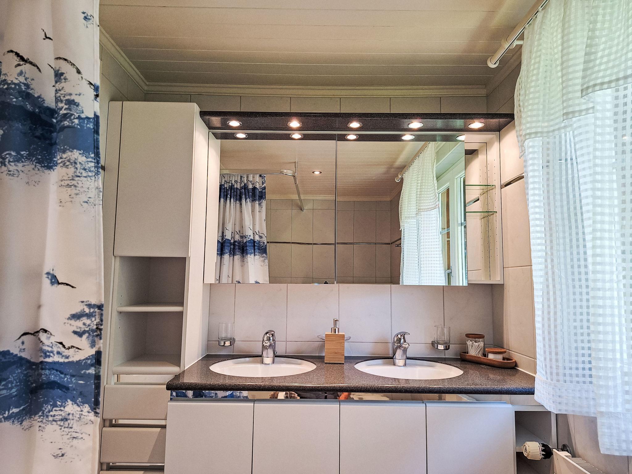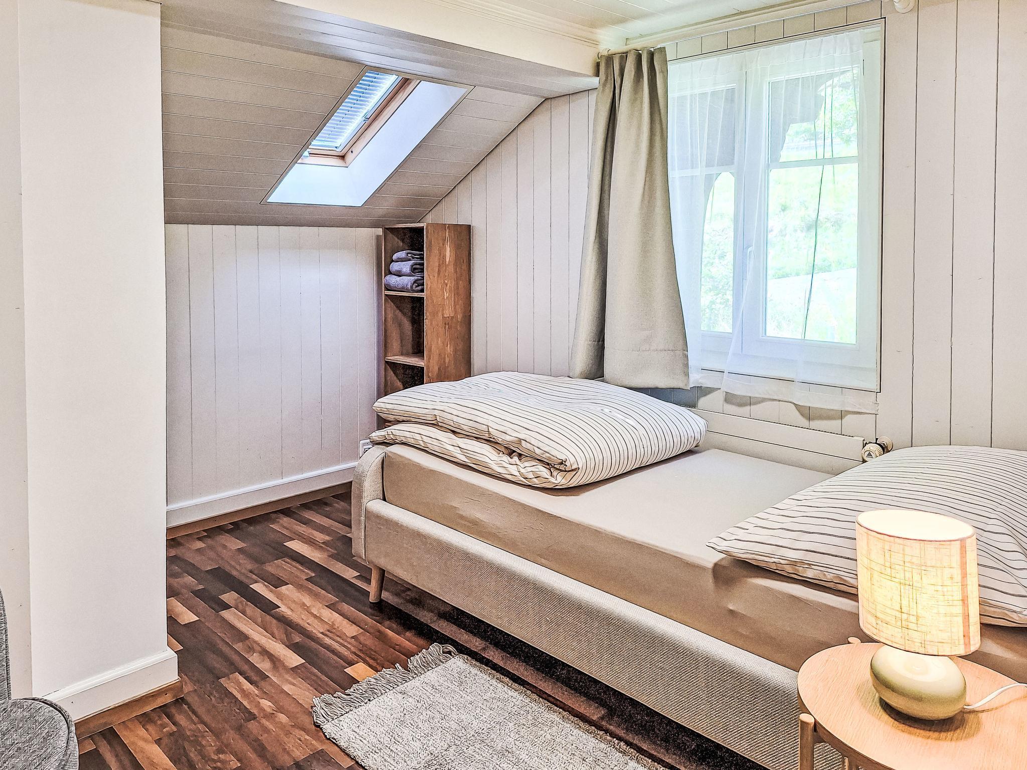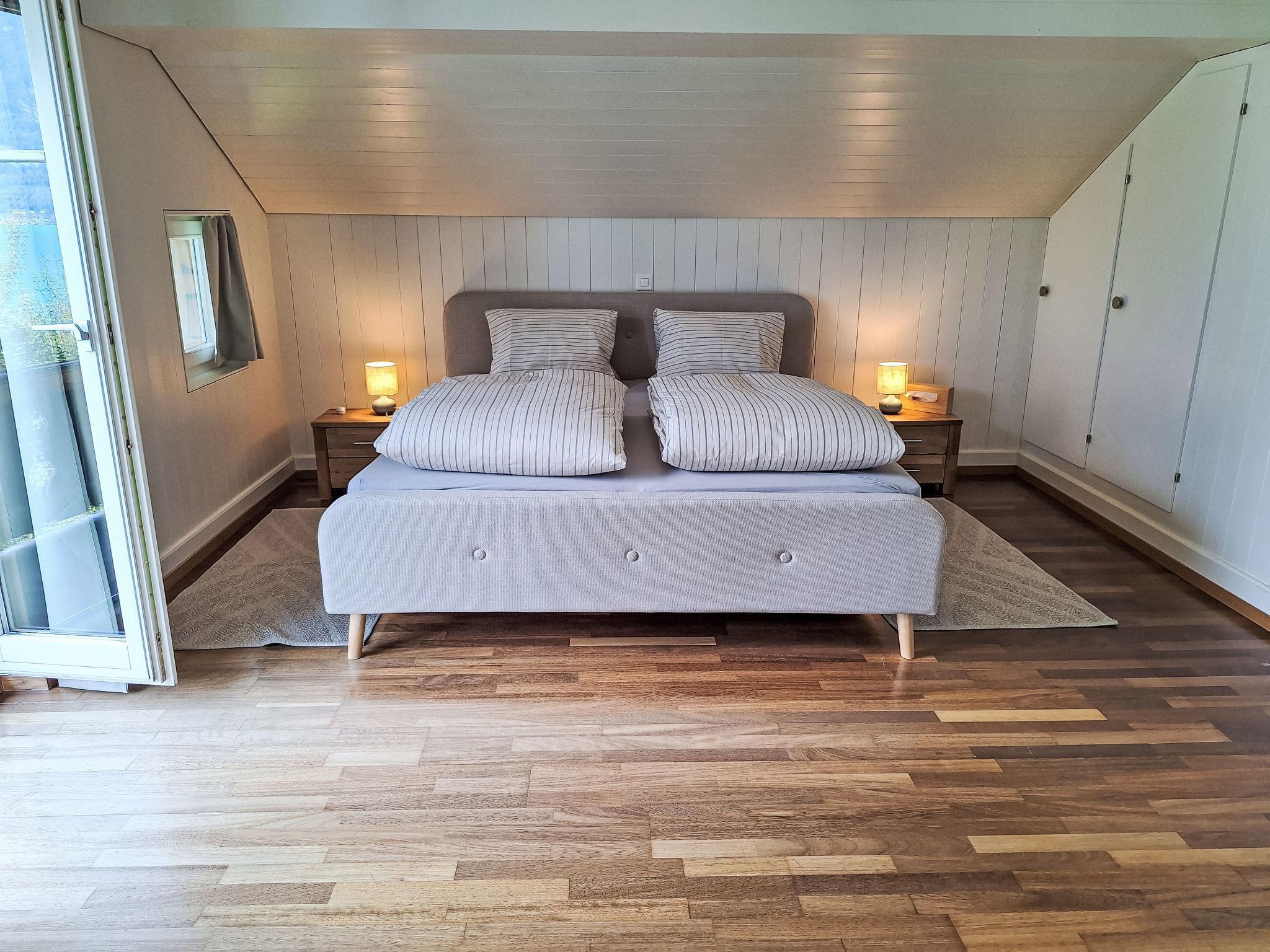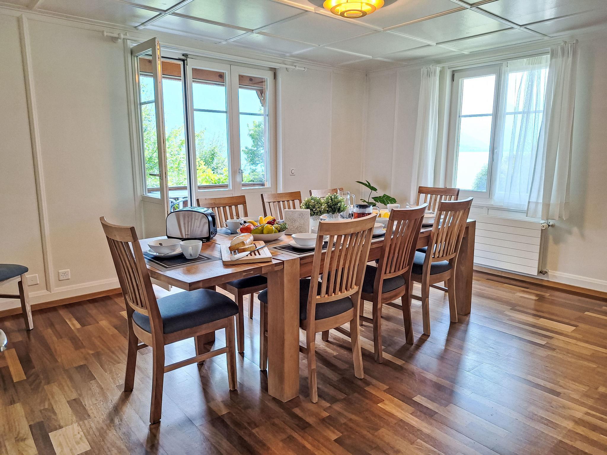 7-Zimmer-Chalet auf 3 Stockwerken. Geräumig und hell, komfortabel und gemütlich eingerichtet: Wohnzimmer mit Schwedenofen und Kabel-TV. Offenes Esszimmer mit Schiebetür. Ausgang zum Balkon. Küche (Backofen, Geschirrspüler, 4 Glaskeramikplatten, Toaster, Wasserkocher, Mikrowelle, elektrische Kaffeemaschine, Kapseln für die Kaffeemaschine (Nespresso) extra, Racletteofen). Ausgang zum Balkon. Sep. WC. Unteres Geschoss: 2 Zimmer, jedes Zimmer mit 1 Doppelbett (180 cm, Länge 200 cm). Dusche/WC. Obergeschoss: 2 Zimmer, jedes Zimmer mit 1 Bett (90 cm, Länge 200 cm). 1 grosses Doppelzimmer mit 1 Doppelbett (180 cm, Länge 200 cm). Ausgang zum Balkon. Bad/Dusche/WC, Doppelwaschbecken. 2 Balkone, Südlage, kleiner Balkon, Westlage. Herrliche Sicht auf den See, die Berge und die Landschaft. Zur Verfügung: Haartrockner. Internet (WLAN). Bitte beachten: Nichtraucher-Haus. Rauchmelder, Feuerlöscher. Grundstück liegt direkt am See, nicht eingezäunt.