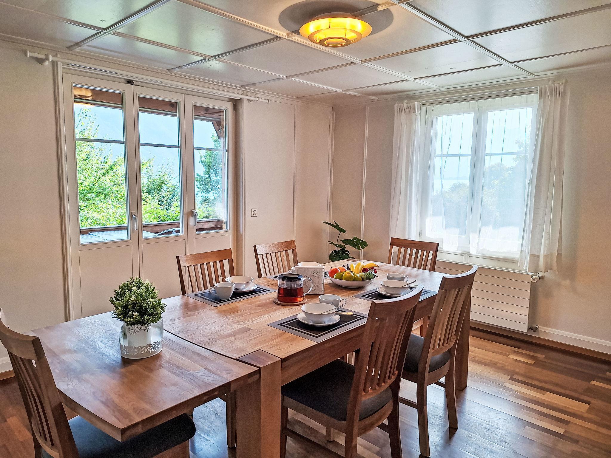 "Haus am See 4B", 5-Zimmer-Chalet auf 3 Stockwerken. Geräumig und hell, sehr komfortabel und gemütlich eingerichtet: Wohnzimmer mit Schwedenofen und Kabel-TV. Ausgang zum Balkon. Esszimmer. Ausgang zum Balkon. Küche (Backofen, Geschirrspüler, 4 Glaskeramikplatten, Toaster, Wasserkocher, Mikrowelle, elektrische Kaffeemaschine). Sep. WC. Obergeschoss: 2 Zimmer, jedes Zimmer mit 1 Bett (90 cm, Länge 200 cm). 1 grosses Doppelzimmer mit 1 Doppelbett (180 cm, Länge 200 cm). Ausgang zum Balkon. Bad/Dusche/WC, Doppelwaschbecken. 2 Balkone, Südlage Balkon, Westlage. Herrliche Sicht auf den See, die Berge und die Landschaft. Zur Verfügung: Haartrockner. Internet (WLAN). Bitte beachten: Nichtraucher-Haus. Rauchmelder, Feuerlöscher. Grundstück liegt direkt am See, nicht eingezäunt.