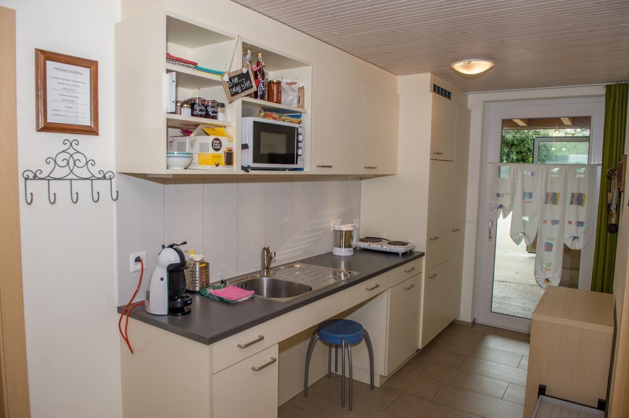 Die Wohnung ist hindernisfrei und mit einem Doppelbett-Schlafzimmer ausgestattet, das über ein eigenes Bad verfügt. Für die kleinsten Gäste steht ein Kinderbett zur Verfügung. Zusätzlich bieten wir einen Aufenthaltsraum mit Verpflegungsmöglichkeiten, der Ihnen während Ihres Aufenthalts zur freien Verfügung steht. Dieser Raum bietet einen direkten Ausgang zum Gartensitzplatz, sodass Sie die Natur ganz unmittelbar genießen können.