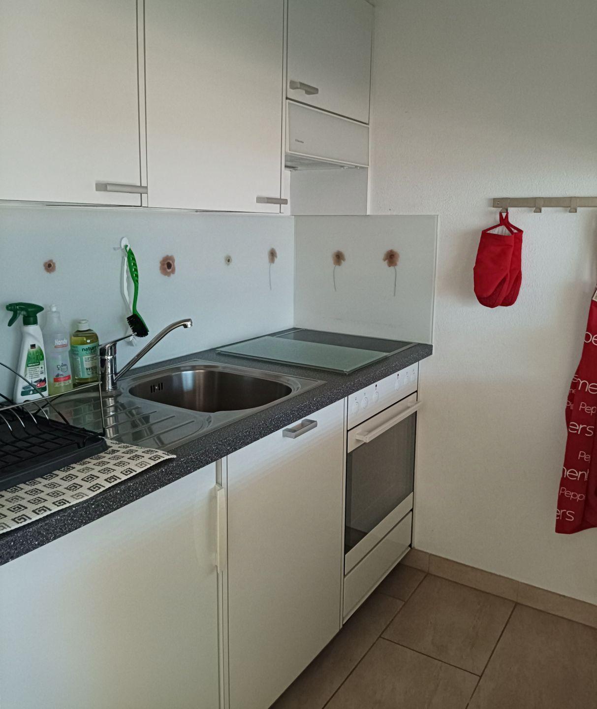Küche mit Glaskeramik Herd, Backofen, Kühlschrank, Nespressomaschine.