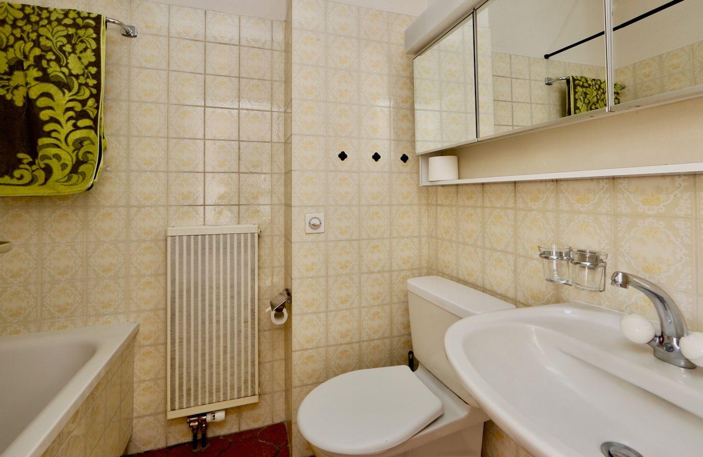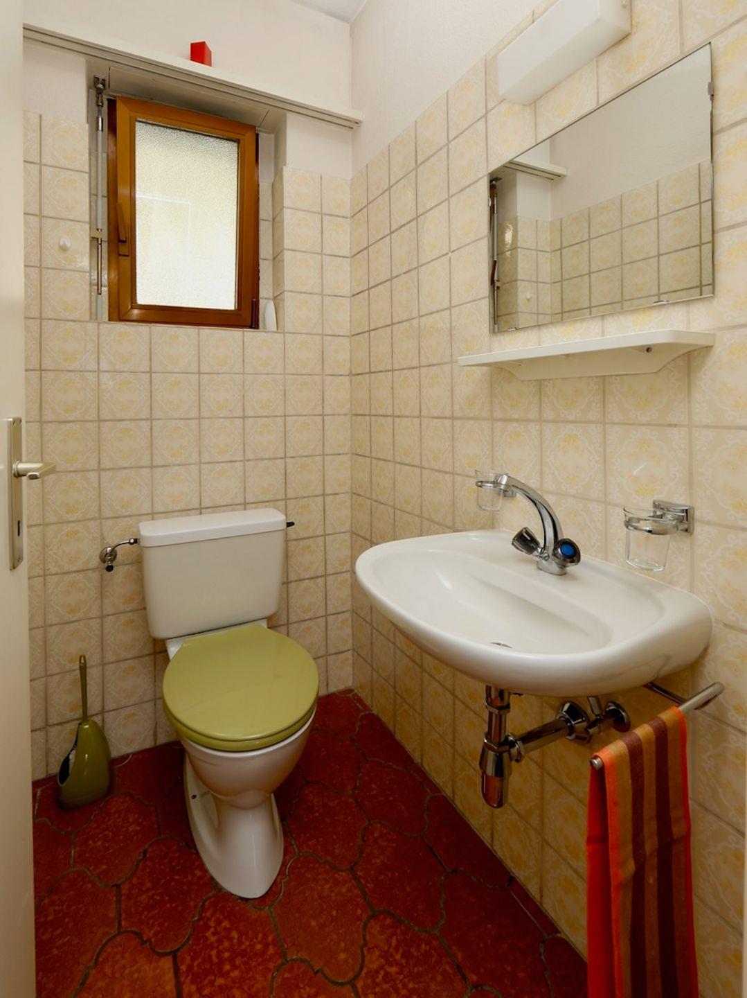 Badezimmer mit Badewanne/Dusche, Waschbecken, Haartrockner, separates WC.