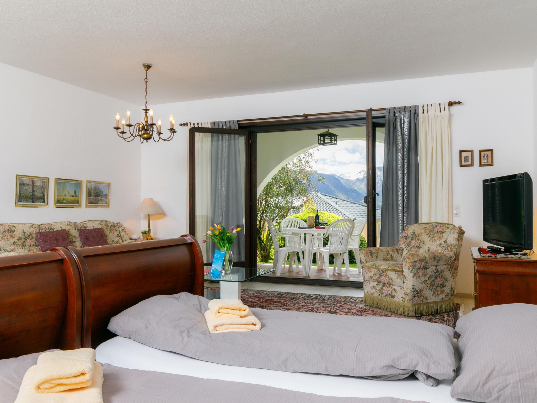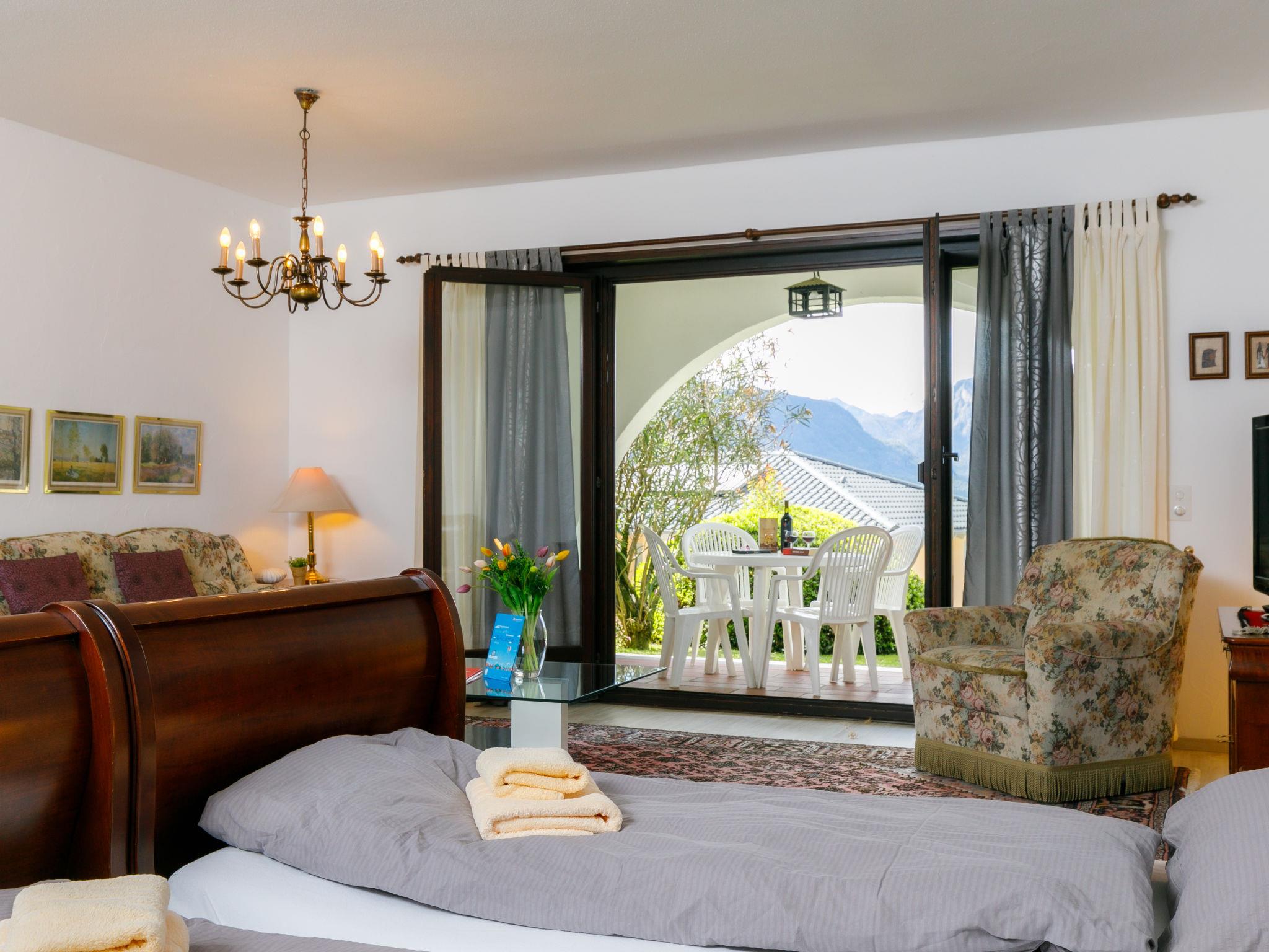 "Residence Miralago Apt. C23", 1-Zimmer-Wohnung 65 m2, im Erdgeschoss, Südwestlage. Geräumig, komfortabel und rustikal eingerichtet: offenes Wohn-/Schlafzimmer mit 2 Betten (90 cm, Länge 200 cm), Kabel-TV, Flachbildschirm und Radio. Ausgang zur Terrasse. Kleine, offene Küche im Eingang (4 Kochplatten, Backofen). Bad/WC. Gartensitzplatz teilweise überdacht, Westlage und Südlage. Terrassenmöbel, Liegestühle (2). Sehr schöne Sicht auf den See, die Berge und die Landschaft. Bitte beachten: Nichtraucher-Unterkunft. NL-00003593