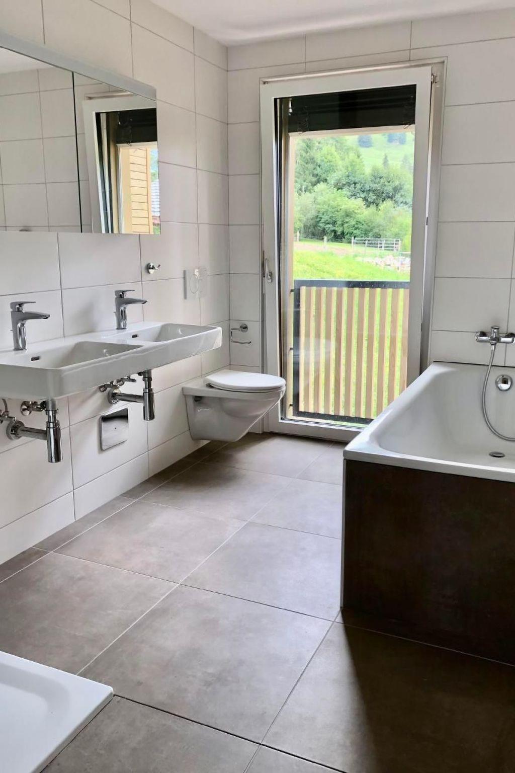 Die Wohnung hat 2 Badezimmer, je mit Dusche/WC und Haarföhn. Das grössere Badezimmer mit Doppellavabo, Dusche und Badewanne.
