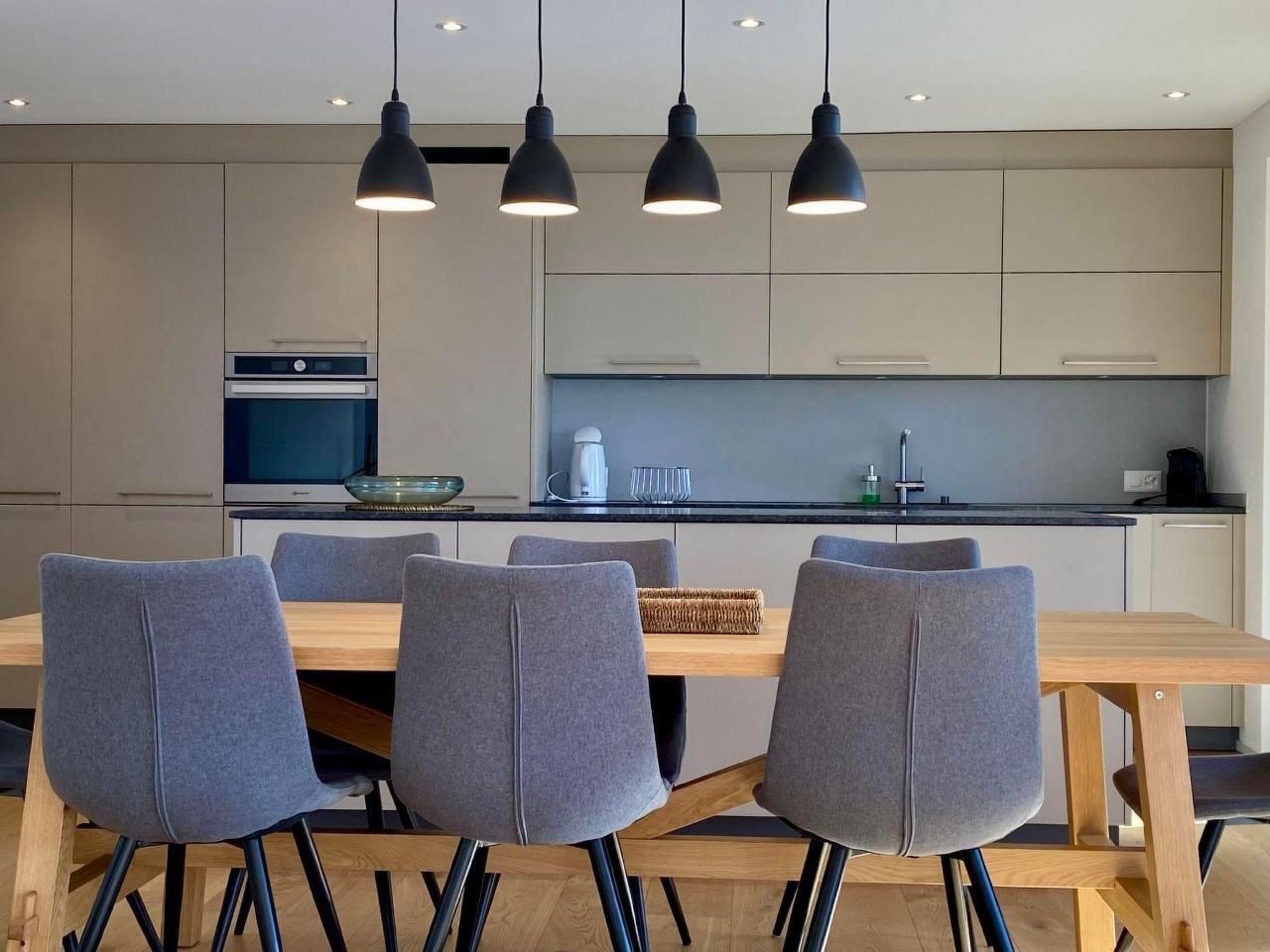 Die offene Küche mit Kochinsel ist modern und voll ausgestattet.