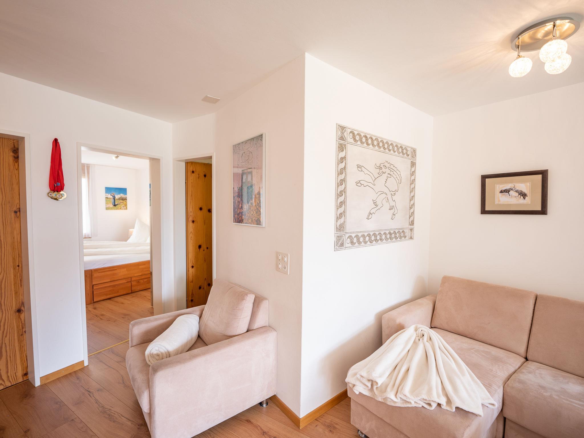 "Chesa Piz Cotschen 3", 2-Zimmer-Wohnung 60 m2 im 1. Stock. Hell, modern und gemütlich eingerichtet: Wohn-/Esszimmer mit Esstisch und TV (Flachbildschirm). Ausgang zur Loggia. 1 Doppelzimmer mit 1 Doppelbett (2 x 90 cm, Länge 200 cm). Offene Küche (Backofen, Geschirrspüler, 4 Glaskeramikplatten, Toaster, Wasserkocher, elektrische Kaffeemaschine, Kapseln für die Kaffeemaschine (Delizio Migros) extra, Racletteofen, Fondue Set (Käse)). Dusche/WC. Holzdielenboden. Balkonmöbel. Schöne Sicht auf die Berge und die Landschaft. Zur Verfügung: Babybett (extra), Haartrockner. Internet (Wireless LAN, gratis). Garage Nr. DIEAG (50m), Höhe 200 cm, Breite 220 cm. Bitte beachten: Nichtraucher-Unterkunft, Nichtraucher-Haus. Maximal 1 Haustier/Hund erlaubt.