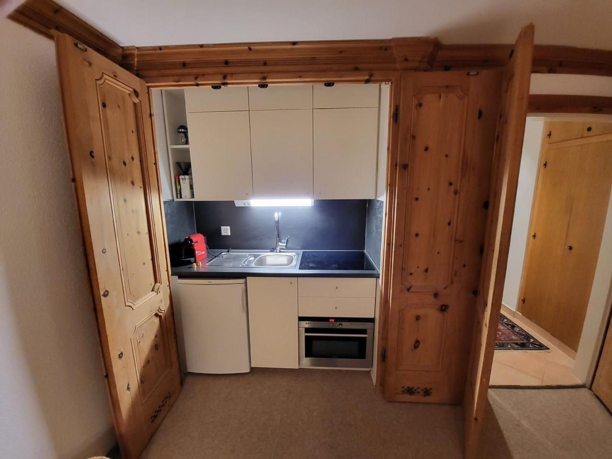 Sonstige Wohnzimmerausstattung (Wohnzimmer1): Es handelt sich um ein Wohn-Schlafzimmer. Die linke Wand des Zimmers ist in hochwertiger Schreinerarbeit mit versteckten Klappbetten gestaltet. Hinter der Vertäfelung befinden sich rechts und links je ein Einbauschrank, in der Mitte zwei einzel herausklappbare Betten, dahinter eingebaute Regale und Beleuchtung. An der Wand gegenüber, neben dem Fenster zum Garten eine Eckbank in Arvenholz mit viereckigem Esstisch und zwei zusätzlichen Stühlen. Im Eck ein kleines, eingebautes Schränkchen für Gläser, Fonduegeschirr etc. neben dem Fenster eine Tür auf den Balkon mit direkten Übergang zum Garten (kann mitbenutzt werden). gegenüber der Eckbank, verborgen hinter einer aufklappbaren Arvenholztürkonstruktion eine vollständige, kleine Einbauküche.Weiterhin vorhanden ein kleines Schränkchen mit Fernseher und Stereoanlage. Internet und SwisscomTV über DSL.