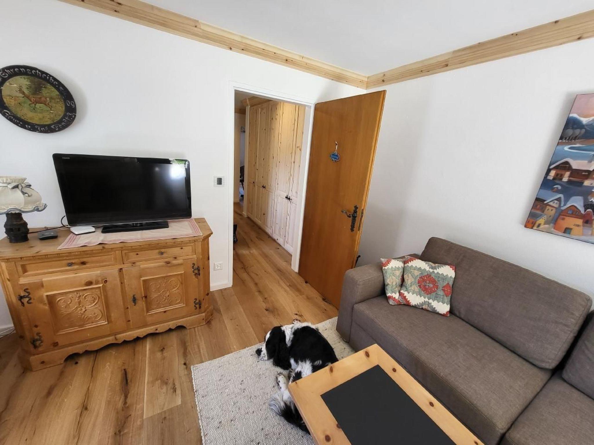 Rollos vor allen Fenstern und Türen in der Wohnung. Herrliche Aussicht nach Corviglia. Das Wohnzimmer ist sehr hell und sonnig. Das Wild aus dem nahen Wald oberhalb des Hauses kommt im Winter bis auf die Terrasse vor dem Wohnzimmer.