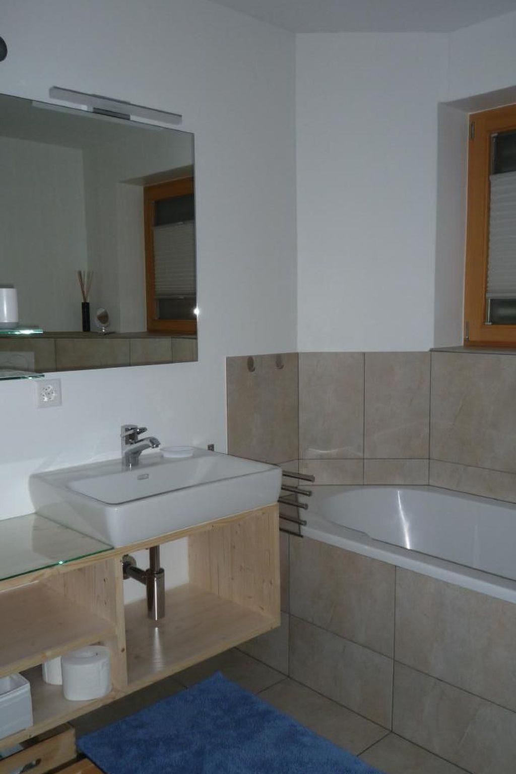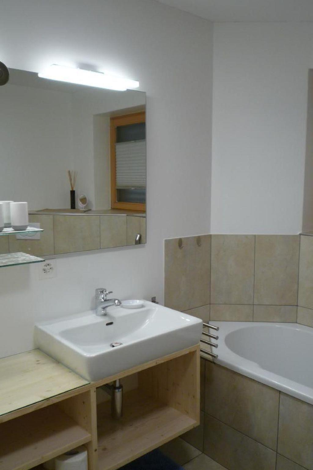 Badezimmer: Eine Nasszelle mit Badewanne, sep. Dusche, grosses Lavabo, WC und vielen Ablagemöglichkeiten und separates WC mit Lavabo.