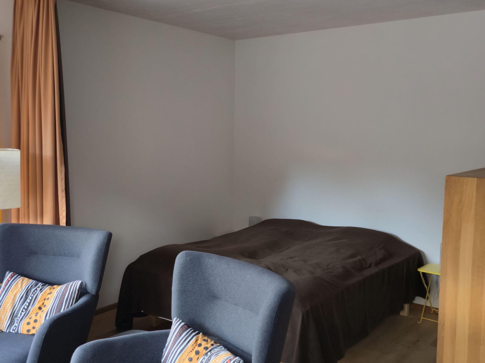Im Inneren wartet das Studio mit einem äußerst angenehmen Wohnraum auf, der sich durch ein praktisches Doppelbett (160cm), welches mit einem Vorhang für Privatsphäre abgetrennt werden kann, und bequeme Sessel auszeichnet. Zu den Annehmlichkeiten gehören Fernseh/Radio/WiFi und ein hochwertiger Parkettboden. Die offene Küche ist komplett ausgestattet mit einer Nespressomaschine (die Kapseln sind im lokalen Coop erhältlich), einer Bialetti Kaffeemaschine, einem Toaster, einem Wasserkocher und einem Mixer. Das Badezimmer verfügt über eine Kombination aus Badewanne und Dusche sowie ein Fenster, das Tageslicht hereinlässt.