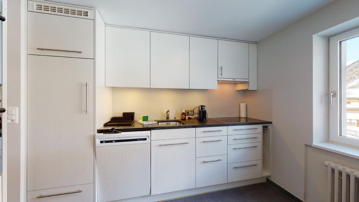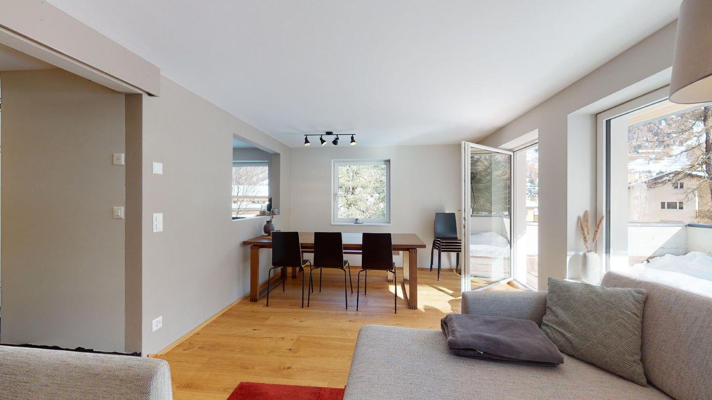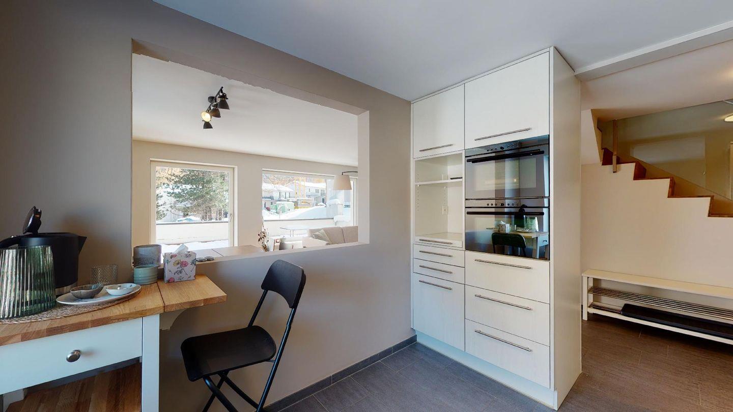 Im 2020 renovierte 5½-Zimmer Wohnung (106m2) im 1. Stock, auf zwei Etagen verteilt. 1. Stock: Halboffene Küche mit Kühlschrank, Herd, Ofen, Geschirrspüler, Chicco d'Oro Kaffeemaschine und grosser Durchreiche zum Esstisch. Wohn-/ Esszimmer mit grossem Esstisch, Sofa und Balkon. Ein Schlafzimmer/TV-Zimmer mit Doppelbett, Sofa, Smart-TV (bitte eigene Netflix und Amazon Logindaten mitbringen) und eigenem Badezimmer. Ein Gäste-WC.